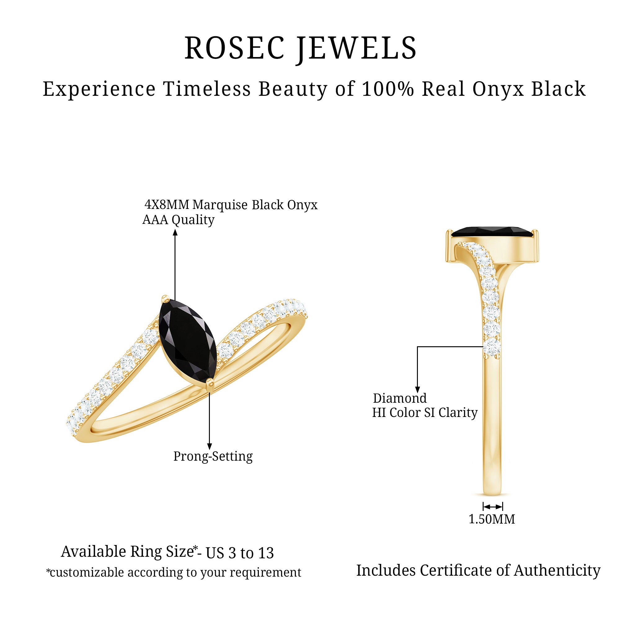 Designed with elegance and charm, this luxurious enchanted Solitaire Promise Ring captivates all who see it, showcasing a brilliant sparkle that could rival even a true loves kiss. This Solitaire Bypass Ring features a 4X8mm marquise cut Black Onyx, gracefully set in a prong arrangement with a tilted design. The distinctive aspect of this Tilted Ring is its bypass shank, embellished with small round Diamond stones. A piece of such exceptional craftsmanship and dazzling brilliance is sure to make your princess heart flutter. The sleek and minimalist bypass shank gently curves to embrace the luminous heart, merging classic elegance with a contemporary silhouette that not only provides a modern look but also safeguards the stone, making this Commitment Ring ideal for daily wear. Meticulously handcrafted, this Pre Engagement Ring is available in a range of high-quality metal purity options and colors. Furthermore, it comes in US standard sizes from 3 to 13, ensuring a perfect fit for every hand. Whether for a proposal, an anniversary, or a significant moment shared between the two of you, this Black Onyx Solitaire Ring is a timeless memento that she will cherish for a lifetime. A classic design intended to evoke feelings — just as yours did when you found your soulmate.