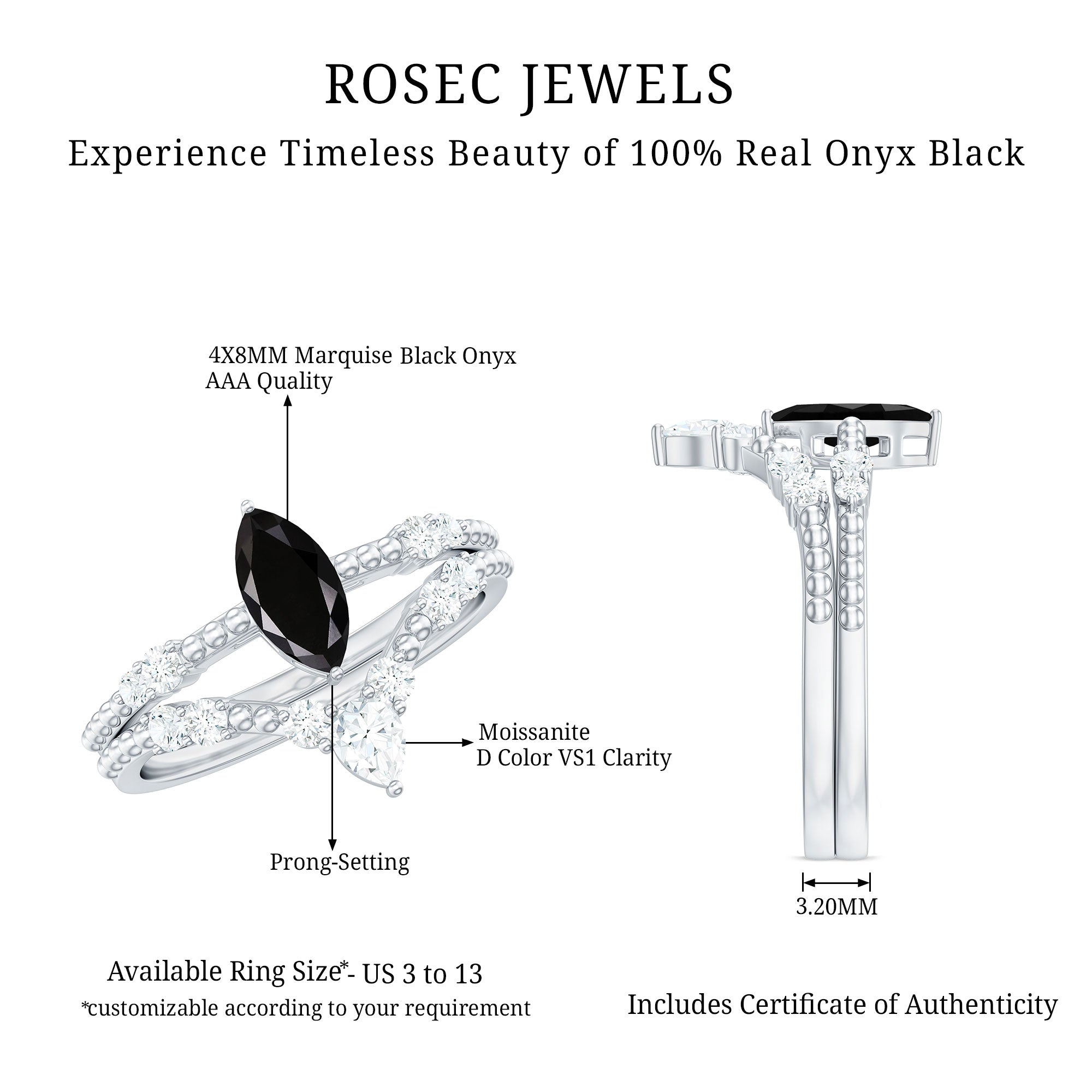 4x8mm Marquise Cut Black Onyx Solitaire Ring Set with Moissanite Band