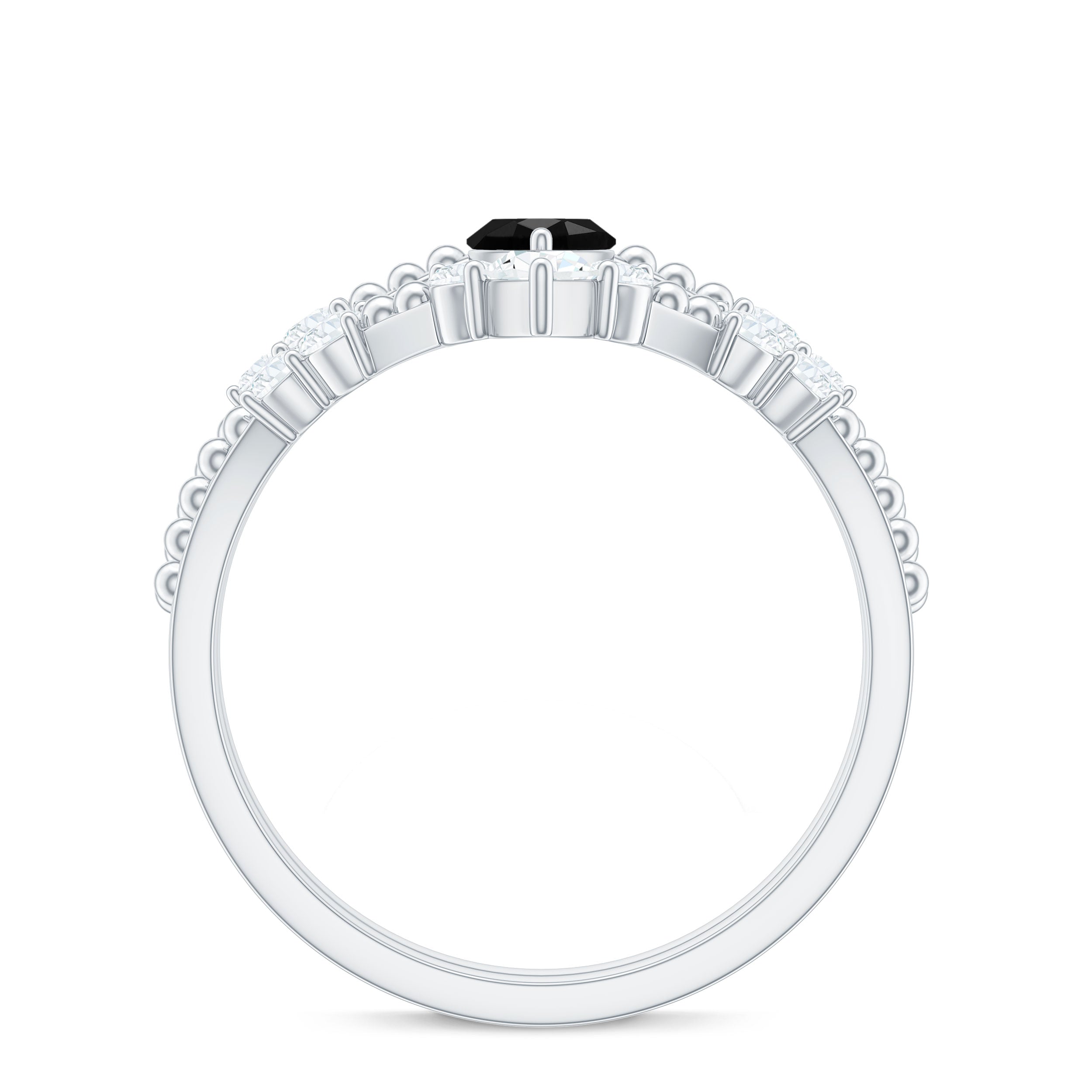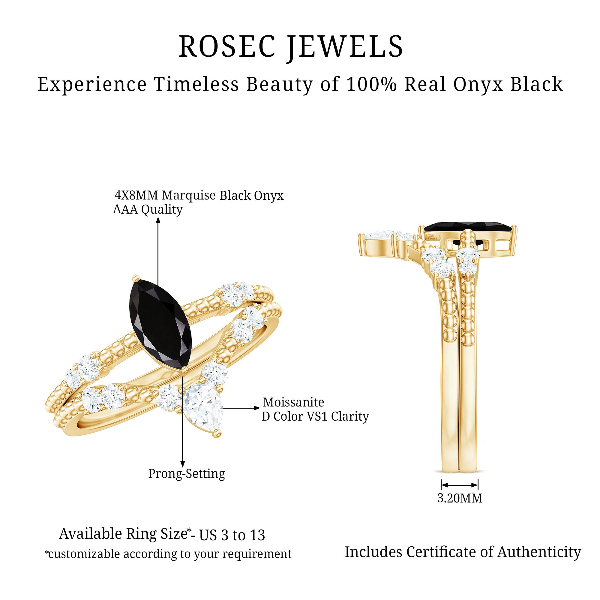 Crafted sophistically by experts is this beautiful Solitaire Ring Set is a perfect way to express love. Having two rings, one Solitaire Ring featuring 4X8 mm marquise cut Black Onyx set at the center as solitaire in a prong setting moissanite accents set on both side, and another is curved wedding band embellished with pear and round shape moissanites. The engagement ring is seamlessly complemented by a sleek chevron wedding band, designed in a gentle V-shape that embraces the solitaire ring with elegance. Collectively, the rings create a distinctive and refined Marquise Wedding Ring Set that embodies both minimalism and significance. Black onyx is a gemstone thought to provide various metaphysical advantages, such as shielding against negative energy, enhancing strength, confidence, and self-discipline, as well as fostering emotional and mental stability. Whether intended for a proposal, wedding day, or a special occasion, this Engagement Ring with Wedding Band is crafted to commemorate the moment with elegance and beauty. Meticulously designed with a focus on every detail, the set offers a modern interpretation of classic design, perfect for the bride who values simplicity yet desires something that truly stands out.