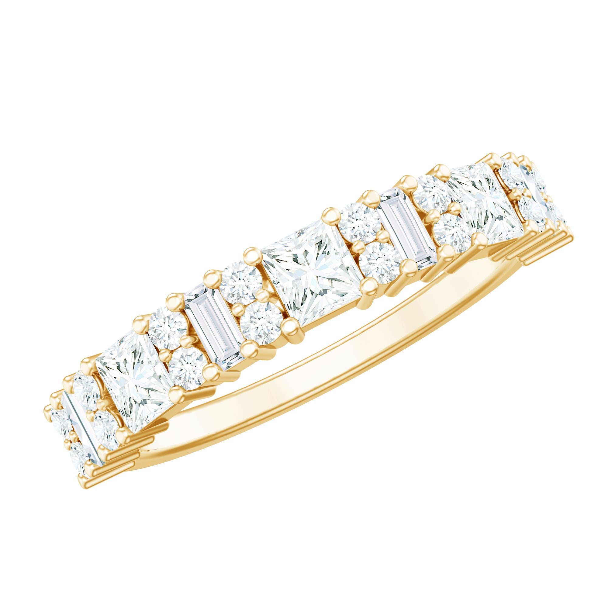 Show your lady love how special she is by gifting her this stunning Half Moissanite Eternity Band Ring. The ring is adorned with dazzling Round, Baguette, and Princess Cut Moissanite stones, set in a shared prong setting that covers the entire band.