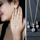 Achieve a fashionable and sophisticated look with this Pendant Earrings Set featuring a stunning 3 Stone design, adorned with Round Brilliant Moissanite gemstones. The exquisite design and impeccable craftsmanship of this Jewelry Set will elevate your style and make you stand out in any crowd. The shimmering Moissanite gemstones add a touch of elegance and glamour to this already stunning piece. This Moissanite Pendant Set is a perfect accessory for any occasion, whether its a formal event or a night out with friends. Add a touch of luxury and sophistication to your wardrobe with this exquisite Three Stone Jewelry Set.