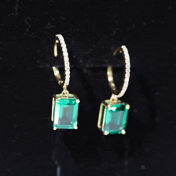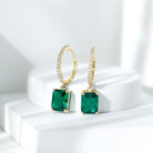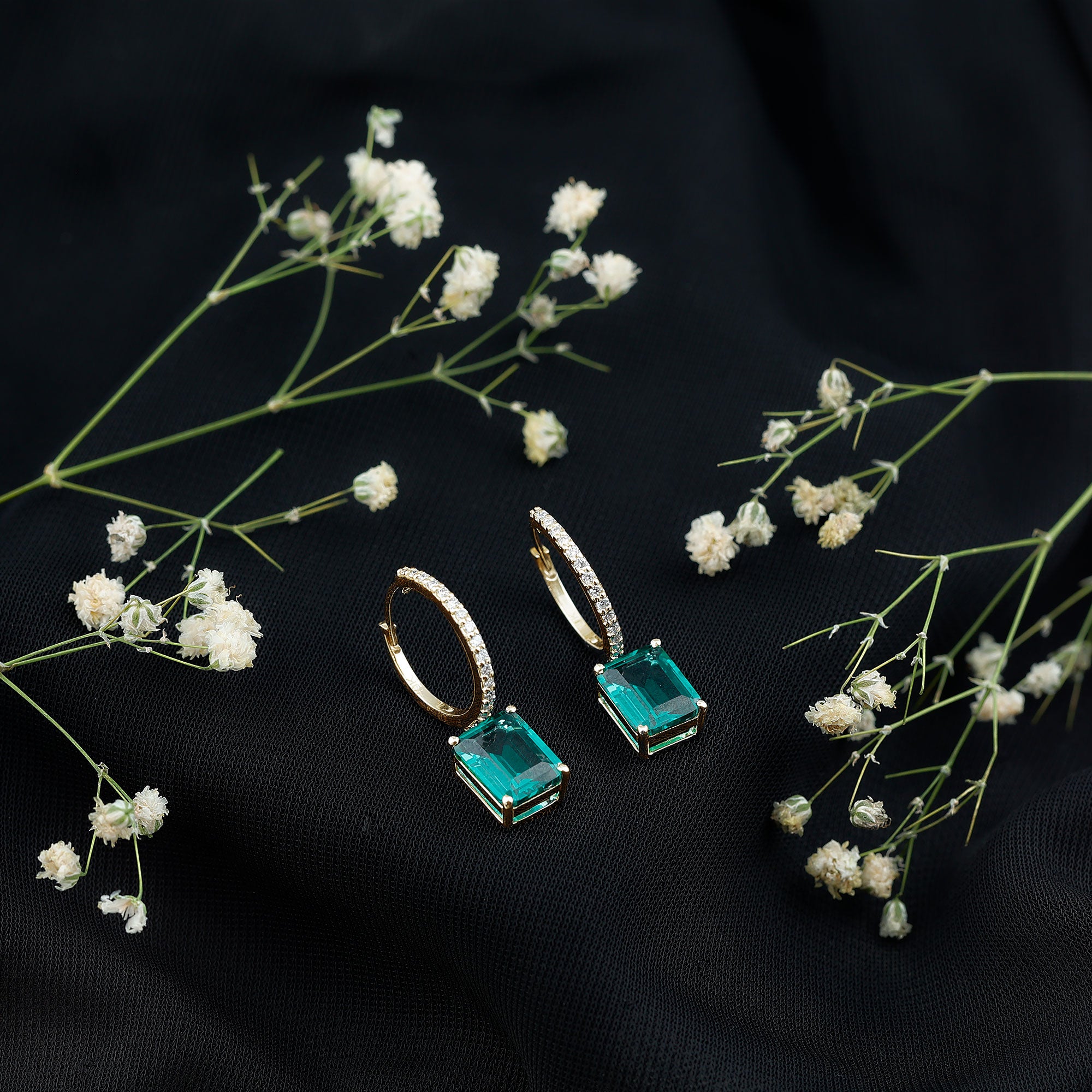 Bright color and soft sparkle come together beautifully in these Lab Grown Emerald Earrings, giving you a look that is graceful. Each earring features a glowing emerald cut lab emerald in a 7X9 MM size. The emerald drops hang from small and comfortable huggie hoops. Along the hoops, tiny diamonds add a light sparkle that gently complements the rich green below. Whether you are dressing up for a special evening or keeping it simple with daily outfits, these Emerald and Diamond Earrings bring just the right amount of charm. Crafted with high-quality materials, the lab created emeralds offer bright color and clarity, while the diamonds give a soft shine without taking attention away from the main stone. The design of these Emerald Hoop Earrings is simple but still makes a statement. Perfect for gifts or as a treat for yourself, these Emerald Drop Earrings bring a touch of elegance to any jewelry collection. With their modern style and timeless color, they are a piece you will reach for again and again.