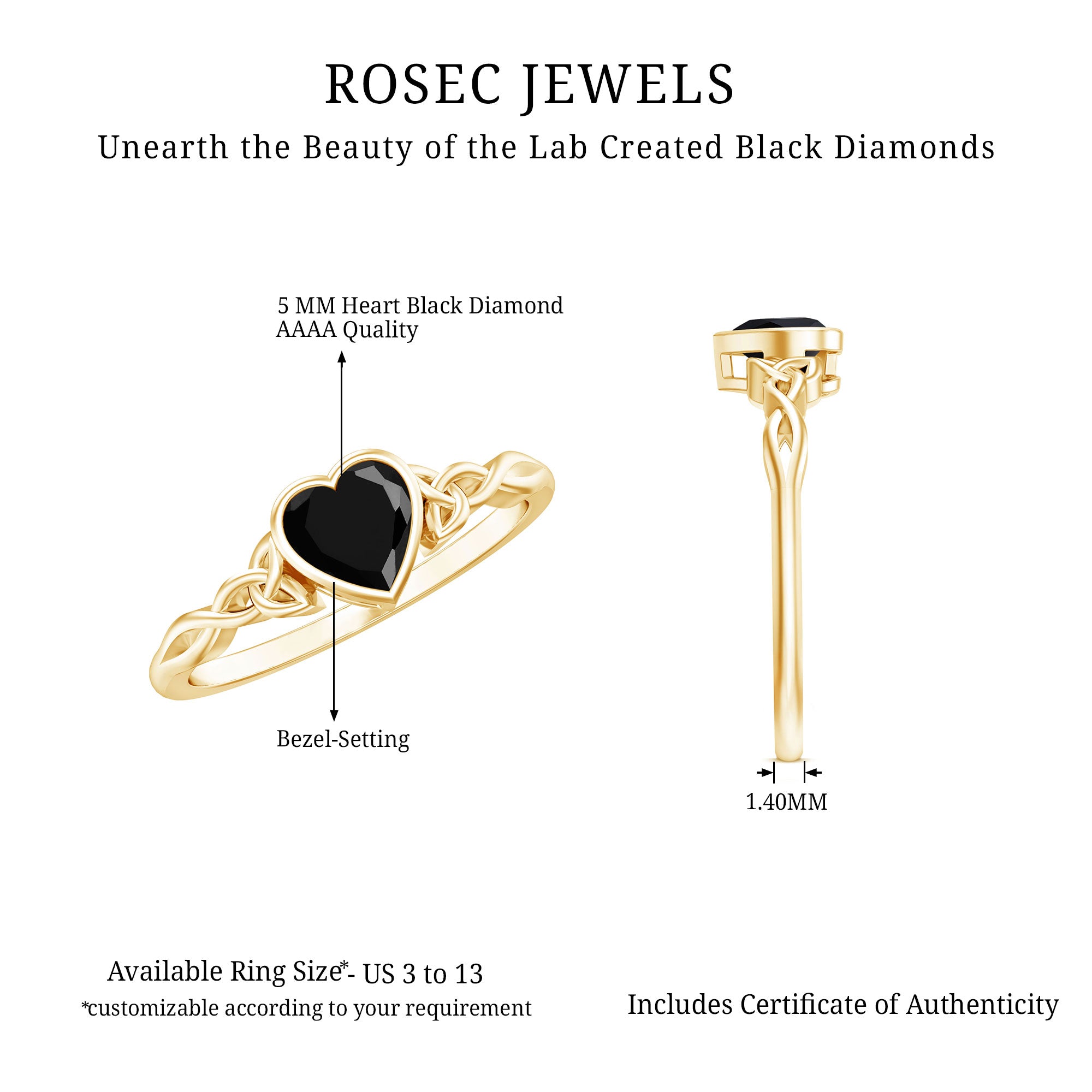 This Celtic Ring features with Round Shape Lab Created Black Diamond as Solitaire in Bezel Setting. Crafted in Solid Gold on Solitaire Rings for Women. A perfect Engagement Ring for your beloved.
