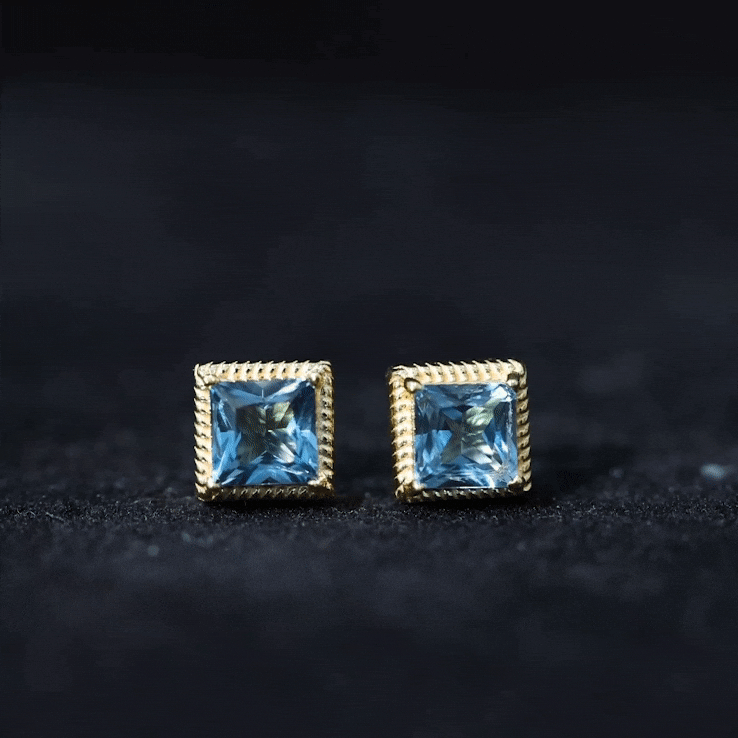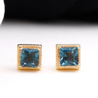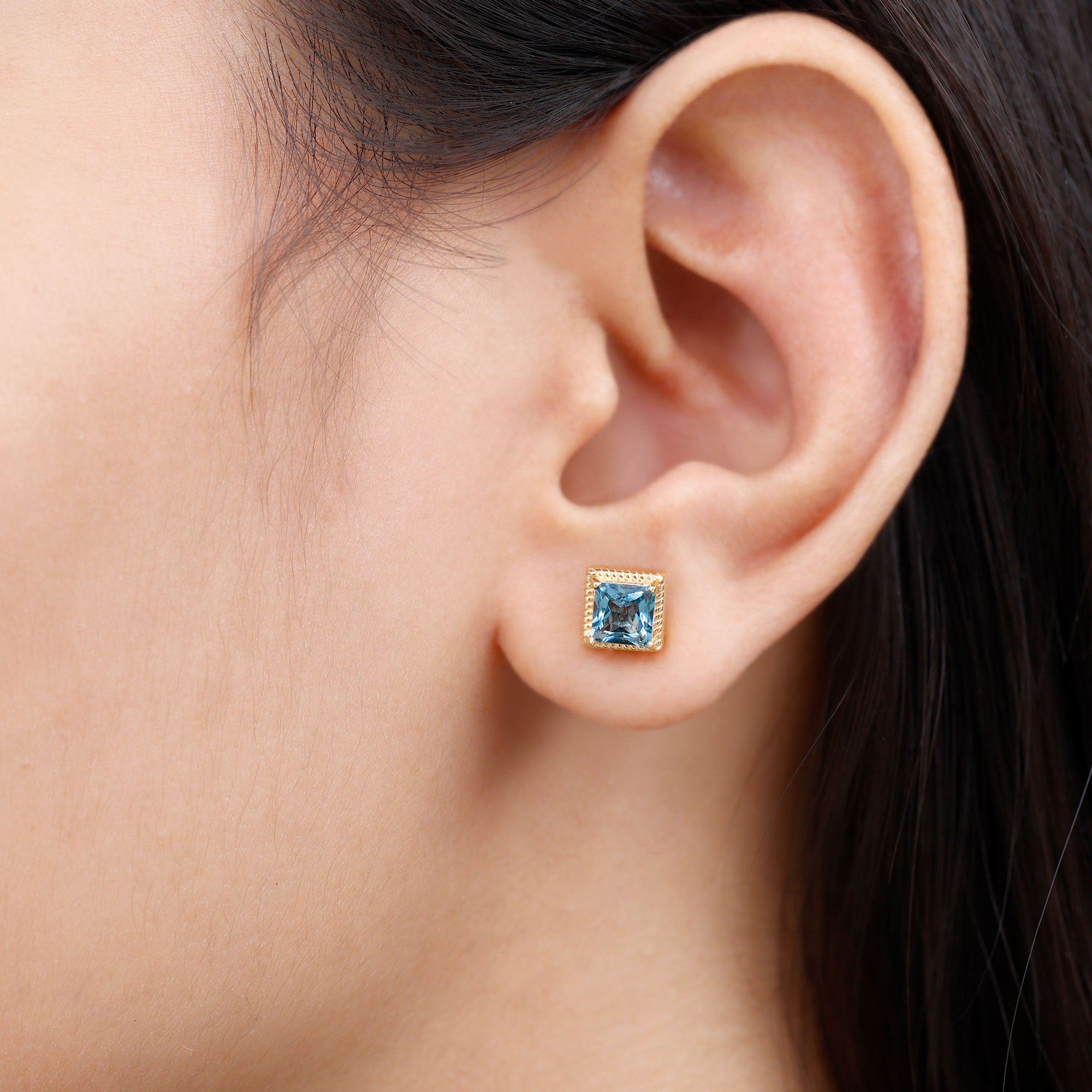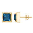 Mesmerizing these Beautiful Stud Earrings is embellished with Princess Cut London Blue Topaz set in Rope Setting. This Gold Twisted Rope Earring is Composed in Solid Gold.