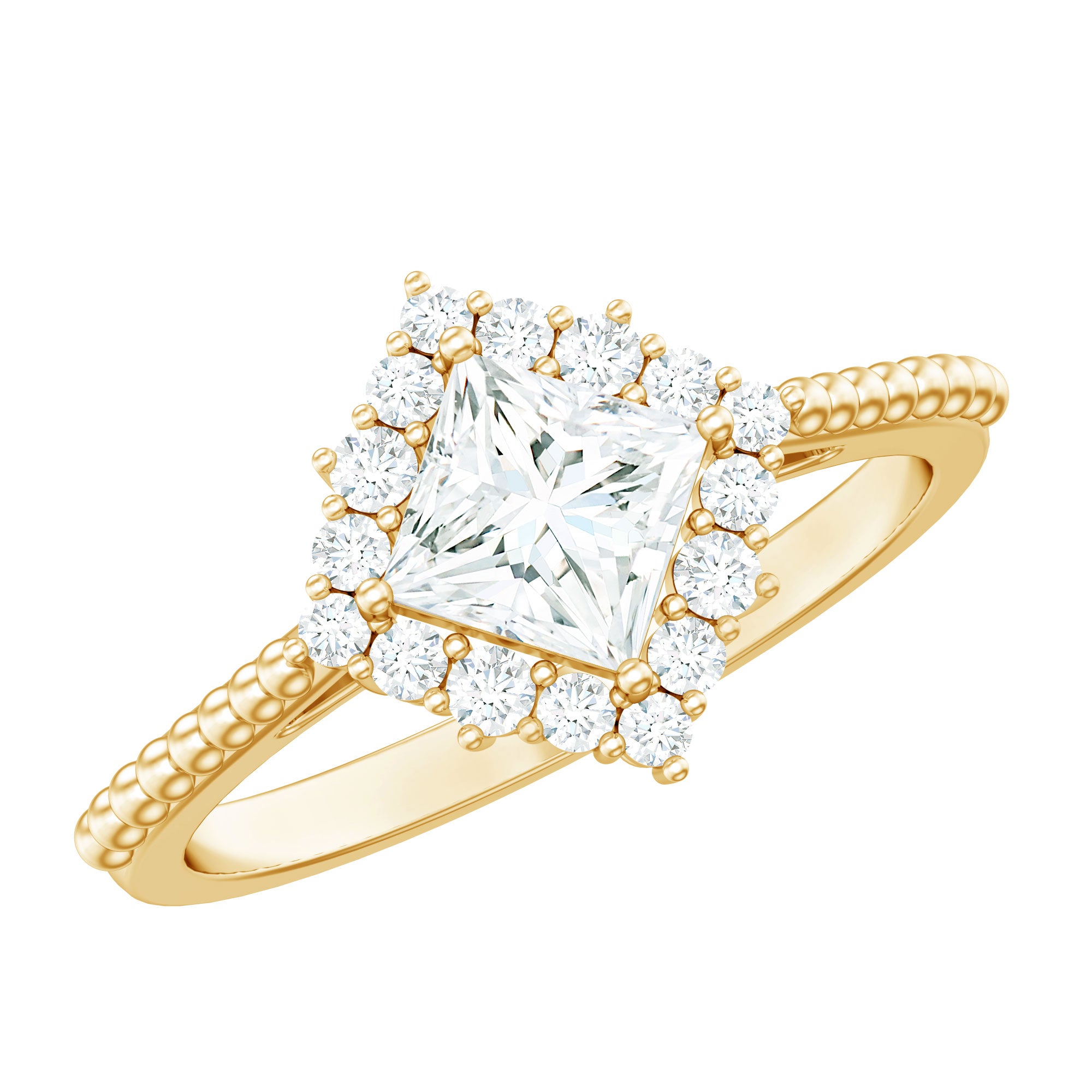 True love is expressed in many ways, and a carefully selected ring for your big day is one of the best ways of doing it. This outstanding Moissanite Halo Ring featuring 5 mm tilted Princess Cut Moissanite surrounded by tiny round shape moissanites, enhancing the sparkle of the center stone. This Halo Engagement Ring has beaded embellished shank, which give this piece an antique look. Moissanite has exceptional chemical, physical, and optical properties that closely resemble those of a diamond, giving this ring a brilliant sparkle and radiant look she’s sure to adore. Crafted with meticulous attention to detail, this Moissanite Square Ring is a symbol of strength, unity, and enduring love. Its soft yet daring look makes this Halo Engagement Ring a standout piece that she will wear and adore for a lifetime. Designed for everyday comfort and timeless appeal, this Womens Moissanite Engagement Ring is available in US sizes 3 to 13 to ensure the perfect fit. Whether youre preparing for a heartfelt surprise or a quiet, intimate moment, it comes thoughtfully packaged in a beautiful jewelry box, ready to be treasured from the moment it’s revealed.