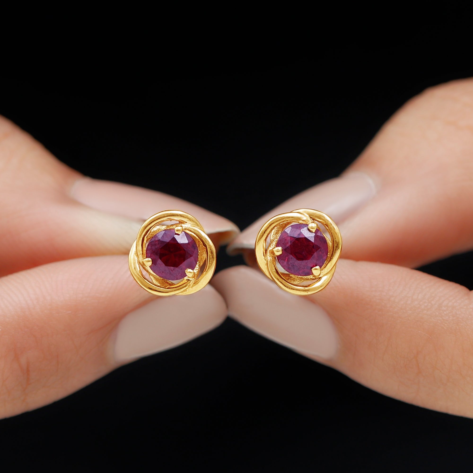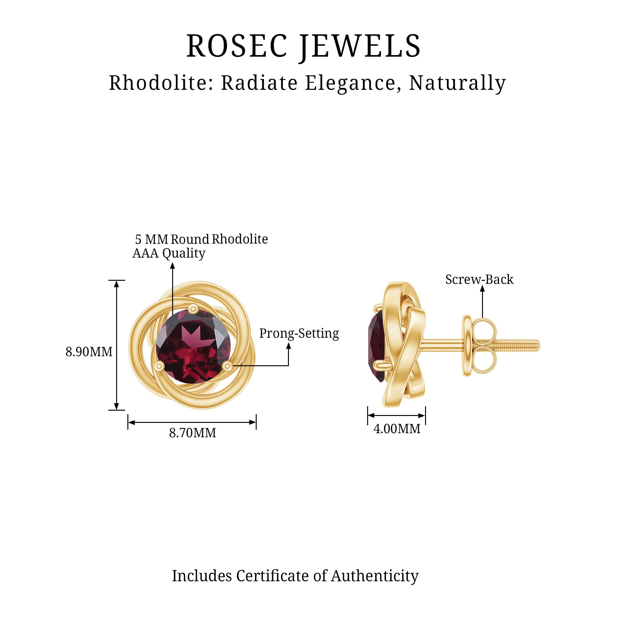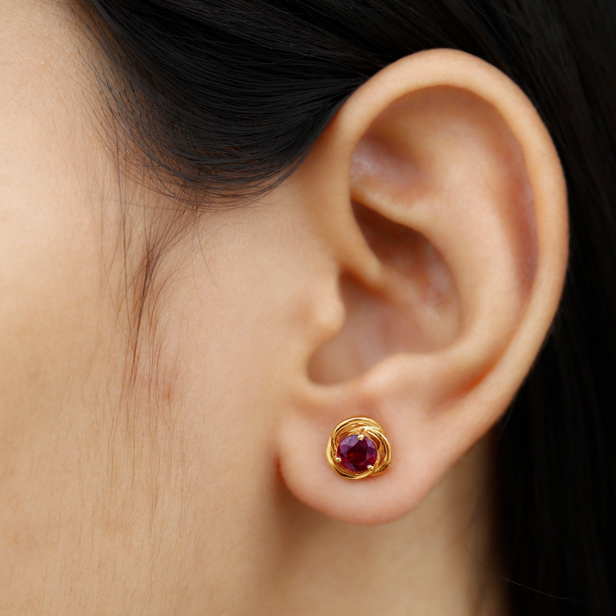 Designed with elegance, these Swirl Stud Earrings crafted in Solid Gold are Adorned with Round Cut Rhodolite Solitaire to complement your attire for special occasions.