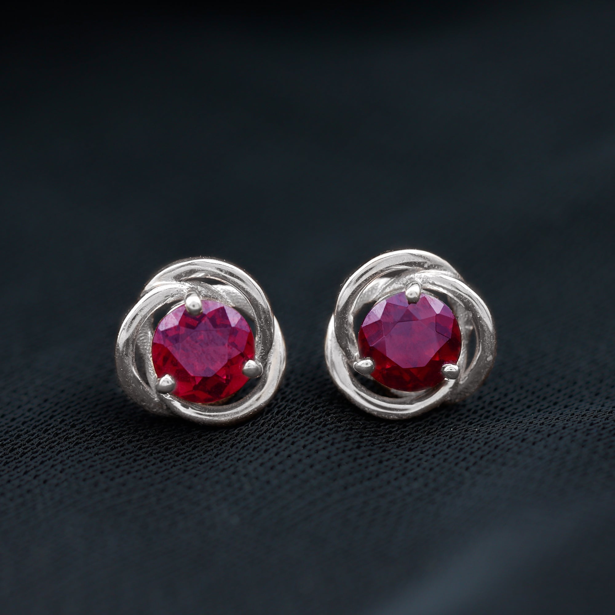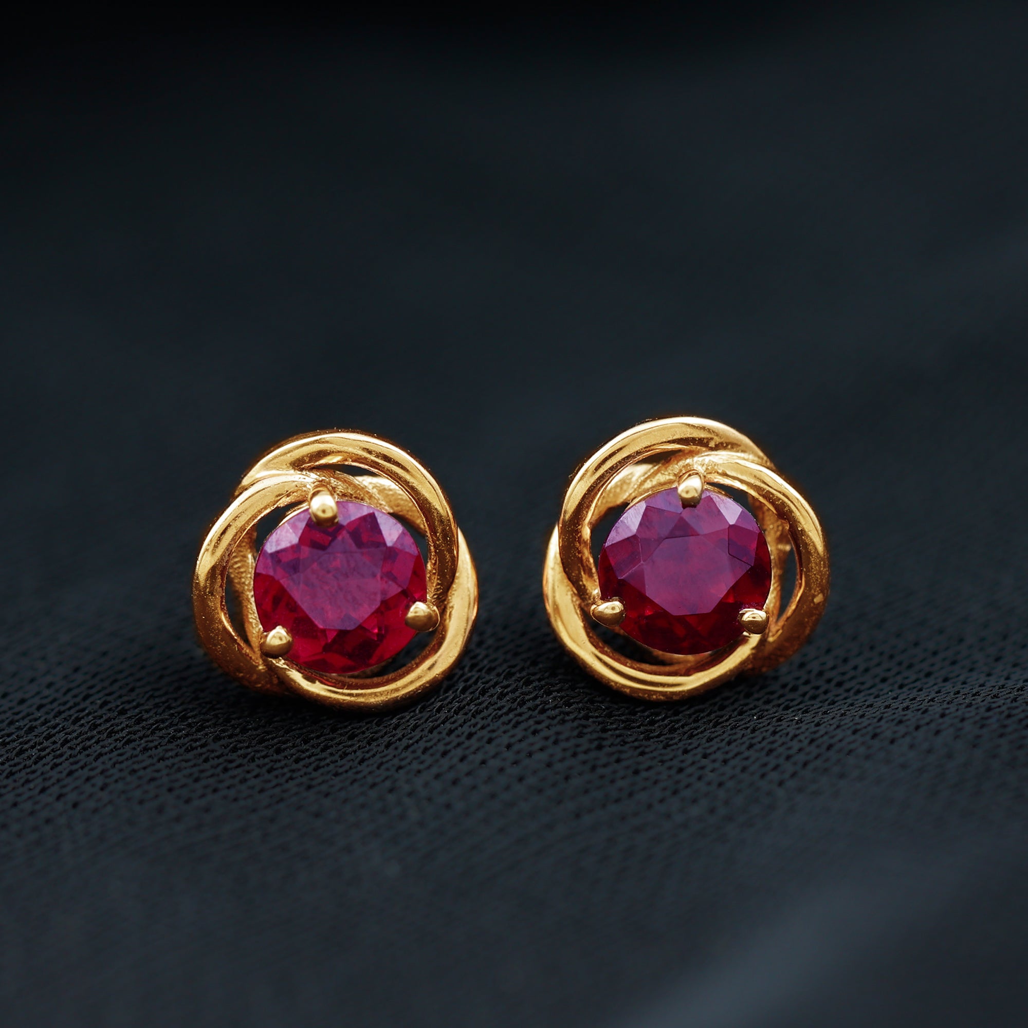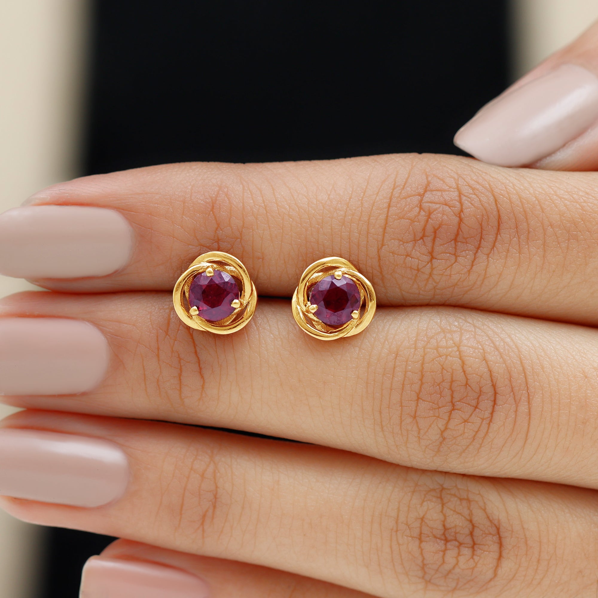 Designed with elegance, these Swirl Stud Earrings crafted in Solid Gold are Adorned with Round Cut Rhodolite Solitaire to complement your attire for special occasions.