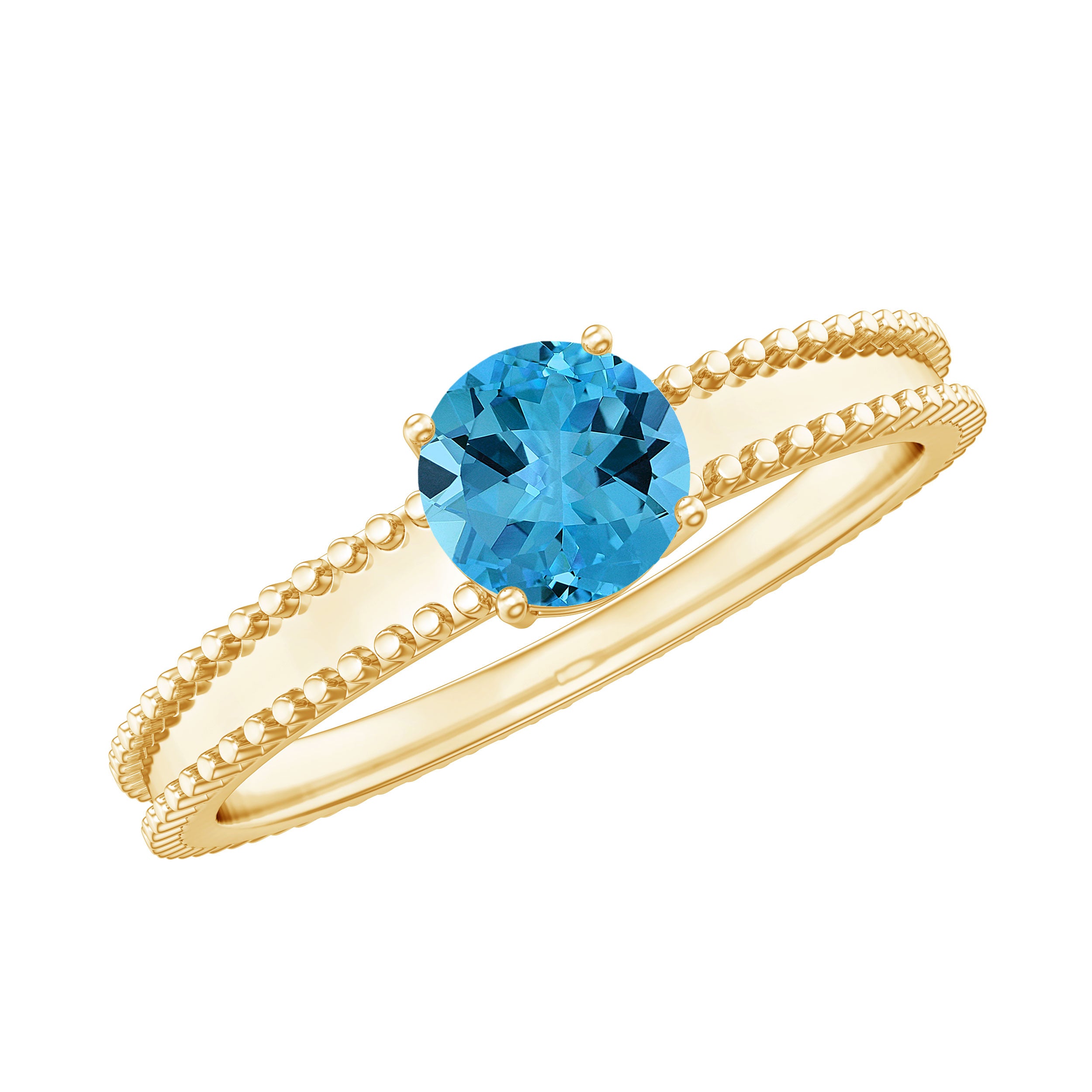 The minimal Solitaire Band Ring features a Round Shape Swiss Blue Topaz Solitaire studded at the center in prong setting while Beaded Detailing on its shank enhances its appearance. Crafted in Solid Gold, this Swiss Blue Topaz Band Ring makes a heart warming gift you should give to your better half.