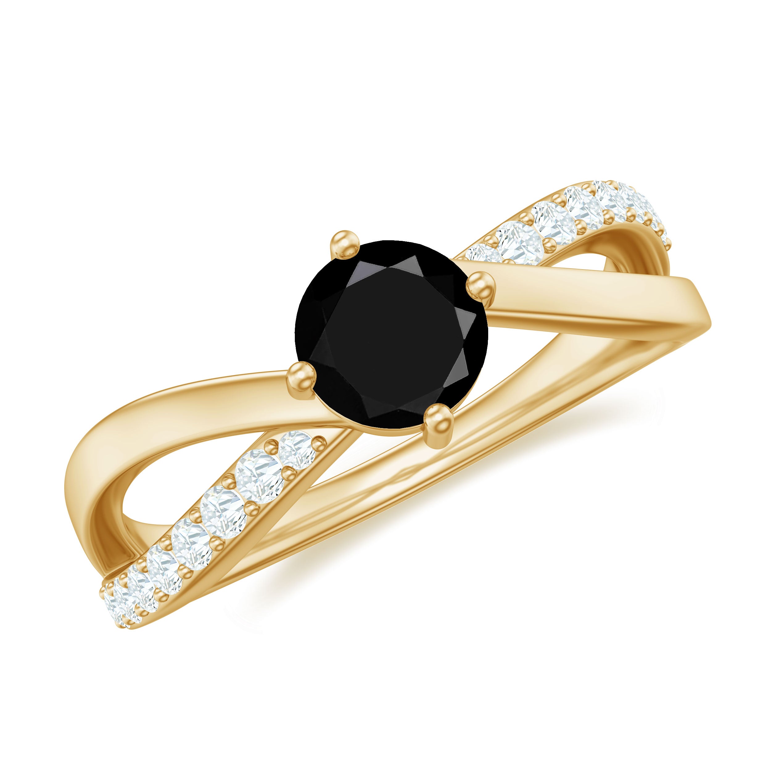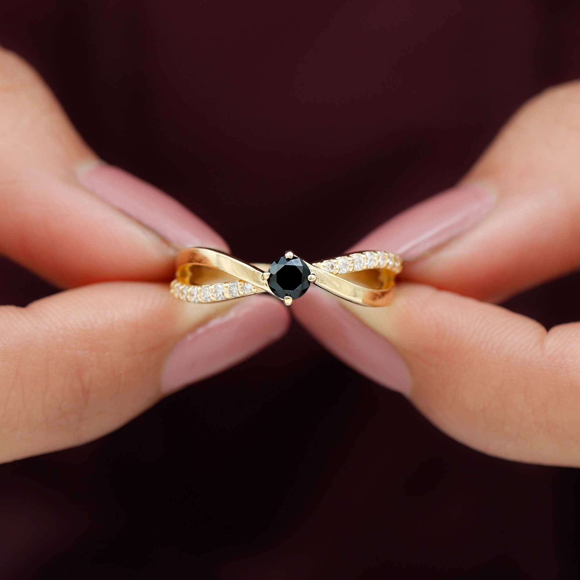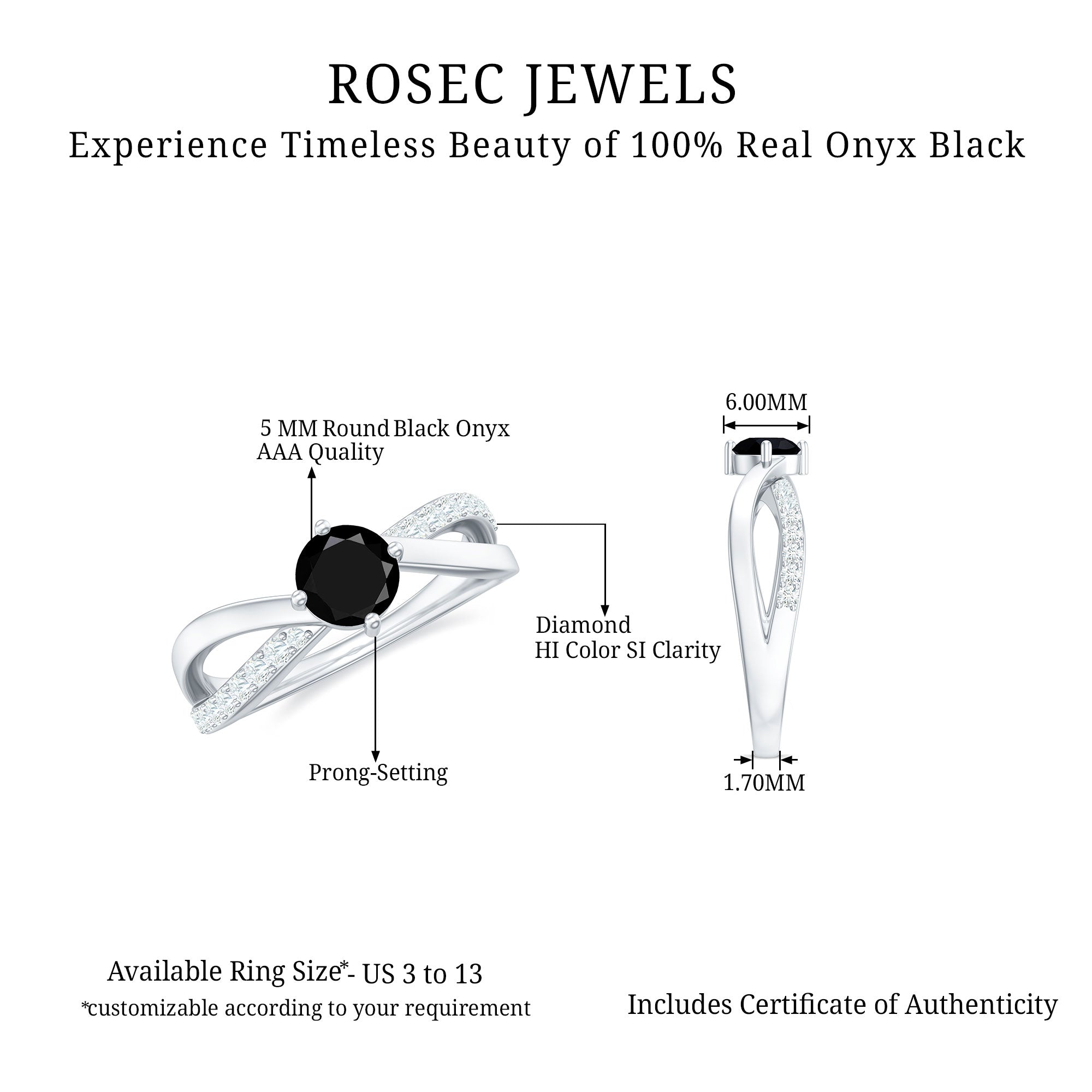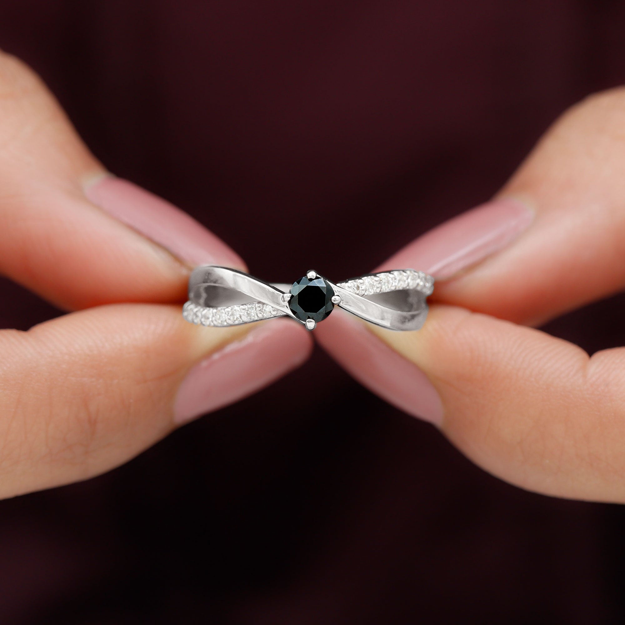 Create a striking and elegant impression with this Black Onyx Infinity Ring. Featuring 5 mm round shape Black Onyx set at the center as solitaire in a prong setting having infinity style shank embellished with round shape diamonds, making it a must have choice. Our Solitaire Engagement Ring isnt just a promise of forever; its a celebration of timeless elegance. Allow your heart to express itself in brilliance with this stunning Black Onyx Engagement Ring, a creation that elegantly embodies the spirit of love, commitment, and timeless sophistication. Crafted to transform feelings into treasured heirlooms, this Infinity Engagement Ring serves as a luminous tribute to the union of two souls. The distinctive silhouette makes a romantic impression with each glance, bold, feminine, and unforgettable. The band showcases an elegant infinity crossover shank, embellished with meticulously set round diamonds that intertwine gracefully like two paths merging into one. Representing unity and eternity, the flowing lines symbolize a connection that strengthens with each passing moment. Ideal for a proposal, an anniversary, or as a treasured symbol of commitment, this Black Onyx Ring will enchant hearts, just as yours has. Whether intended for your partner, fiancée, or as a significant gift for someone special, this Solitaire Infinity Ring articulates the essence of love in its most genuine form.