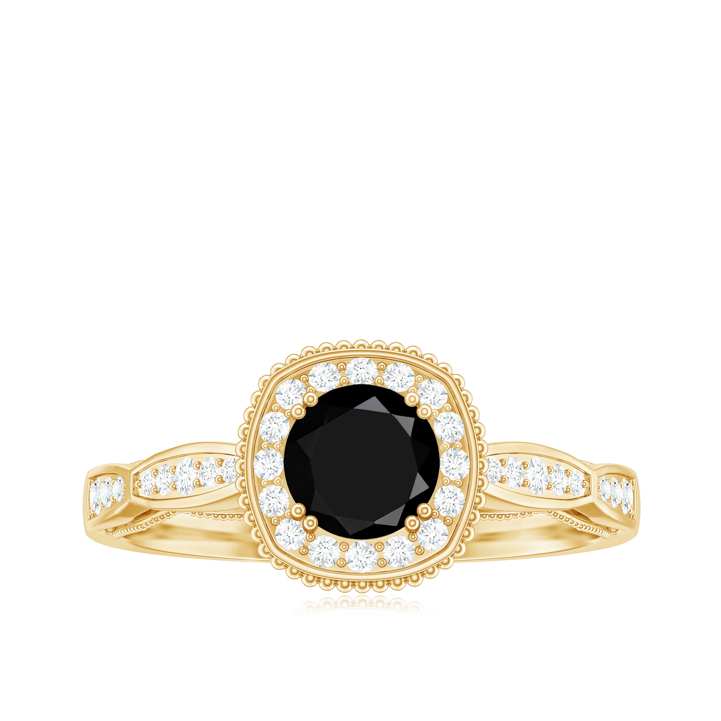 Experience the allure of timeless elegance with this exquisite Black Onyx Engagement Ring, which draws inspiration from vintage aesthetics and is designed to dazzle. At its core lies a 5MM round Black Onyx, meticulously set in a double prong setting that enables the stone to radiate brilliance from every perspective. Surrounded with round shape Diamond stones having delicate beaded details along the frame, imparting a distinctive and refined touch. Additional round diamond stones adorning the scalloped band enhances its luminosity, resulting in a soft, radiant appearance that is ideal for those who appreciate a blend of classic charm and contemporary sparkle. The design of this Halo Engagement Ring harmoniously merges traditional elegance with vintage appeal, serving as a significant emblem of love and devotion. Offered in various metal colors and purity levels, this piece can be tailored to reflect your individual style or to coordinate with other jewelry. A certificate of authenticity accompanies the Vintage Style Engagement Ring, ensuring the quality and craftsmanship of this remarkable piece. Elegant, luminous, and brimming with charm, this Antique Onyx Ring with accents encapsulates the essence of cherished moments with a style that endures.