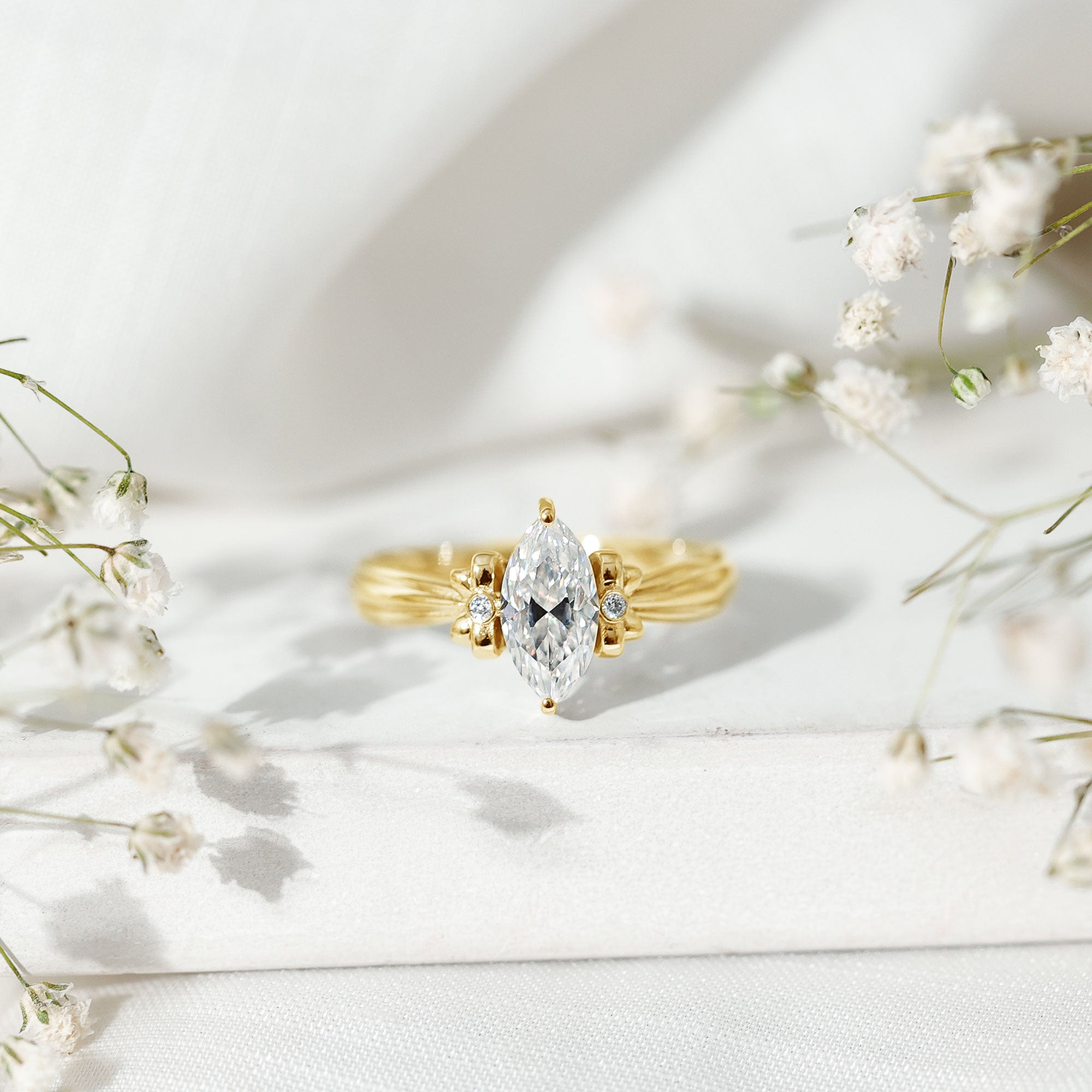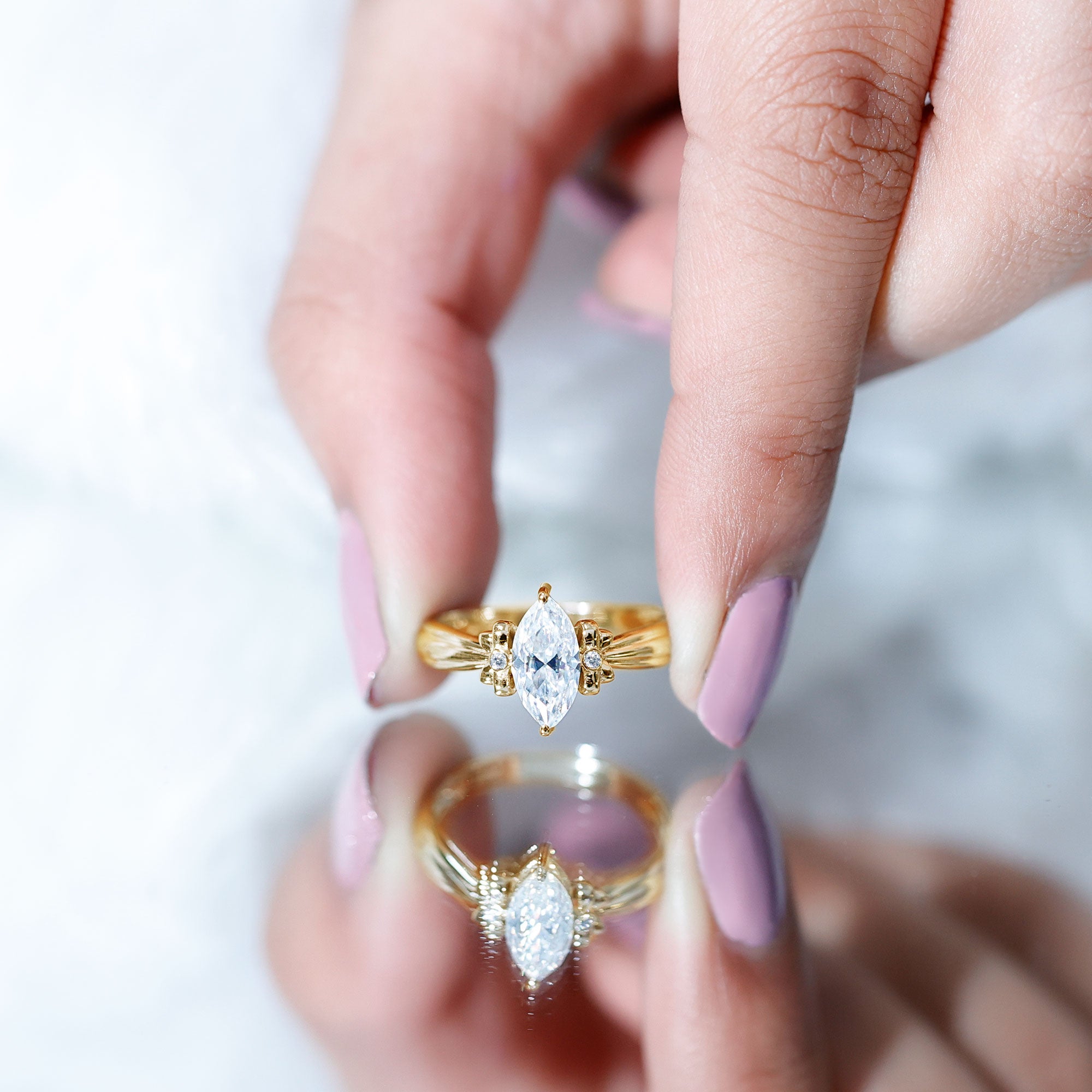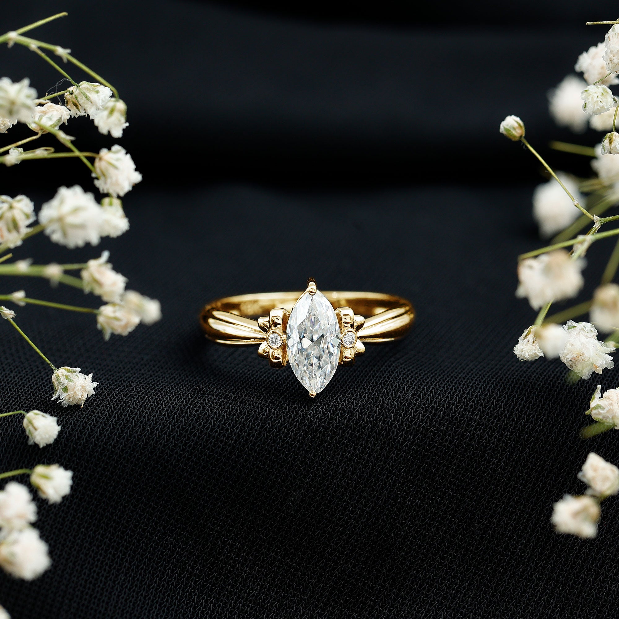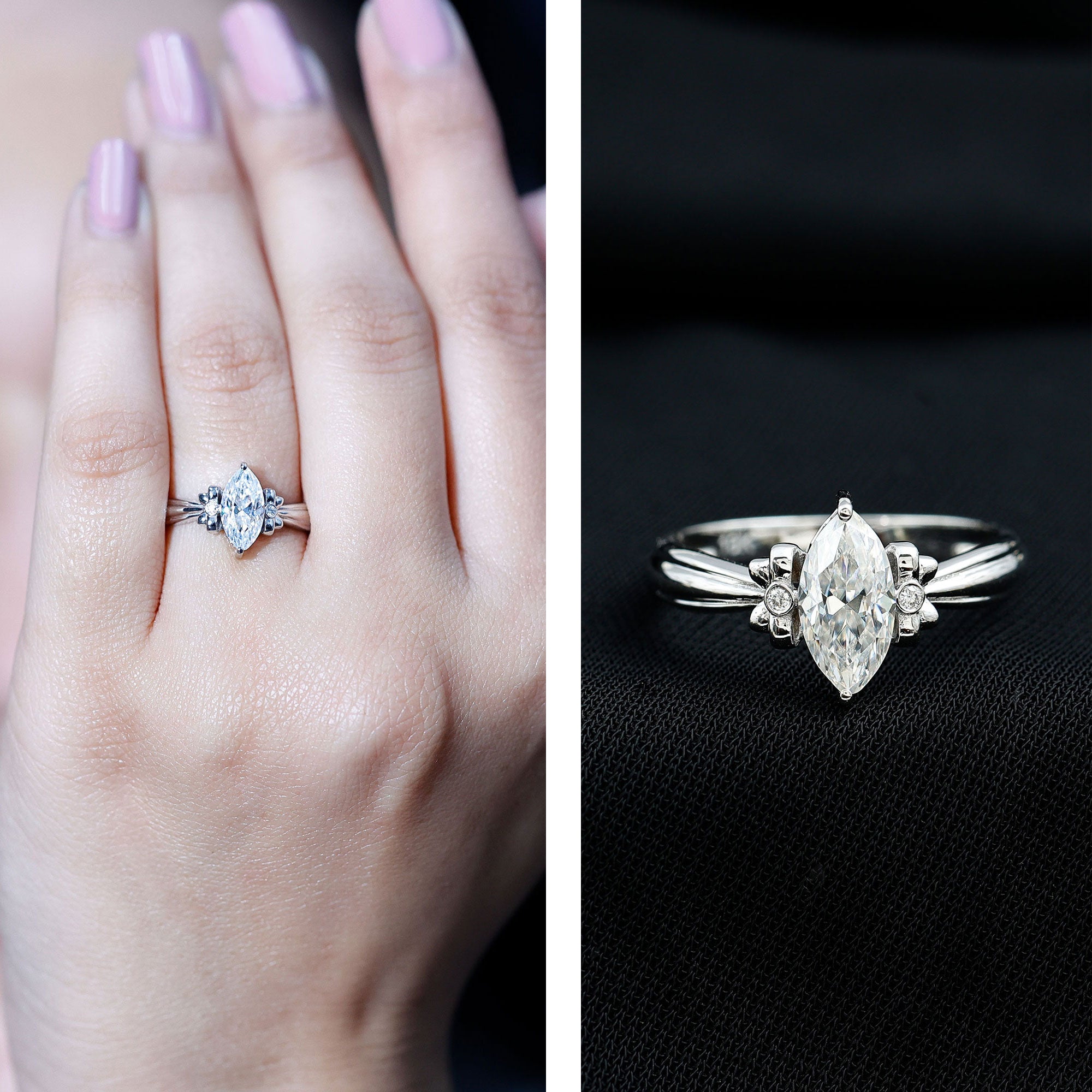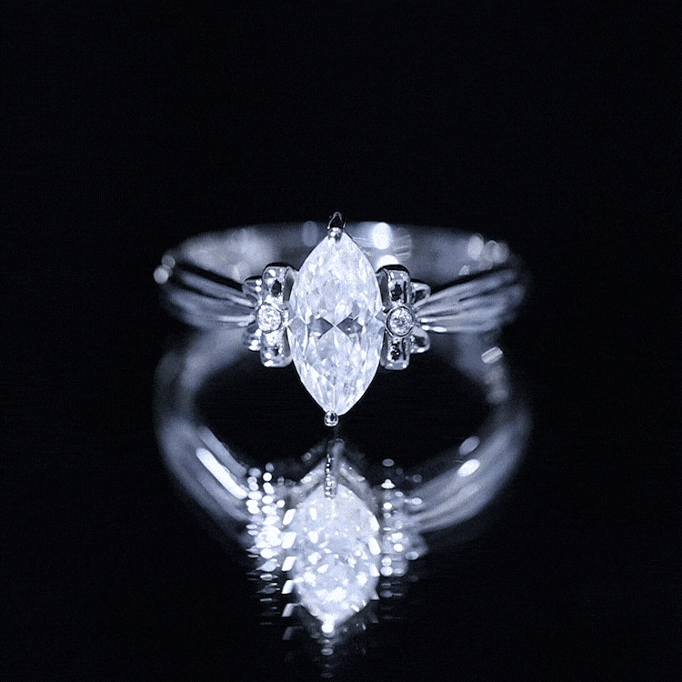 Make every proposal unforgettable with this dazzling Moissanite Engagement Ring, where elegance meets artistic charm. Crafted to capture the essence of romance and femininity, this Solitaire Ring features a captivating 5x10 MM marquise cut moissanite at the center, glimmering with intense fire and brilliance. The centerpiece is set in secure prong setting, allowing maximum light to pass through the stone, enhancing its natural sparkle. What makes this Designer Engagement Ring truly enchanting is its bow-like design, formed by intricate round moissanite stones on either side of the center. The design evokes a perfect blend of sophistication and whimsy, making it a standout choice for someone who adores unique yet timeless styles. The refined band provides a smooth finish, guaranteeing that all focus stays on the dazzling beauty of the bow-inspired design. Whether you are preparing for the ideal proposal or seeking a unique gift that represents commitment, this Marquise Cut Engagement Ring is sure to become a beloved keepsake. Available in multiple sizes and metal color choices, it adds a personalized element to your extraordinary moment. Timeless yet distinctive, it is a luminous promise enveloped in brilliance.