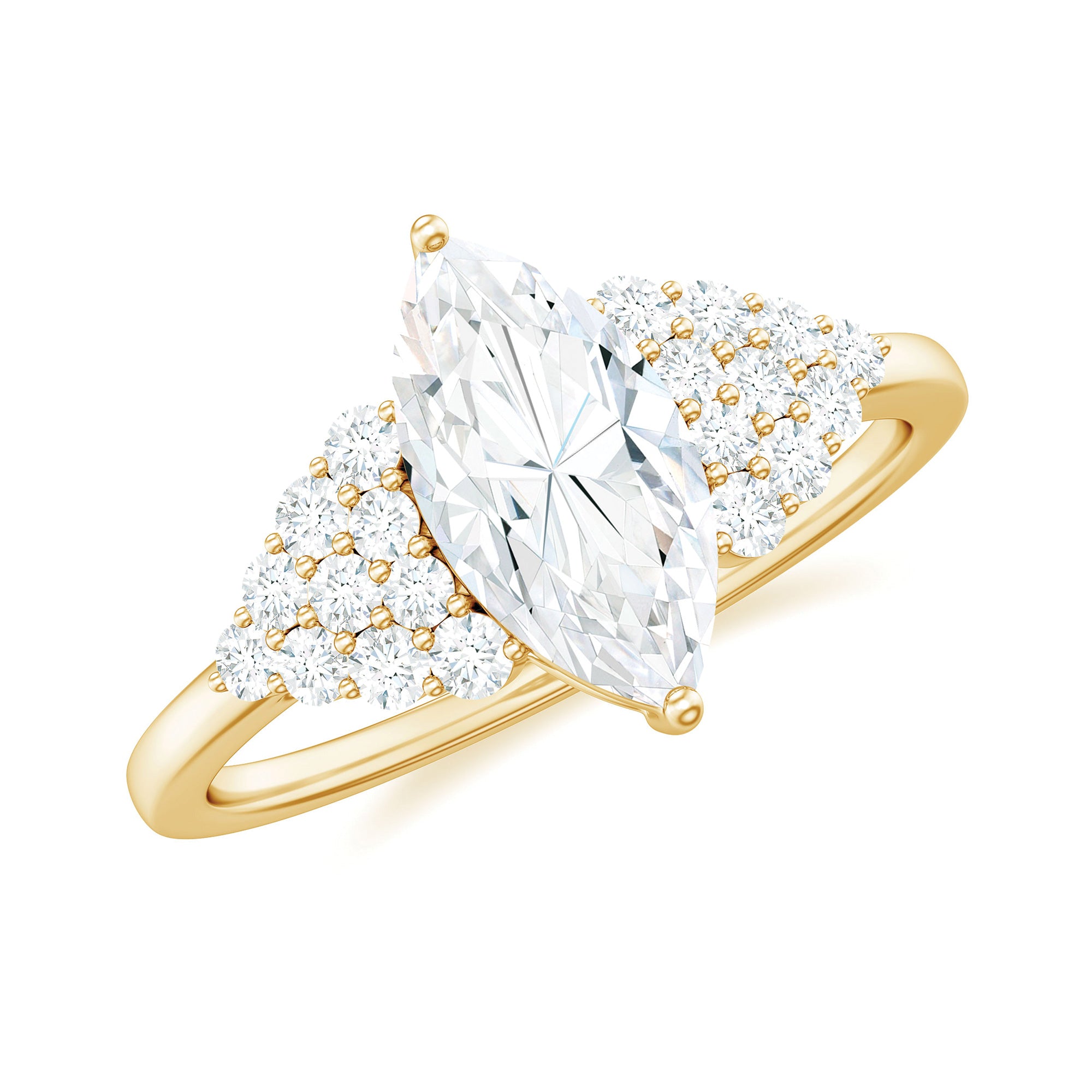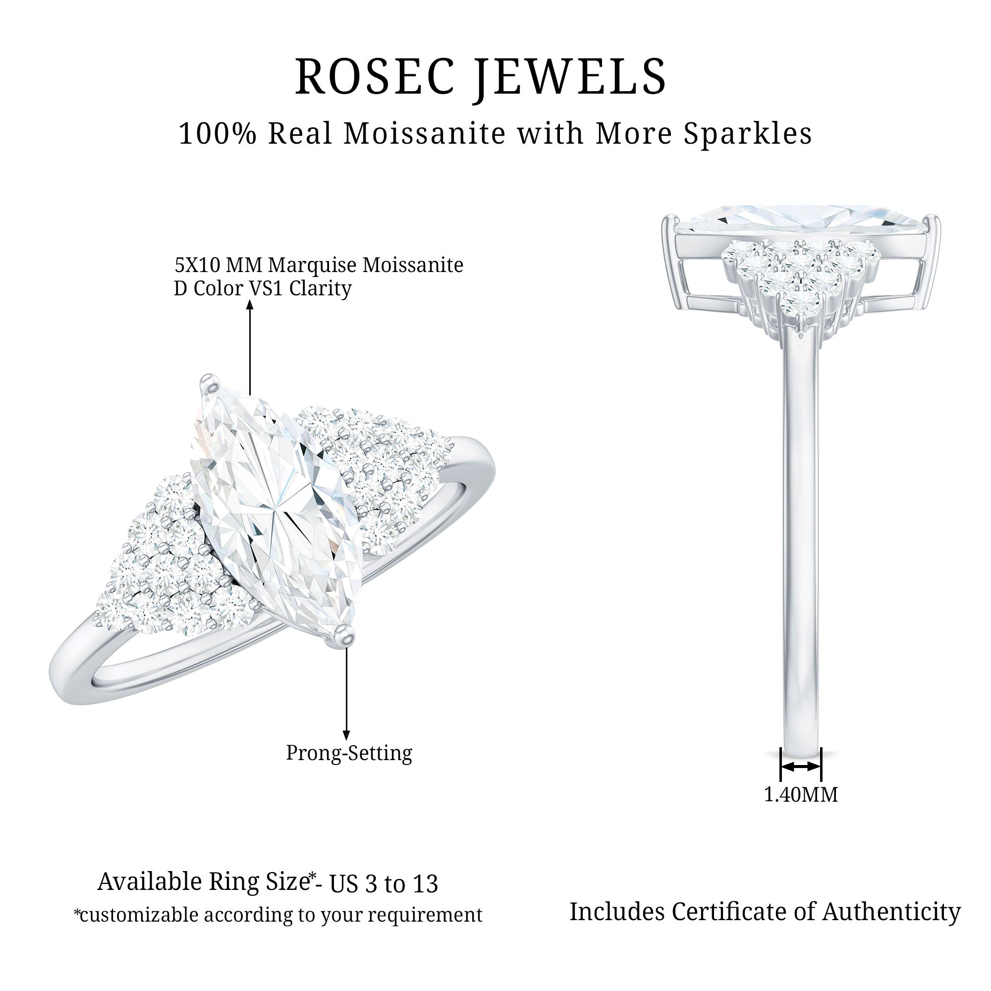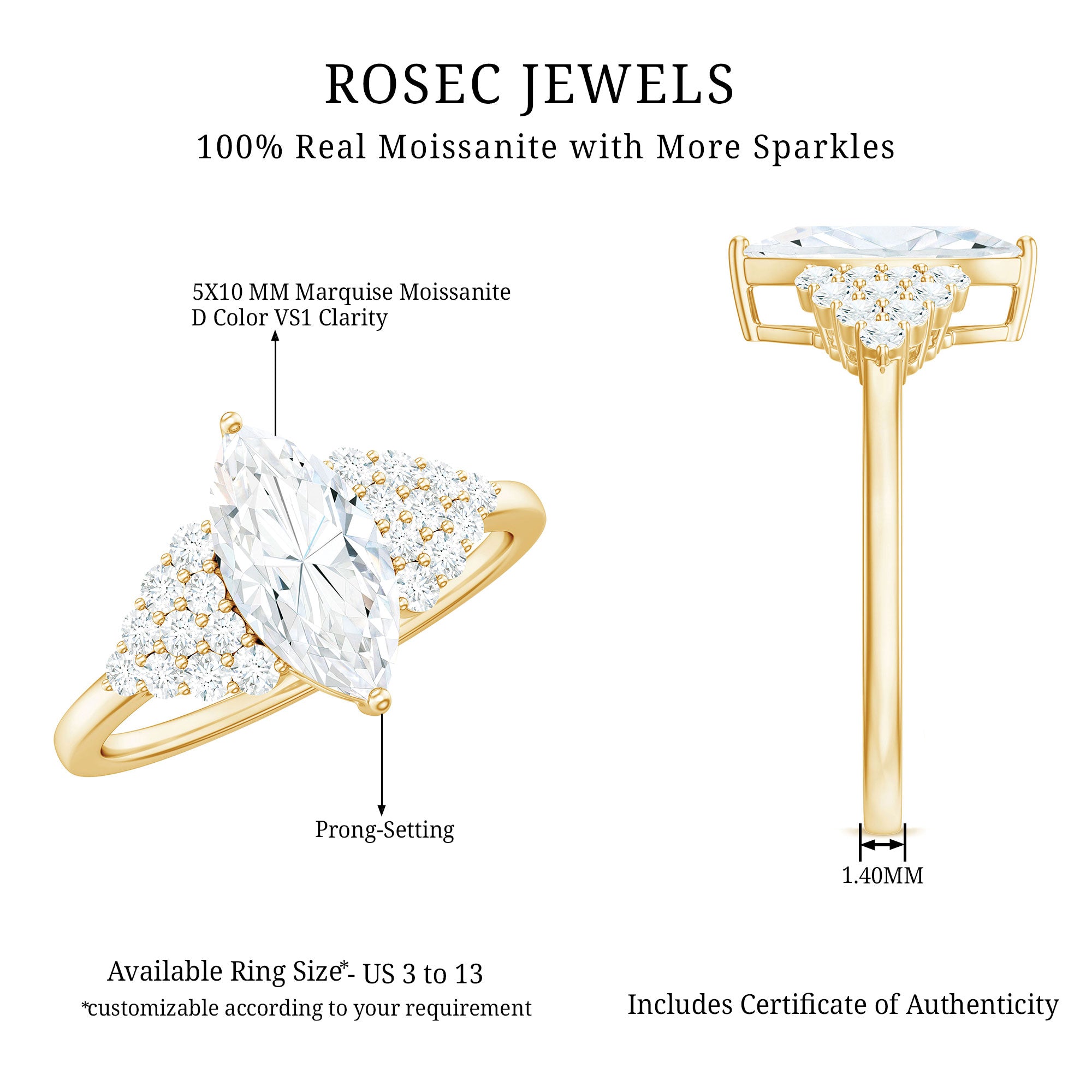 Discover the allure of enduring elegance with this Moissanite Engagement Ring, a design that radiates sophistication and uniqueness. At the heart of this enchanting piece is a 5X10 MM marquise cut moissanite of D-VS1 quality, securely set in a prong setting. The exquisite arrangement of cluster side stones is elegantly positioned along the shoulders, imparting a distinctive flair to the Designer Engagement Ring. Meticulously handcrafted, this Marquise Cut Engagement Ring is tailored for the contemporary bride who values the blend of traditional elements with a striking, modern twist. Ideal for engagements, anniversaries, or any memorable occasion, it transcends mere jewelry, becoming a timeless heirloom in the making. Beautifully presented in a signature jewelry box, this Statement Ring is poised to commemorate your most treasured moments with grace and brilliance. A tribute to clarity, artistry, and everlasting beauty, this Marquise Moissanite Ring serves as a sophisticated representation of your love story—bold, radiant, and eternally one-of-a-kind.