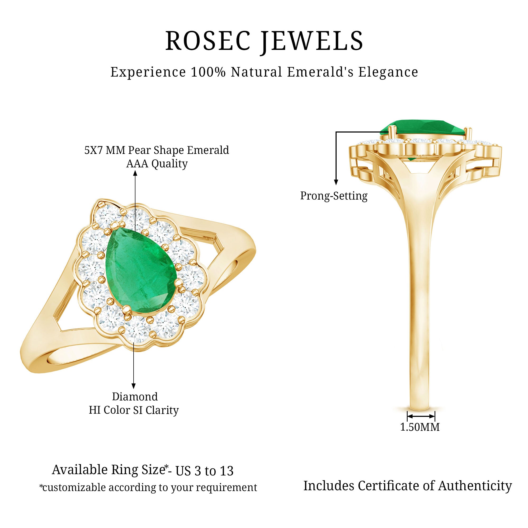 Introducing the ultimate Teardrop Engagement Ring for the woman who loves to make a bold and unforgettable impression. Featuring 5X7 mm pear shaped Emerald set at the center in a prong setting surrounded with round shape Diamonds as halo, that create a scintillating and luminous effect. Each piece is handmade to order, ensuring your ring is truly one of a kind. The Emerald Halo Ring is a stunning piece of jewelry that exudes elegance and sophistication. This Emerald Engagement Ring is known for its green hue that shimmers, making it unique, which is perfect for adding a touch of glamour to any outfit. The Pear Shape Emerald Ring is a versatile piece that can be dressed up or down, perfect for any occasion. Whether you are wearing it to a formal event or simply to add some sparkle to your everyday look, this Pear Shape Engagement Ring is sure to turn heads and make a statement. As a whisper of nature and a conversation starter, this May Birthstone Ring is a reflection of depth and colors to your story. Holding a universe rich in symbols and mysteries with mesmerizing colors. The AAA Quality Emerald and HI Color SI Clarity Diamonds radiate brilliance and fire.