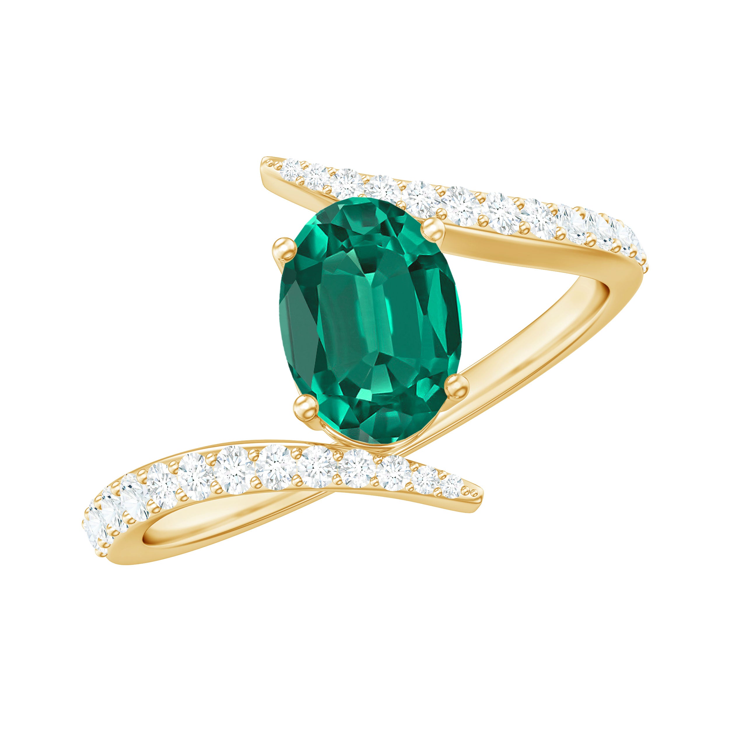 Crafted with sophistication and allure, this luxurious Created Emerald Engagement Ring is adored by all who behold it, featuring a brilliant sparkle that may rival even a true loves kiss. This Bypass Ring highlights a 5X7mm oval cut Lab Created Emerald, elegantly positioned in prong setting with petite round shape Moissanites set on the bypass shank. What enhances the uniqueness of this Emerald Engagement Ring is its bypass shank, adorned with petite round Moissanite stones. A ring of such remarkable craftsmanship and stunning brilliance is guaranteed to make your princess heart skip a beat. The refined and minimalist bypass shank gracefully curves to cradle the radiant stone, blending classic charm with a modern aesthetic that not only offers a contemporary appearance but also protects the gem, making this Oblong Engagement Ring perfect to wear as per the occasion. Carefully handcrafted, this Oval Cut Ring is offered in a variety of high-quality metal purity options and colors. Additionally, it is available in US standard sizes from 3 to 13, ensuring an impeccable fit for every hand. Whether for a proposal, an anniversary, or a memorable occasion shared between the two of you, this Lab Grown Emerald Ring is a timeless keepsake that she will treasure forever. A classic design meant to stir emotions — just as yours did when you discovered your soulmate.