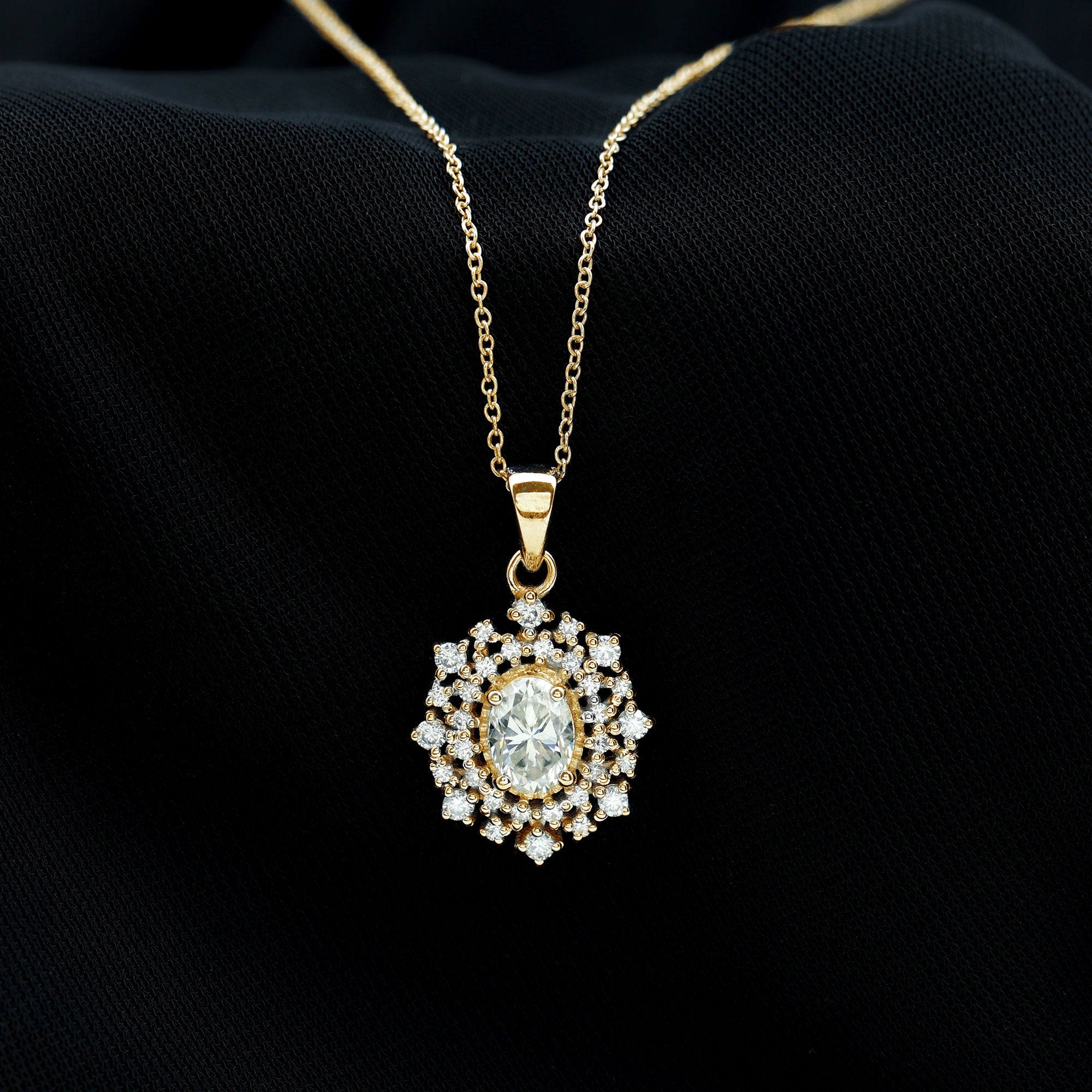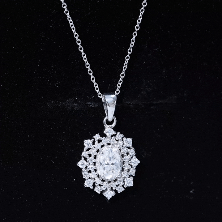 With the perfect blend of royal essence and modern style here is the Oval Diamond Necklace. This Statement Necklace from Rosec Jewels is handcrafted from a 5X7 MM Oval Shape Diamond securely placed in the Prong Setting. This Diamond Necklace Pendant is beautified with a Double Halo of Diamonds and Accented Bail. The Halo Diamond Pendant is perfect to dazzle the special occasions when paired with the bridal earrings. To make sure that your feelings and emotions attached to this Bridal Pendant Necklace is delivered securely to her, we send this pendant in the premium quality gift box.