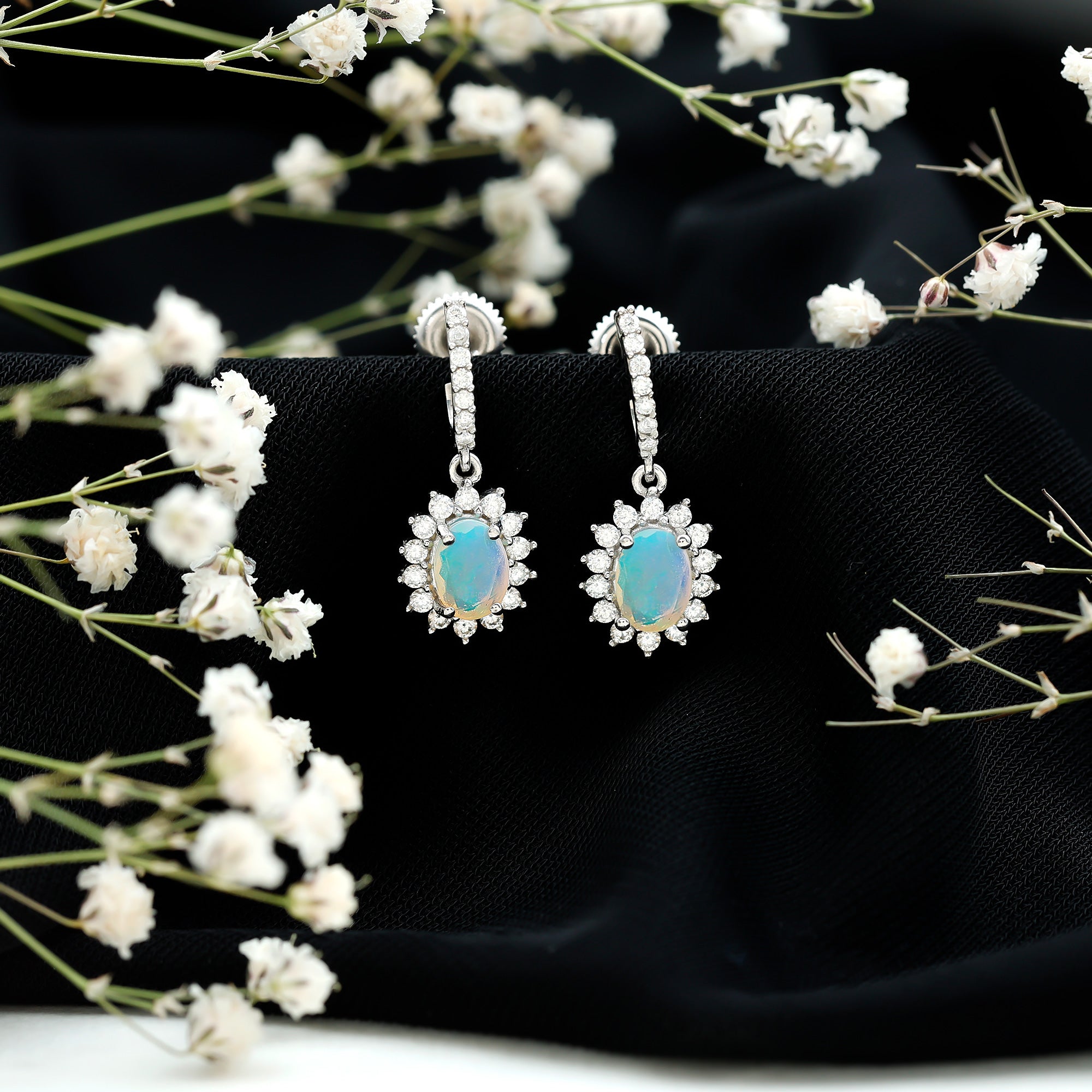 These Real Rainbow Opal Earrings are inspired by the starry sky. They feature a 5X7 MM Oval-Shaped Ethiopian Opal Securely placed in a Prong Setting. The center stone is encircled with smaller moissanite stones and dangles from J Hoops studded with the Moissanites. These Drop Earrings emit the classic shine of AAA Quality Ethiopian Opal and are handcrafted with 14K White Gold Plated Silver. These Earrings with screw on backs will be delivered to you in a signature velvet pouch with the certificate of authenticity.