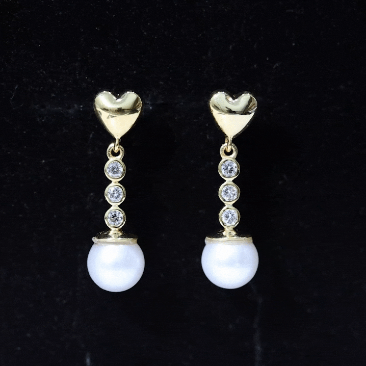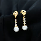 These lovely Dangle Earrings are designed in Heart Shape with Gold and Round Shaped Diamond stones in the bezel setting with a gigantic Freshwater Pearl stone as drop.