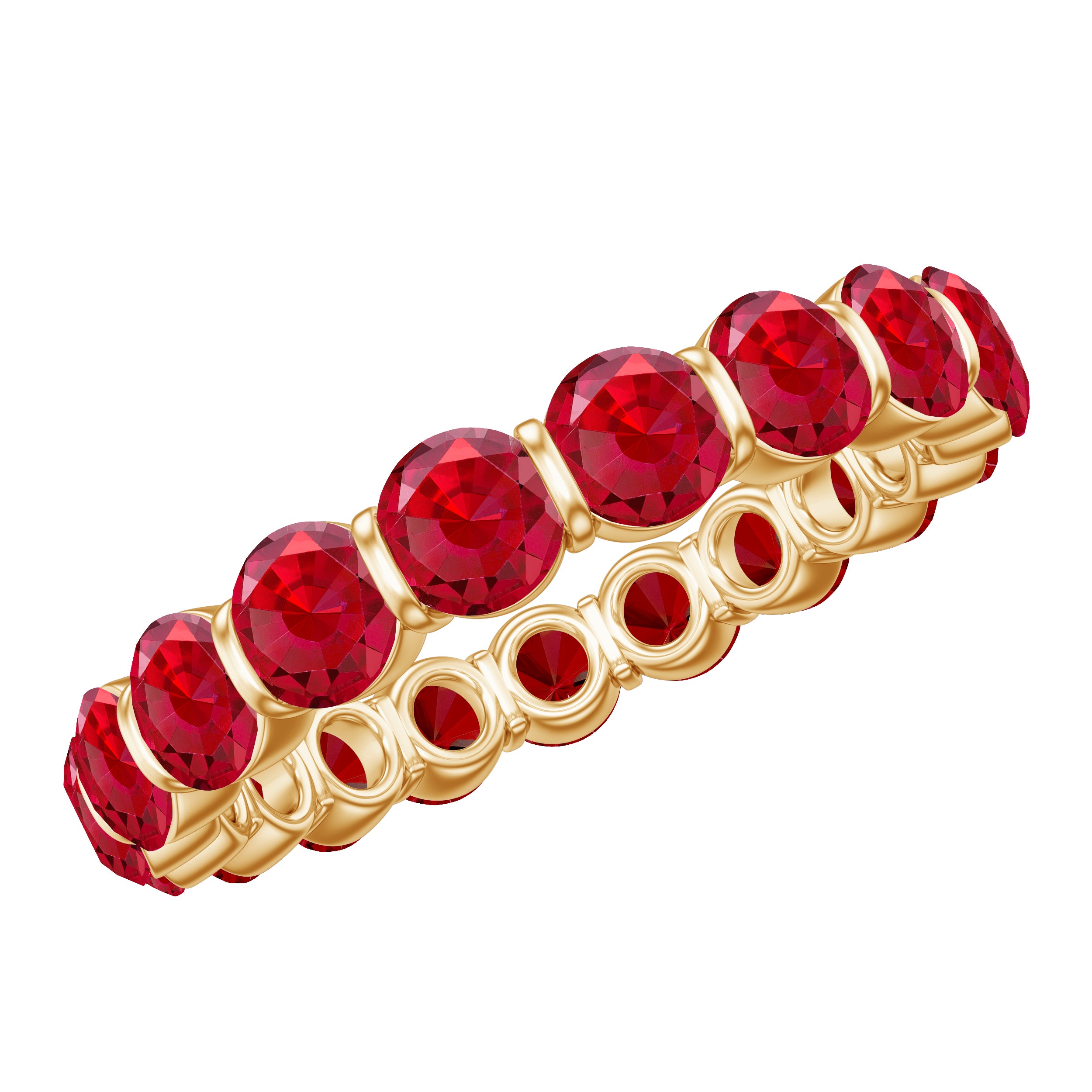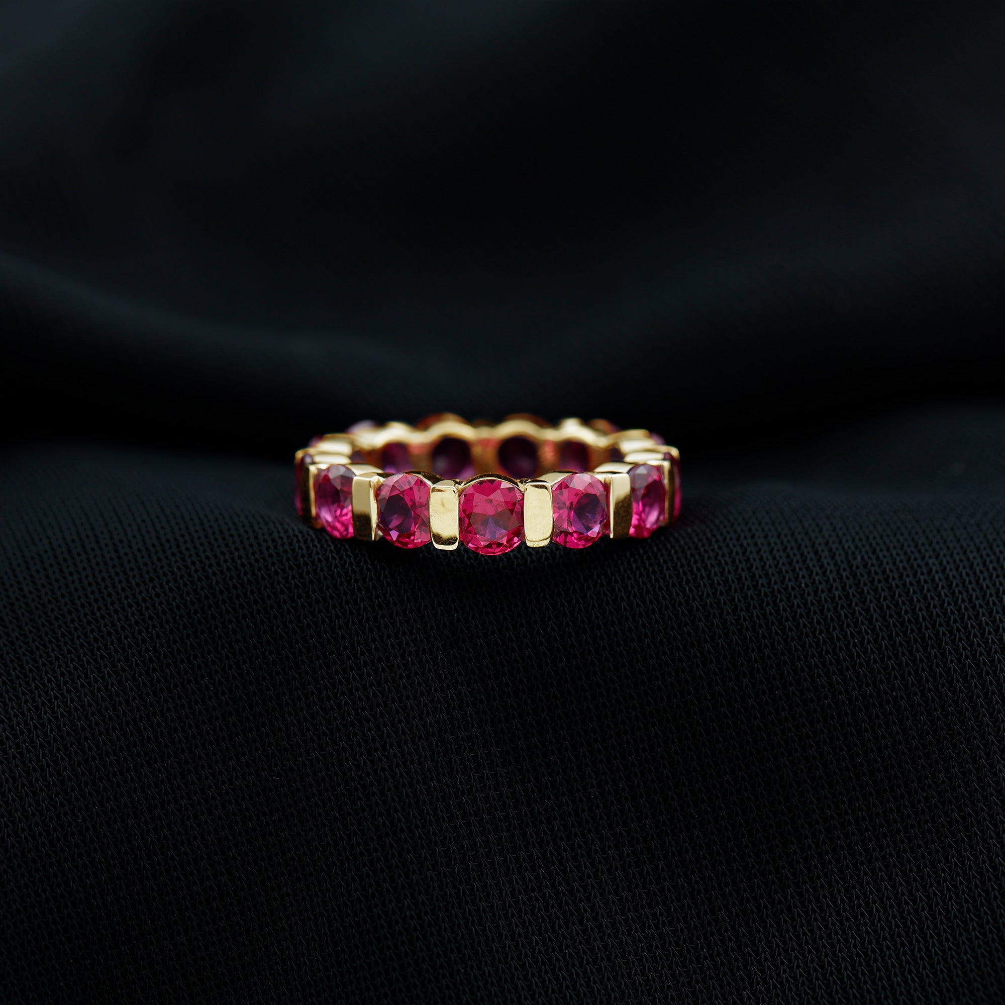 This Stunning Full Eternity Ring features Round Cut Lab Created Ruby in a Bar Setting, elegantly crafted in Solid Gold. The perfect gift for any special occasion that will be cherished by the recipient.