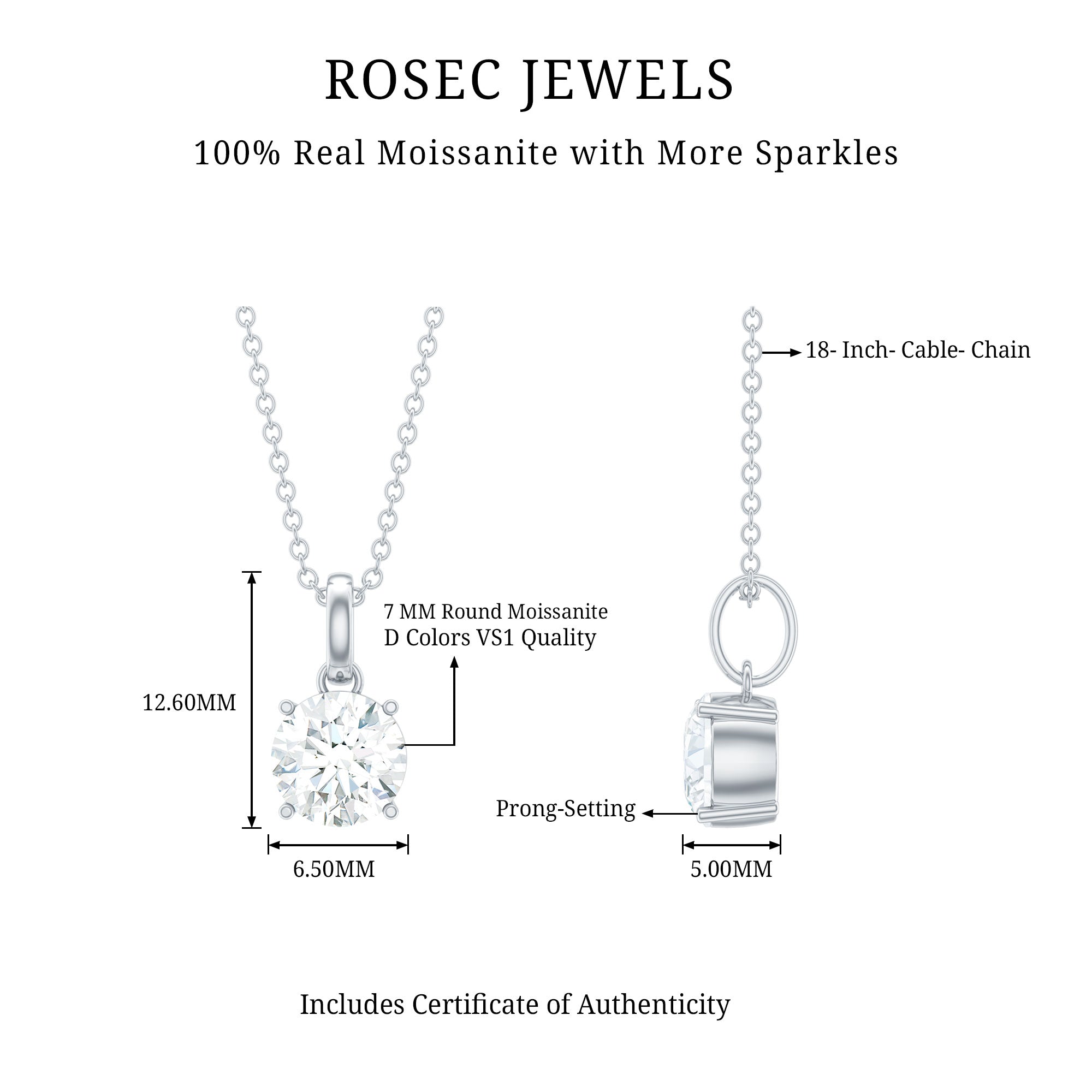 Treat your special lady to something timeless and meaningful, just like our Solitaire Moissanite Necklace. Made by Rosec Jewels, this Single Stone Pendant showcases a gorgeous 7 MM round cut moissanite set in prong setting for that classy vibe. This 1 Carat Moissanite Necklace is not just any jewelry, it is a must-have for every woman’s collection. The Moissanite Locket features a simple bail that lets the cable chain slide through effortlessly. You can choose to get this necklace with or without a chain, based on what she likes. By giving her this Round Moissanite Necklace, you will enhance her jewelry collection with a touch of luxury she can flaunt anytime, anywhere. Plus, the secure Signature Jewelry Box packaging not only adds an element of surprise but also provides safe storage for her treasured piece. The dazzling beauty of this Solitaire Pendant Necklace makes it ideal for everyday wear or dressing up for special occasions.