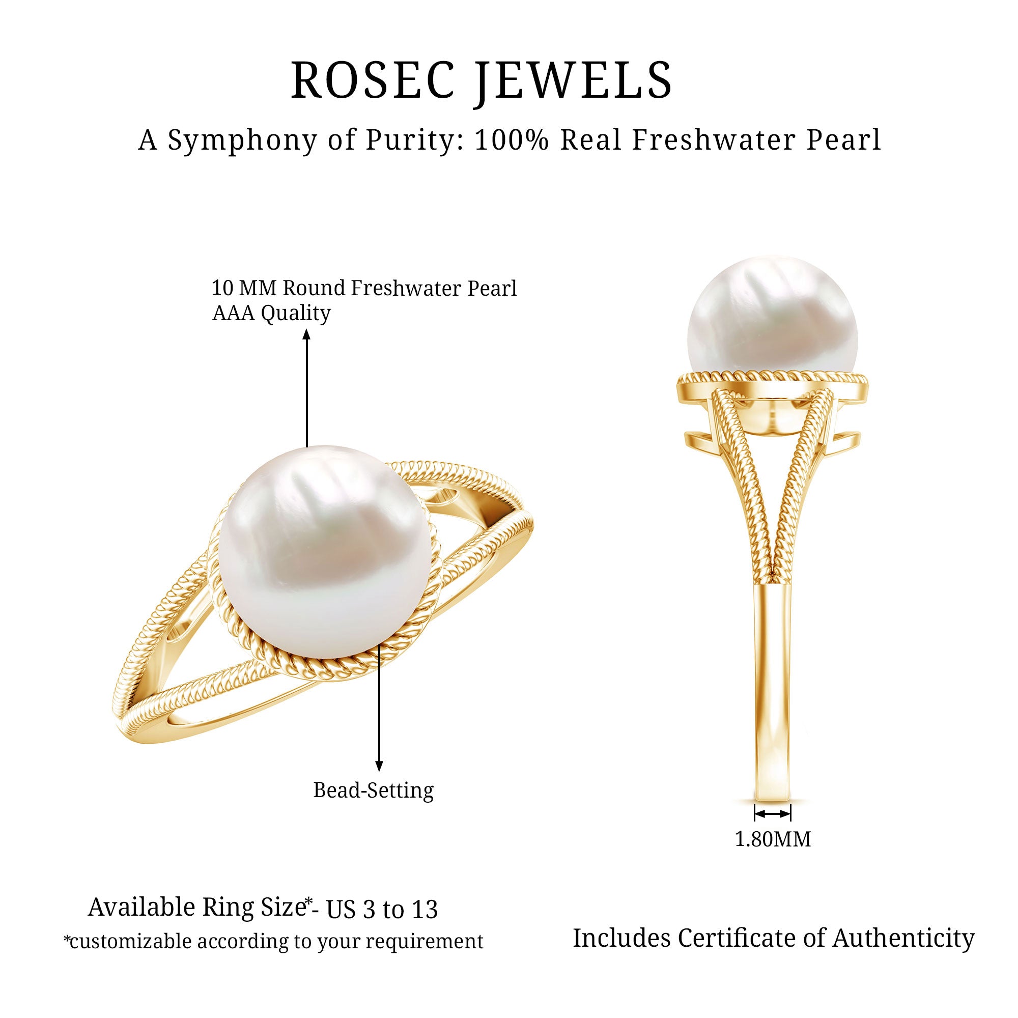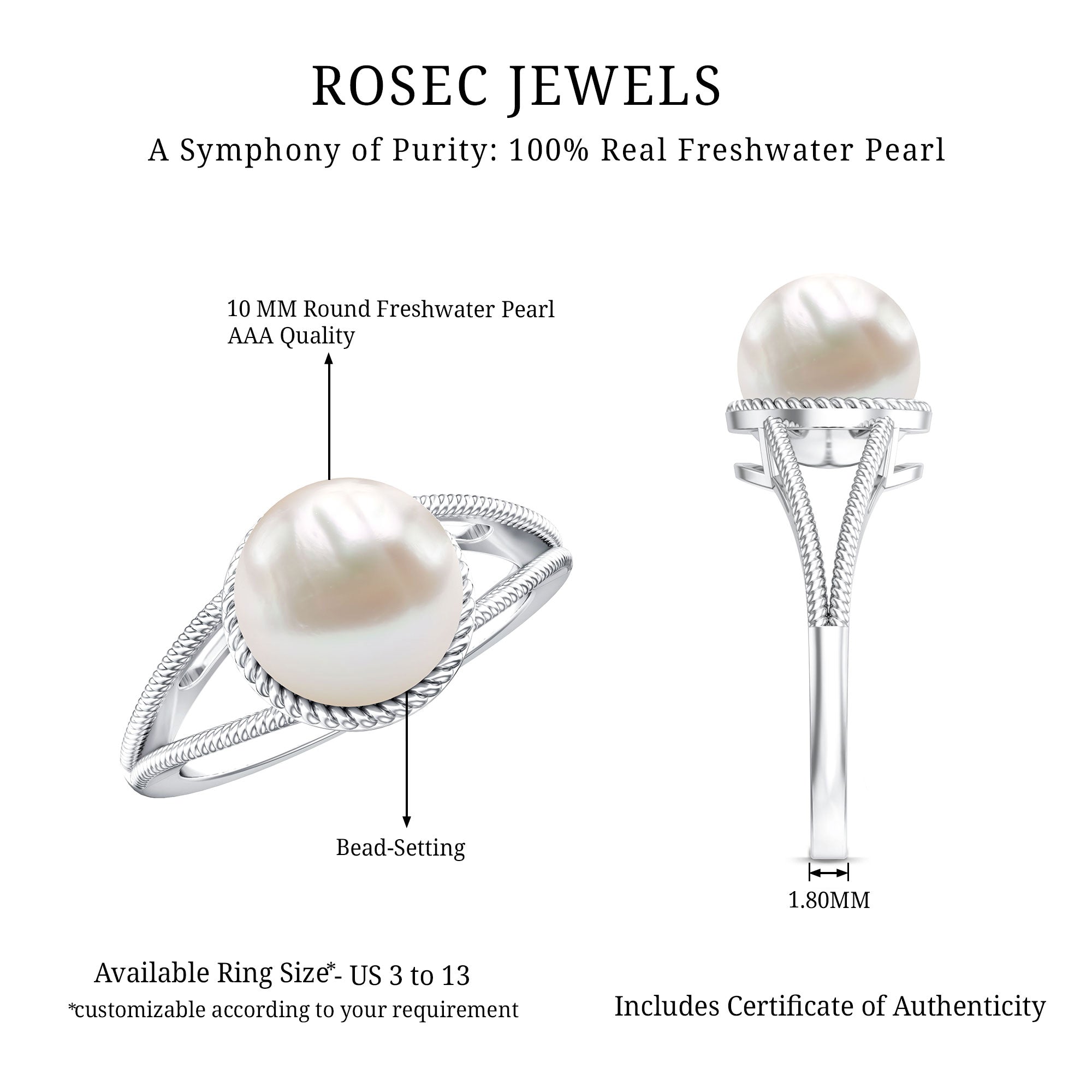 Solitaire Freshwater Pearl Ring has Split Shank and Rope Frame to add beauty to the ring. Freshwater Pearl exhibits AAA Quality and possess subtle color. Semi Precious June Birthstone summons faith and innocence. It is Natural and Certified, helps in enhancing personal integrity and grow sincerity of the wearer. The extremely durable nature and luster makes it a captivating and desirable gem.