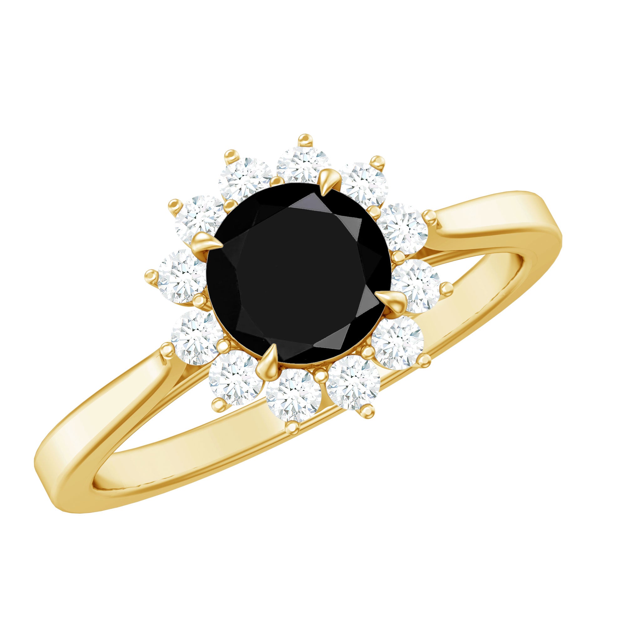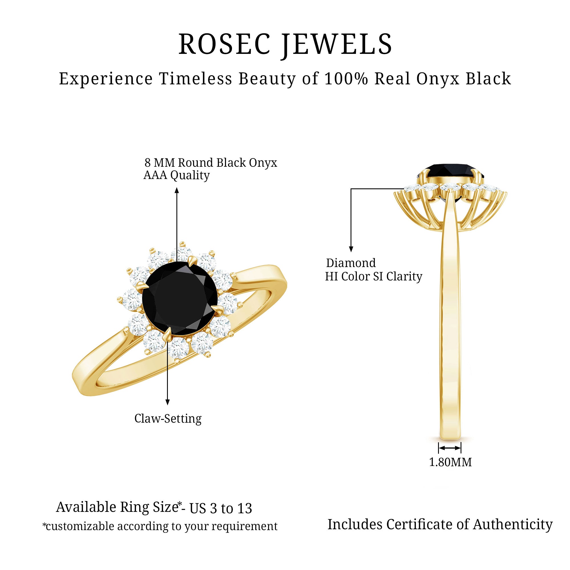 Make every moment unforgettable with this Black Onyx Engagement Ring that speaks of grace and beauty. This Halo Engagement Ring features a captivating 8 MM round cut black onyx at its center, held securely in claw setting that lets the gem shine from every direction. Encircling the center gem is a round cut real diamond halo, adding brilliance and highlighting the dark allure of the onyx. The soft shimmer of the diamonds brings balance to the bold centerpiece, giving the Round Cut Engagement Ring a eye-catching appearance. The black onyx, also known as the birthstone for December, carries a message of inner peace and grounding energy, making it a thoughtful choice for anyone drawn to its deeper meaning. Perfect for engagements, special gifts, or personal milestones, this piece also suits festive occasions like Halloween or winter celebrations. This Onyx and Diamond Ring is elegant enough for formal wear yet subtle enough to be worn every day. Whether you are proposing or gifting a token of love, this Black Onyx Halo Ring brings timeless beauty and heartfelt meaning together in one remarkable design.