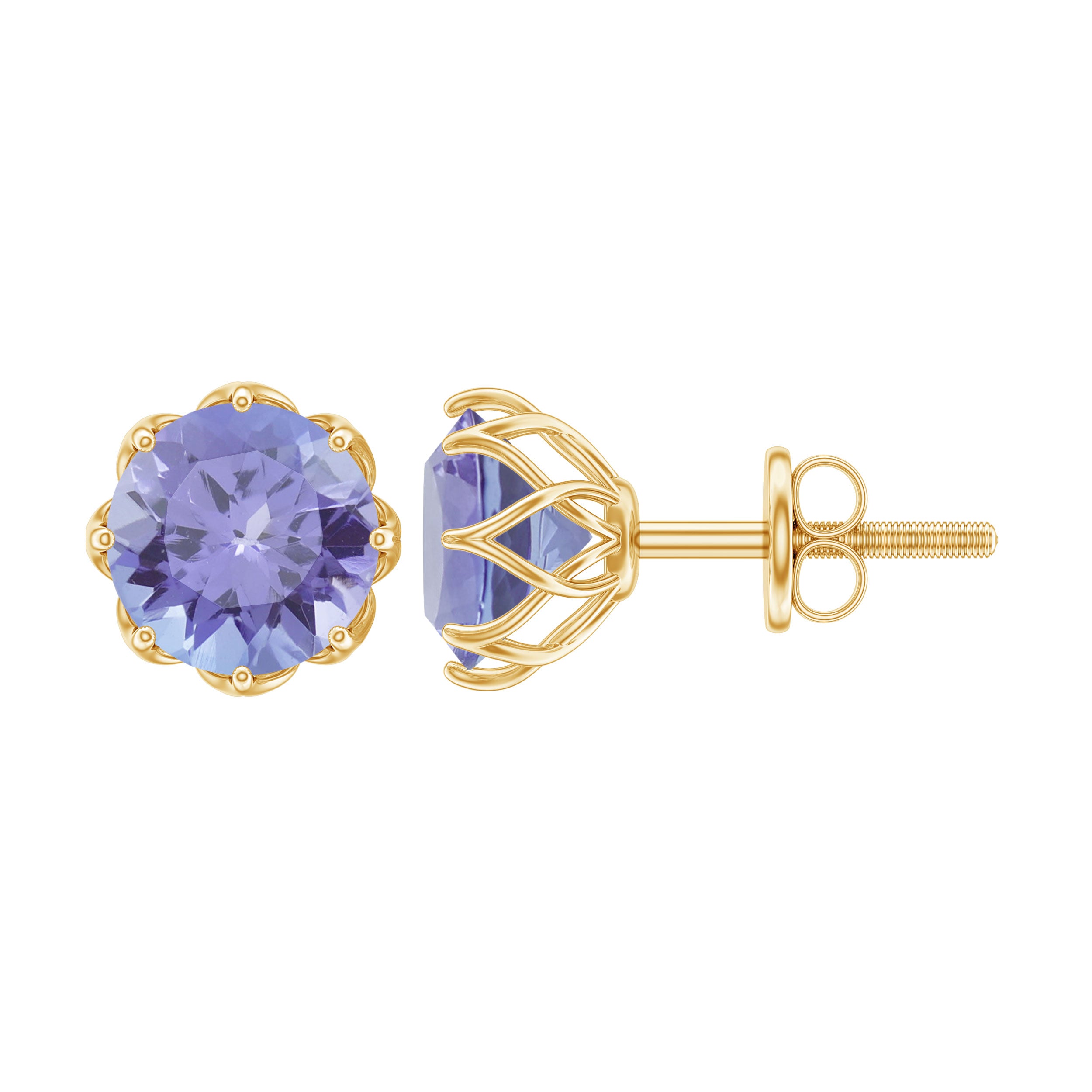 This Solitaire Floral Earring is studded with a Round Shape Tanzanite as Solitaire in Floral Setting. This Solitaire Stud Earring is an ideal piece of Fine Jewelry for simple and subtle looks.