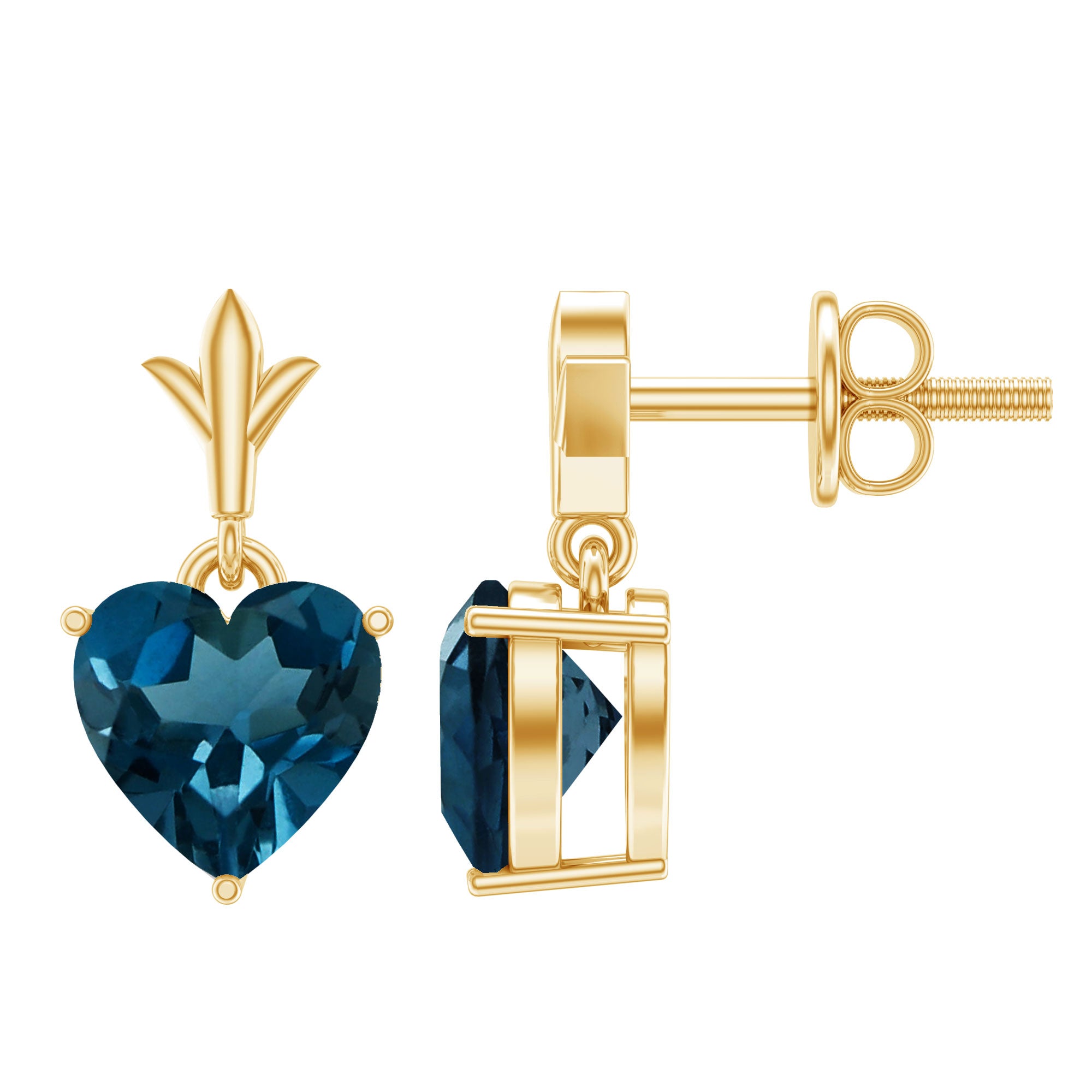 This Heart Drop Earrings embellished with Heart Shape London Blue Topaz Gemstone is set in a Prong Setting, crafted in a Solid Gold Metal.