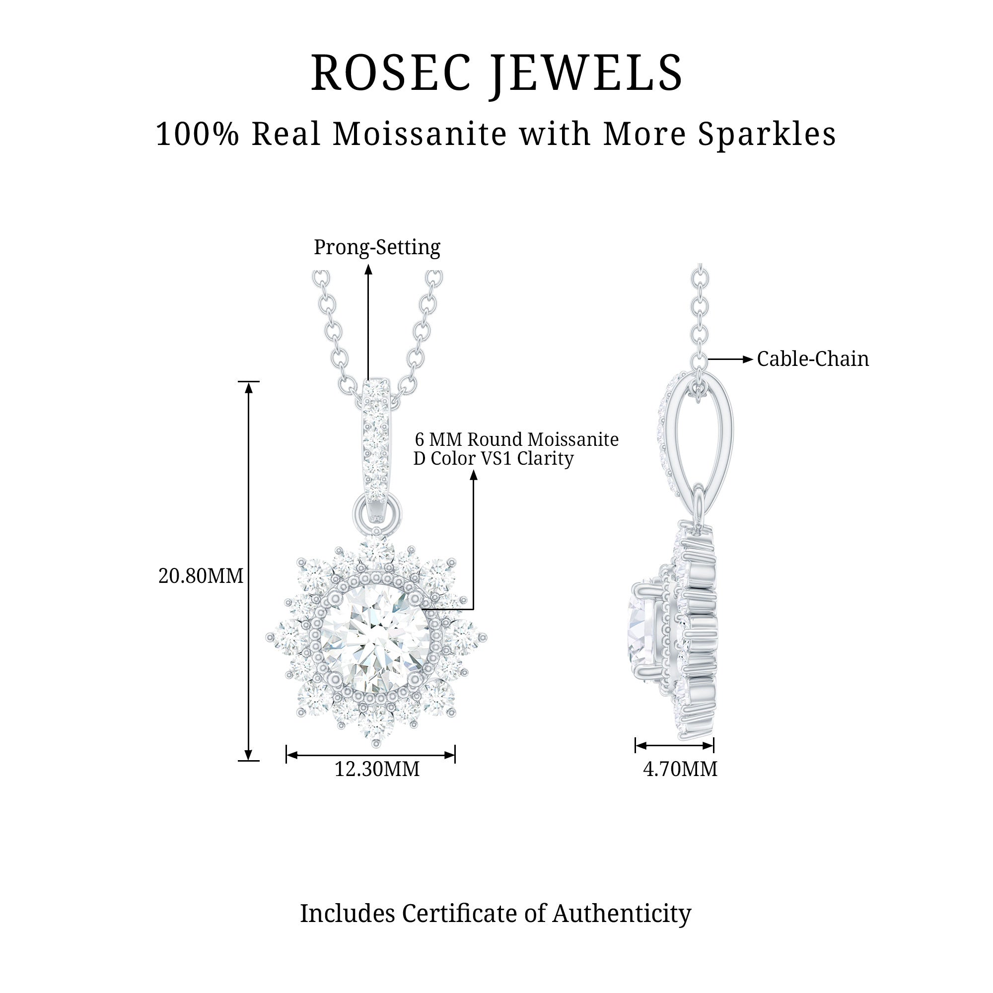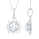 Step into the charm of the old world with this gorgeous Halo Pendant Necklace - a dazzling piece that grabs attention with every look. It features a 6 MM round cut Moissanite set in prongs at the center, showcasing D color and VS1 clarity. Surrounding the main gem are dainty beads that add a vintage flair to the design, complemented by a sunburst halo of round cut moissanite stones. This Round Moissanite Necklace is crafted from 14k white gold plated silver, making it a luxurious piece. Designed with care by talented artisans, every detail showcases elegance and creativity, including its moissanite studded bail. Hanging effortlessly from a sleek cable chain, this Wedding Necklace for Bride feels both classic and modern.