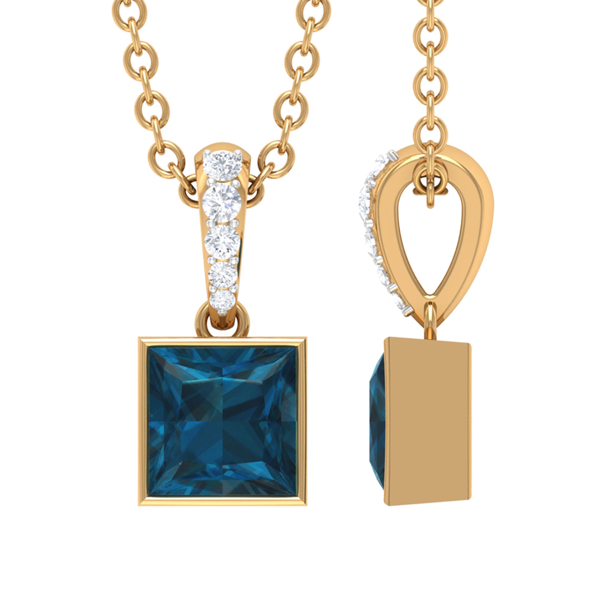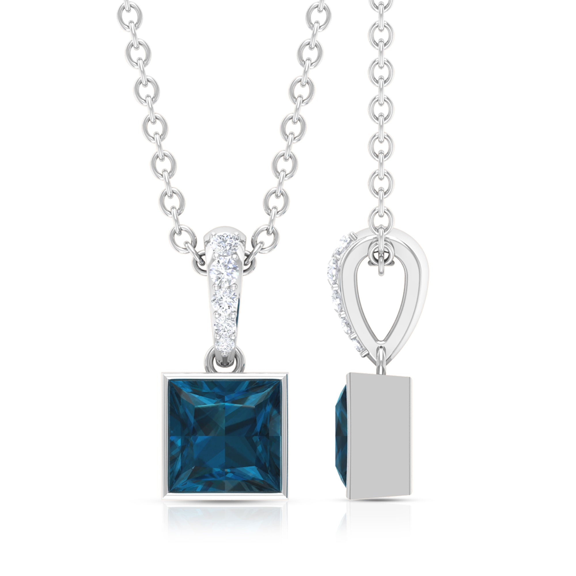 Go ready for the party with this Solitaire Pendant. It features with Princess Cut London Blue Topaz in Bezel Setting with Diamond Accent Bail on Blue Topaz Pendant Necklace. Treat yourself or your loved ones with this statement jewelry.