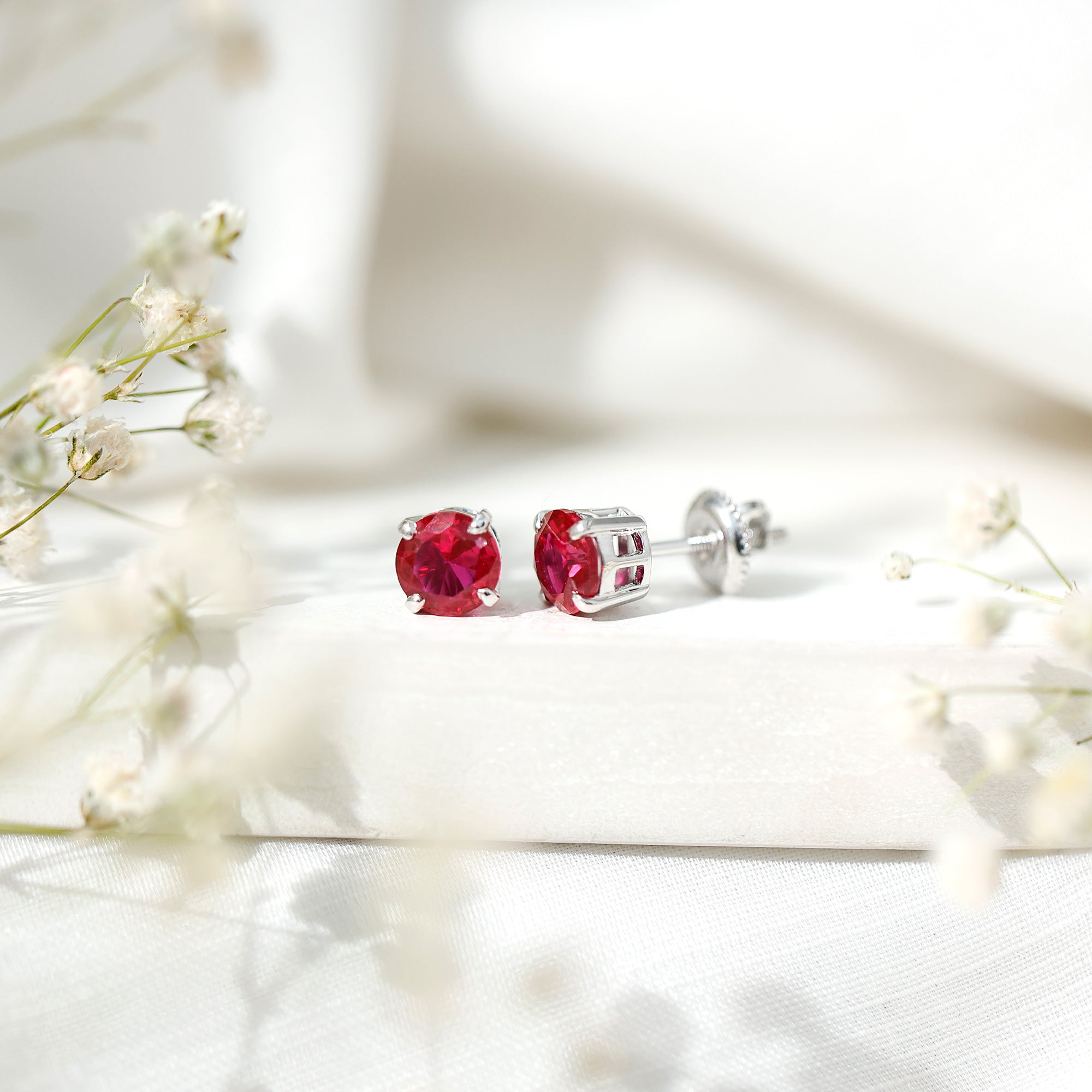 Elevate your everyday look with these beautiful Lab Grown Ruby Stud Earrings, crafted from high-quality metal for durability and shine. Each earring features a 6 MM round lab created ruby, securely held in claw setting, allowing the gemstone to sparkle brilliantly. These AAAA quality synthetic rubies provide the deep red color and elegance of natural rubies while being affordable and eco friendly. Designed in a timeless stud style with a secure screw-back closure, these Everyday Earrings are comfortable for all-day wear and perfect for any occasion. Whether for birthdays, anniversaries, Valentine’s Day, or just to surprise someone special, these Ruby Solitaire Earrings make a thoughtful and meaningful gift. They come with a certificate of authenticity to ensure quality and value and are beautifully presented in a premium jewelry box, making them ready to gift. Their romantic, vibrant color adds a touch of sophistication and charm to any outfit, making them a versatile addition to your jewelry collection.