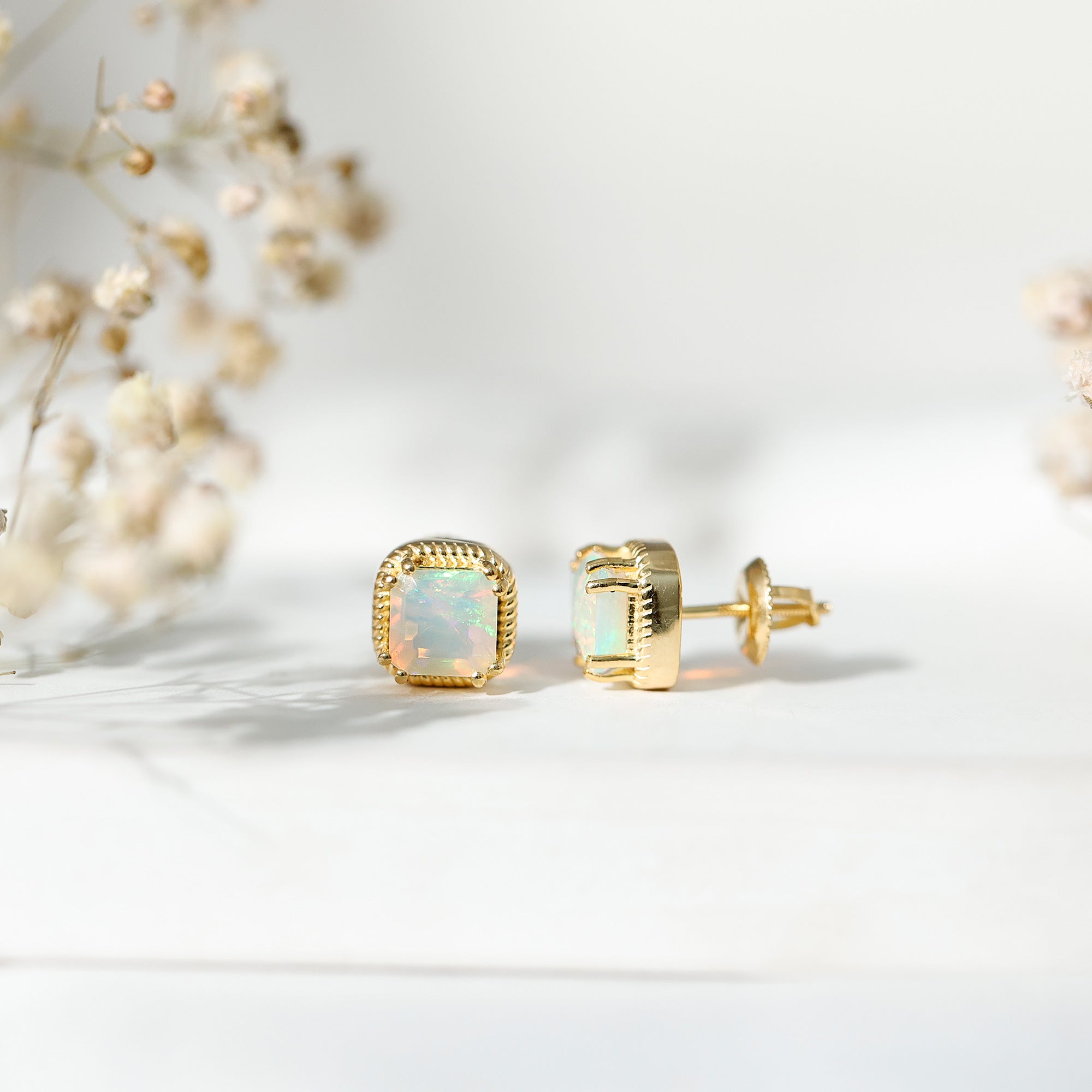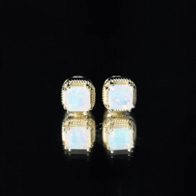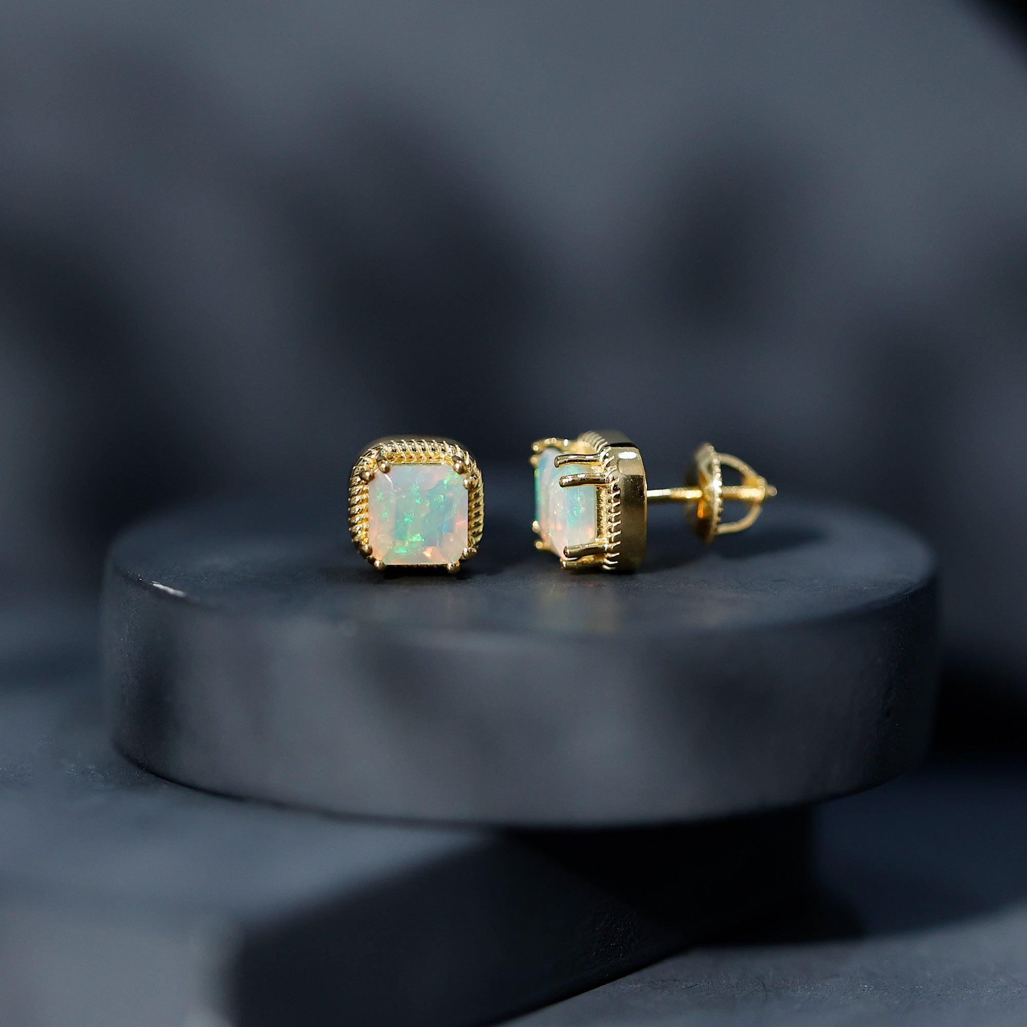 Turn heads with the vibrant beauty of these striking Ethiopian Opal Stud Earrings - a statement of sophistication and bold elegance. Each earring showcases a mesmerizing 6 MM asscher cut Ethiopian opal, totaling an impressive 6 CT (3 Carat Stud each) of ethereal brilliance. Set securely in a safe double-prong setting, the center stones are framed by a distinctive twisted rope border, giving these Solitaire Studs a refined vintage charm with a contemporary edge. The screw back design ensures a snug and comfortable fit, making them perfect for daily wear or special occasions where elegance matters most. Whether you are dressing up for a candlelit dinner or adding a splash of brilliance to a casual outfit, these Real Opal Earrings never miss the mark. Crafted in 14k yellow gold plated silver with attention to detail, the twisted rope frame adds texture and dimension, wrapping the opals like a halo of elegance, enhancing their glow while offering a unique, artisanal look. Feminine yet fierce, these Asscher Cut Earrings are ideal for an October born woman as a Birthstone Stud Earrings or the one who appreciates timeless beauty with a modern twist. These October Birthstone Earrings are conversation starters, symbols of individuality, and radiant tokens of self-expression. Presented in a premium jewelry box, they make a wonderful gift or a cherished addition to your own collection. Celebrate your unique glow with every flicker of light.