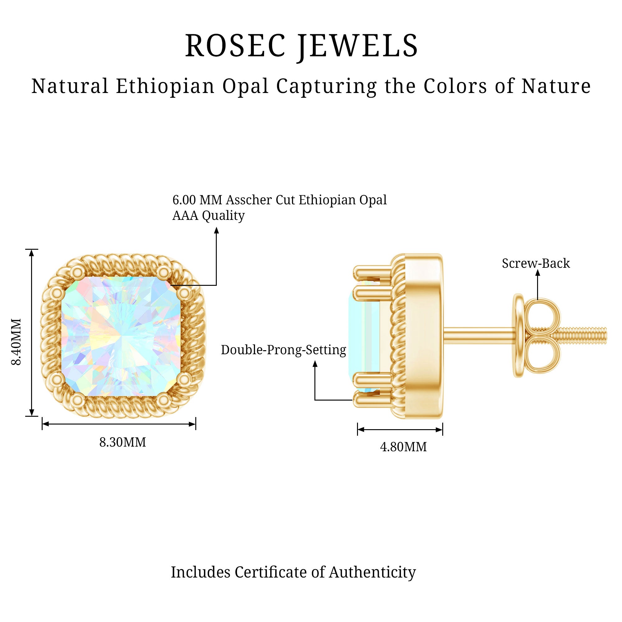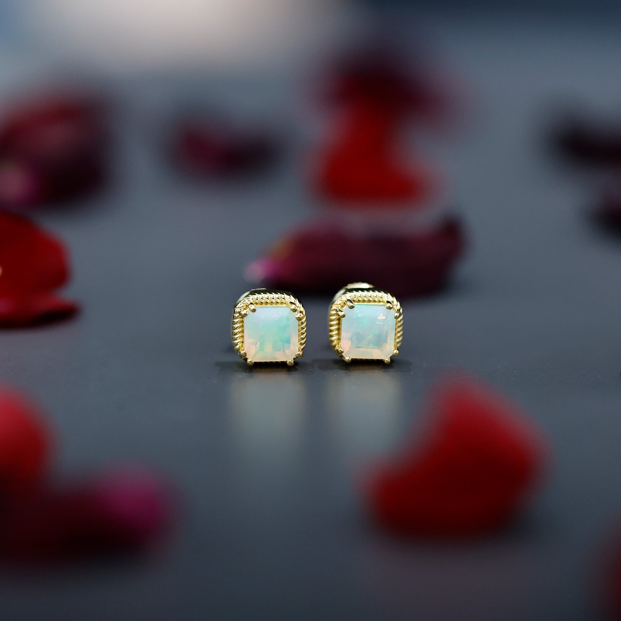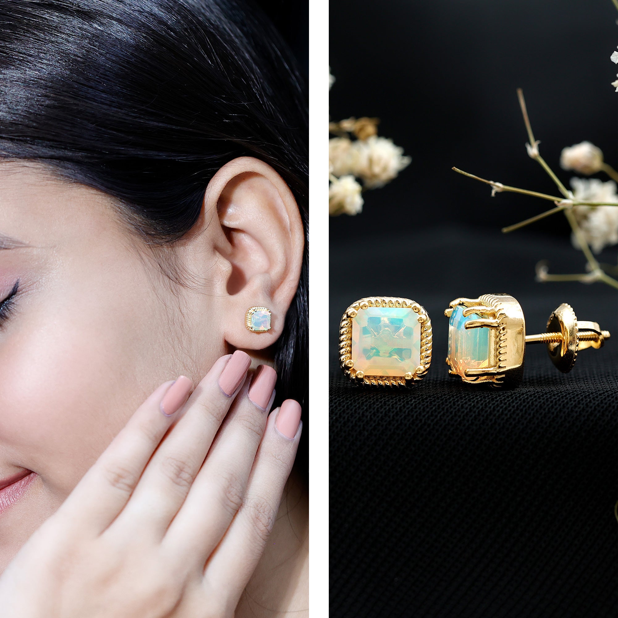 Turn heads with the vibrant beauty of these striking Ethiopian Opal Stud Earrings - a statement of sophistication and bold elegance. Each earring showcases a mesmerizing 6 MM asscher cut Ethiopian opal, totaling an impressive 6 CT (3 Carat Stud each) of ethereal brilliance. Set securely in a safe double-prong setting, the center stones are framed by a distinctive twisted rope border, giving these Solitaire Studs a refined vintage charm with a contemporary edge. The screw back design ensures a snug and comfortable fit, making them perfect for daily wear or special occasions where elegance matters most. Whether you are dressing up for a candlelit dinner or adding a splash of brilliance to a casual outfit, these Real Opal Earrings never miss the mark. Crafted in 14k yellow gold plated silver with attention to detail, the twisted rope frame adds texture and dimension, wrapping the opals like a halo of elegance, enhancing their glow while offering a unique, artisanal look. Feminine yet fierce, these Asscher Cut Earrings are ideal for an October born woman as a Birthstone Stud Earrings or the one who appreciates timeless beauty with a modern twist. These October Birthstone Earrings are conversation starters, symbols of individuality, and radiant tokens of self-expression. Presented in a premium jewelry box, they make a wonderful gift or a cherished addition to your own collection. Celebrate your unique glow with every flicker of light.
