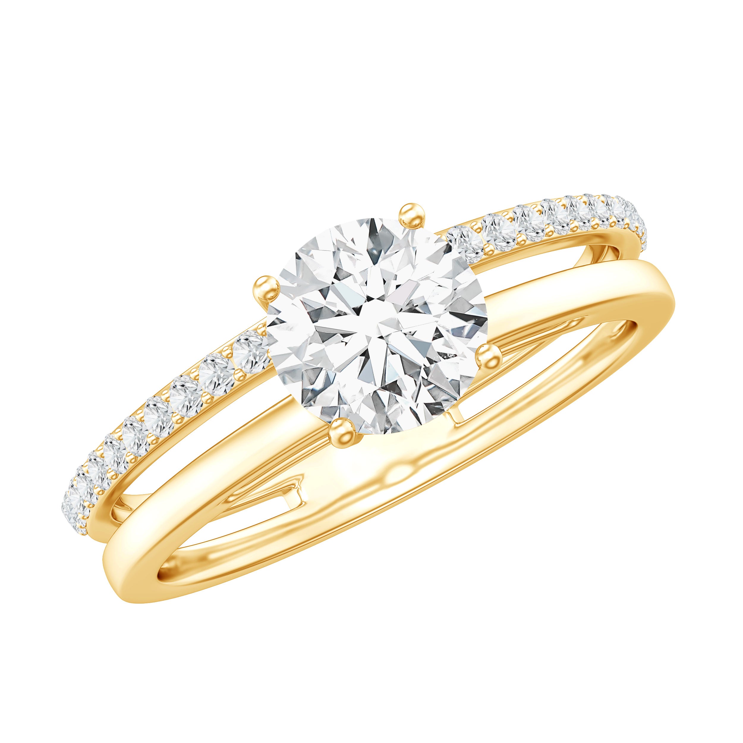 With its extended display of scintillation, this enchanting Double Band Engagement Ring makes a perfect symbol of endless love. Featuring with 6 mm round shape Moissanite at the center as solitaire in a prong setting with tiny round shape moissanite side stones on one band, another band is of plain metal. This Womens Moissanite Ring is the one which you can flaunt everyday without any discomfort or hesitation. The extra moissanites on both sides add more sparkle to the ring. D color Vs1 clarity Moissanites has same brilliance as natural diamonds at an affordable prices. This Solitaire Engagement Ring has total 1 ct weight, is a must buy ring. This Womens Engagement Ring can add grace to any occasion may be its an anniversary party, engagement, wedding etc. This Moissanite Ring is available in US sizes from 3 to 13 and delivered in a signature jewelry box. For love that always goes the extra mile, this Moissanite Engagement Ring has you covered!