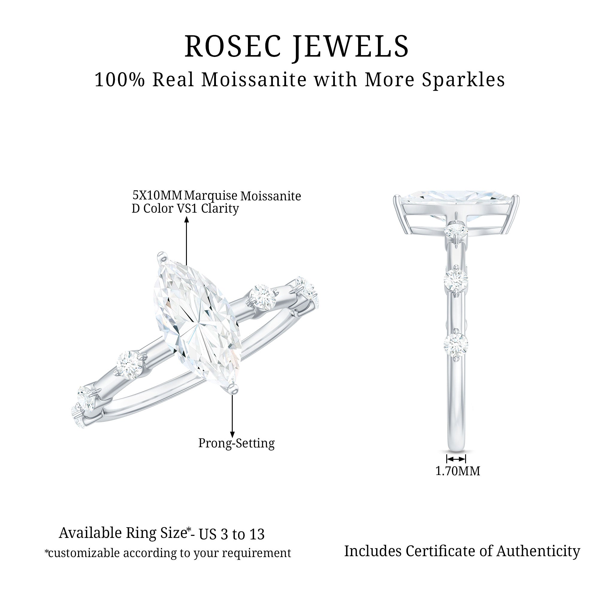 Desired for its fancy look, a Solitaire Marquise Engagement Ring is characterized by a smile-resembling shape that features curved sides and pointed tips. Owing to its elongated shape, it gives off the illusion of a larger looking ring. Moreover, thanks to the arrangement of 58 facets, it also catches the eye with its beautiful bow-tie effect.