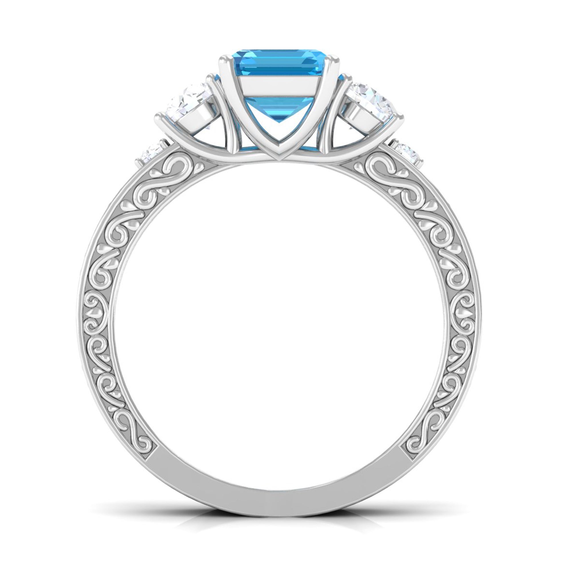Personifying an exquisite style, this Engraved Ring features an Octagon Cut Swiss Blue Topaz as Solitaire and Round Brilliant Cut Moissanites embellished in Prong Setting for your girl. This Three Stone Ring is a perfect Engagement Ring with an attractive colour pallette to put you on spotlight.