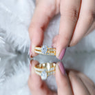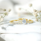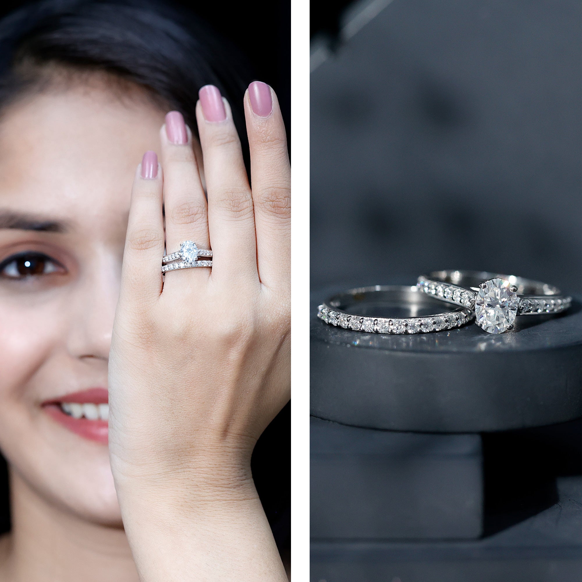 Bold and beautiful, this Lab Grown Diamond Wedding Set is a stunning piece that will make you fall in love all over again. The charm and elegance of the Bridal Ring Set would please her heart and sparkle on her finger. Celebrate all your special moments with this exquisite Diamond Engagement Ring Set, which serves as a unique symbol of your love. The breathtaking Engagement Ring features a 6X8 MM oval-shaped lab grown diamond securely held by basket setting in a high-profile style for maximum brilliance, complemented by minimalist side stones and a surprise diamond. Alongside the engagement ring is the wedding band, adorned with delicate lab created diamonds in a half eternity design. Treasure every moment and seal your vows with this Diamond Wedding Ring Set. This Engagement Ring and Wedding Band Set is a significant investment, showcasing EF-VS quality lab grown diamonds. Our skilled artisans have carefully crafted it to perfection, creating a custom masterpiece that is uniquely tailored for your special occasions, whether it's an Anniversary, Wedding, or Engagement.