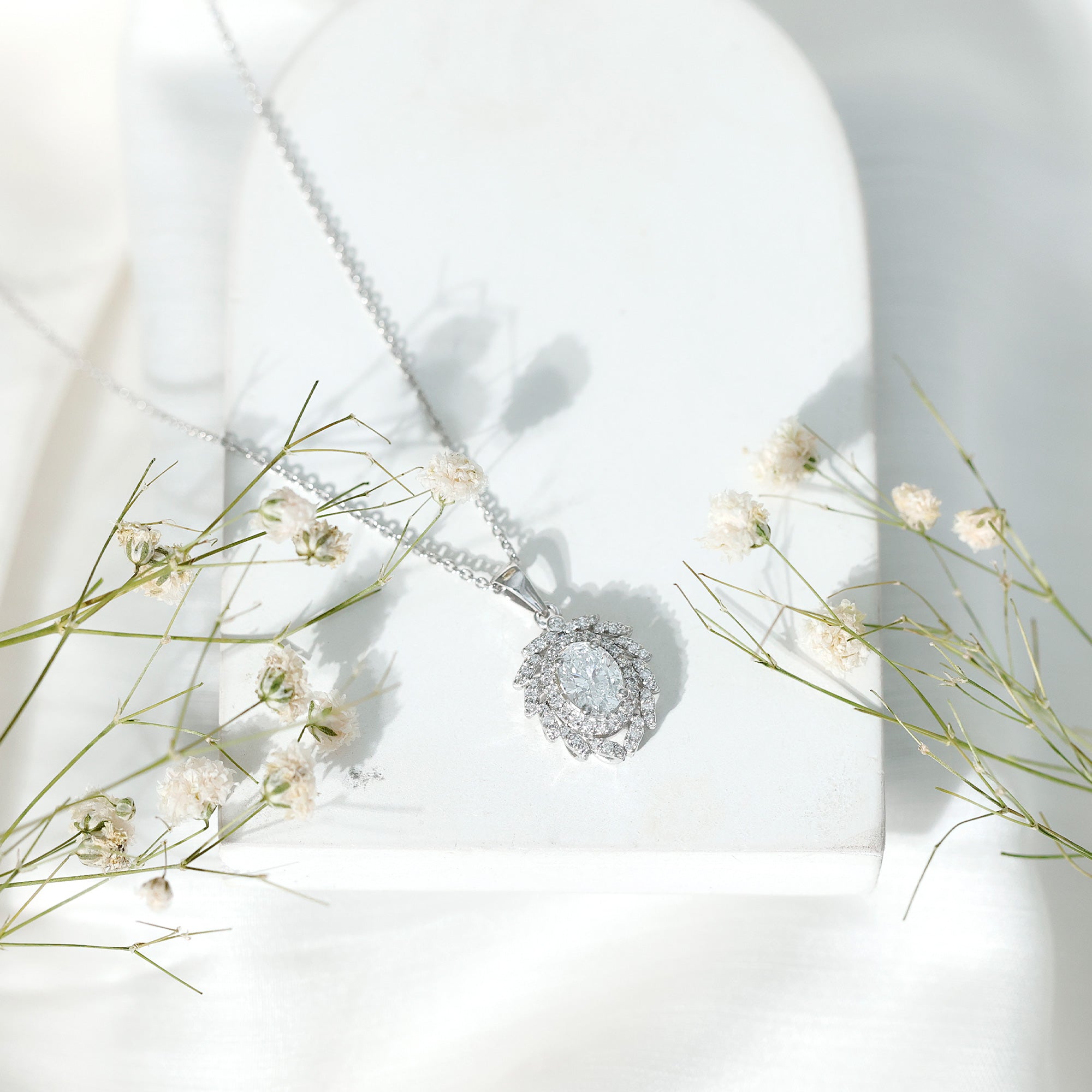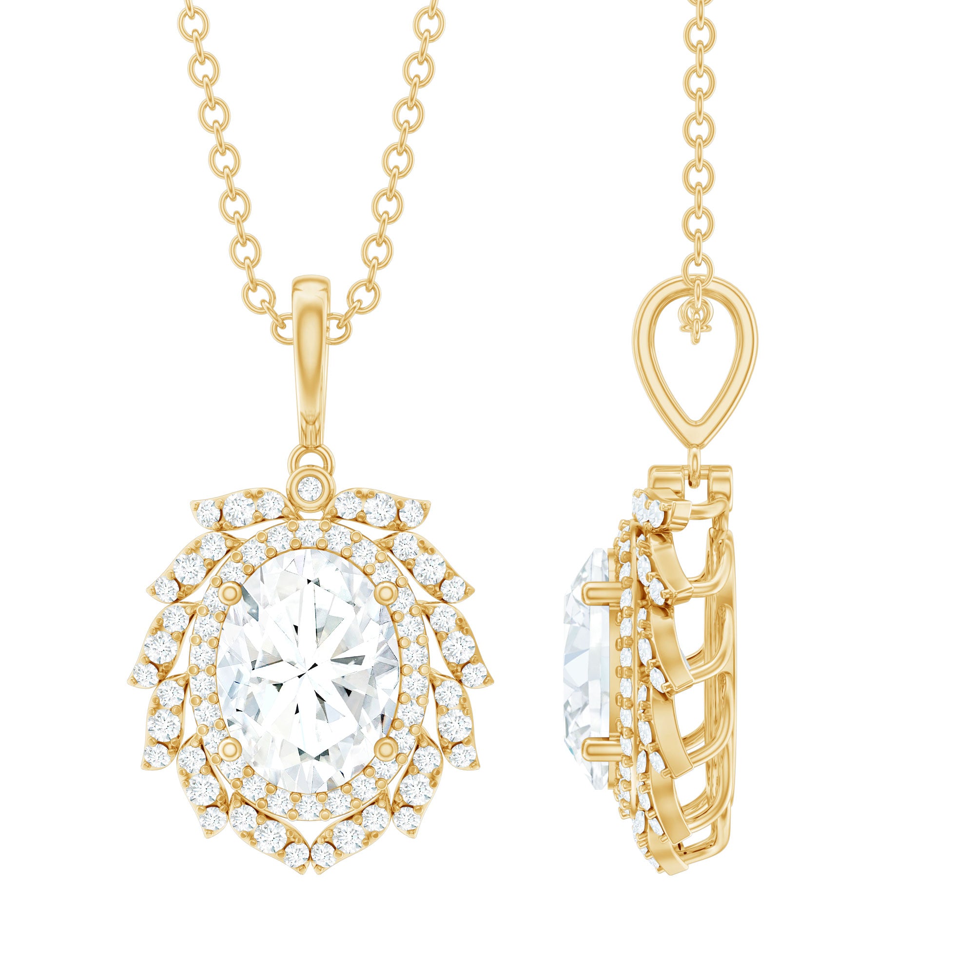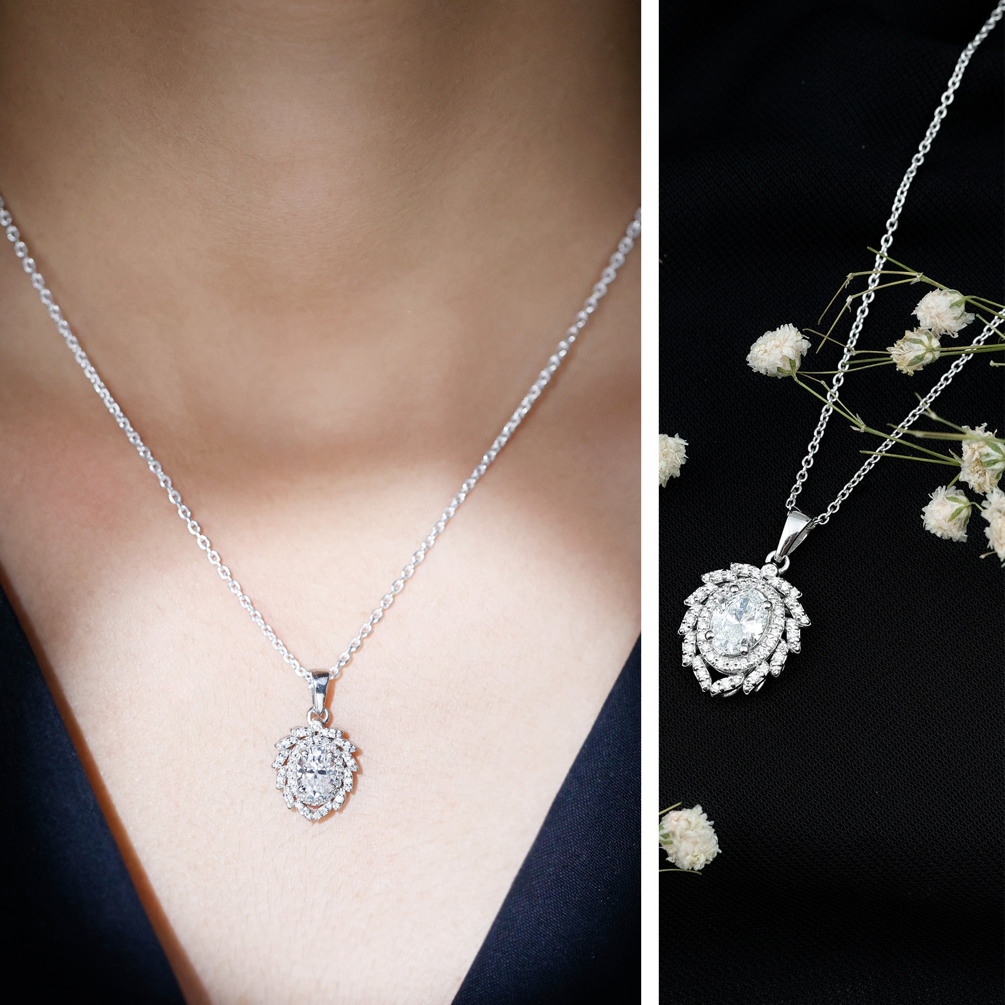 Bold, luxurious, and breathtakingly beautiful, this Diamond Antique Necklace is the ultimate expression of elegance. The centerpiece features a 6X8 MM oval shaped diamond of EF-VS Quality set in secure prong setting, radiating unmatched brilliance. Surrounding it are two diamond halos, the first one is simple, just framing the center stone with its sparkle while the second one resembles a blooming flower with meticulously placed round dainty diamonds over leaf-like metalworks. Each petal-like layer adds depth, sparkle, and grandeur, making this Oval Diamond Pendant Necklace a true showstopper. Hanging from a standard bail that seamlessly blends with the design, this floral Halo Pendant is a classic piece of jewelry.