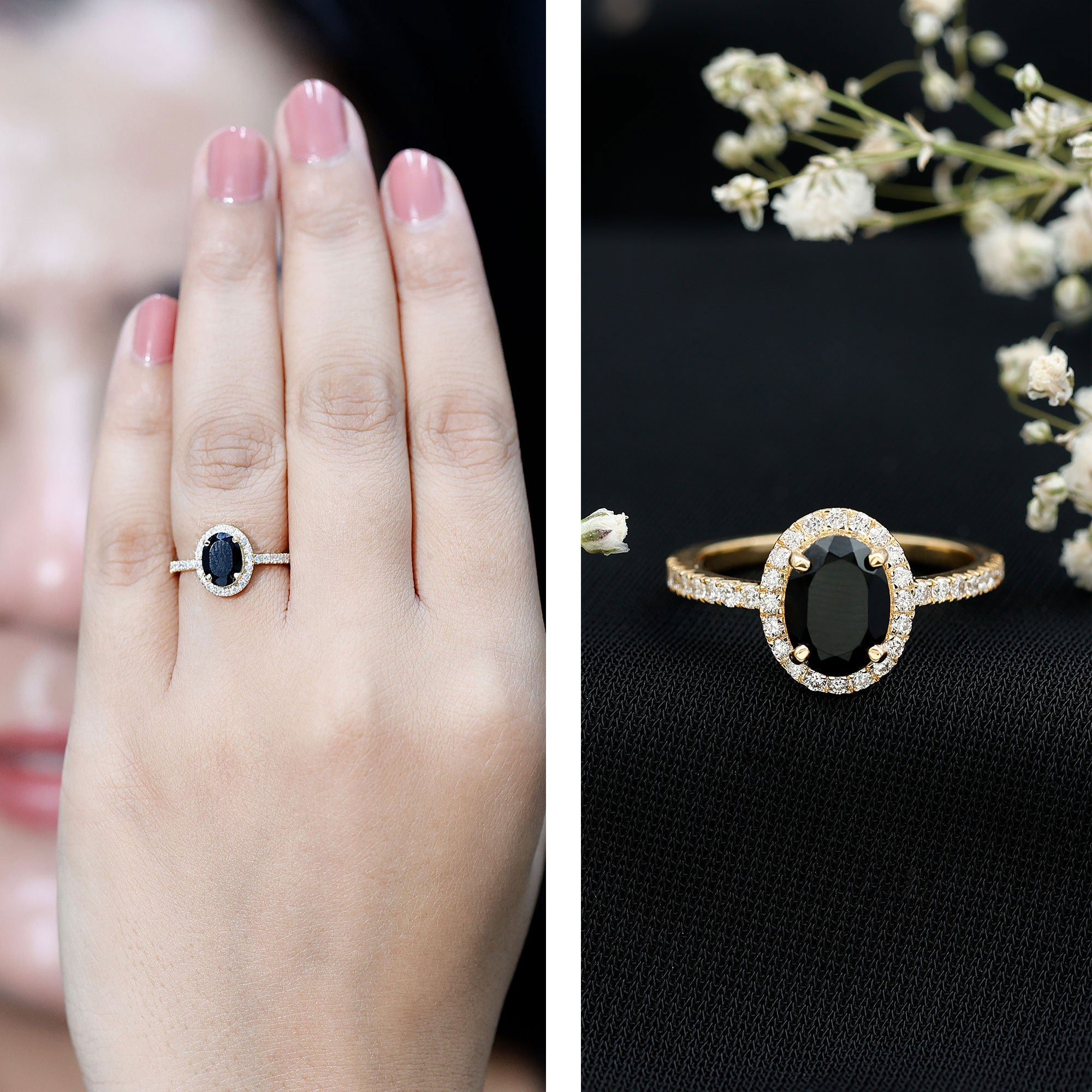This Oval Black Onyx Ring is designed for those who want something classic but with a modern design. At the center, you will find a stunning 6X8 MM oval cut black onyx securely set in strong claw setting and surrounded by a floating halo of sparkling round diamonds that add the perfect touch of shine. The diamond studded band continues the sparkle, making this Oval Shaped Engagement Ring glow from every angle. It is elegant, eye-catching, and totally unforgettable. The AAA quality black onyx gives the Halo Engagement Ring its bold and mysterious charm, while the HI-SI quality diamonds bring brilliant sparkle and lasting beauty. Whether you are marking a special moment, starting a new chapter, or simply love that black and white look, this Onyx and Diamond Engagement Ring is made to impress. It pairs bold style with timeless grace, perfect for someone who wants a ring that feels both chic and meaningful. This is not just another engagement ring. It is a symbol of love that is as fearless and one-of-a-kind as the person wearing it.