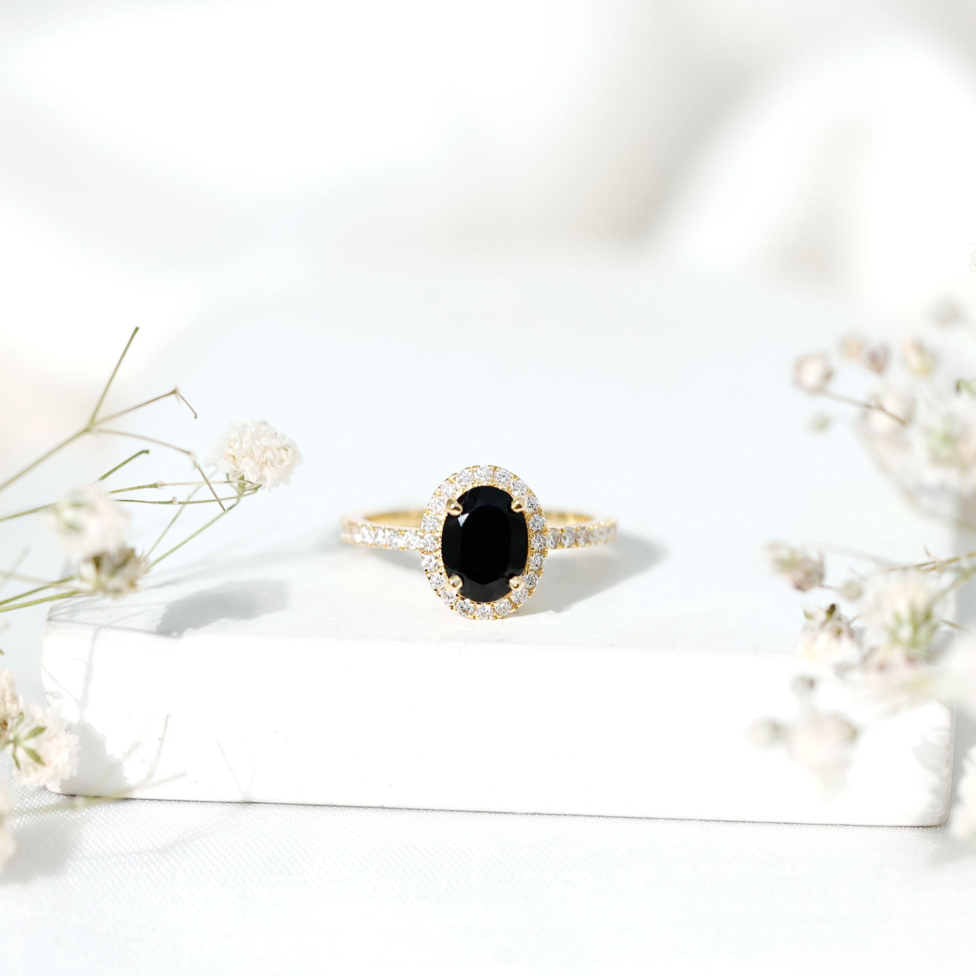 6X8MM Oval Black Onyx and Diamond Halo Engagement Ring