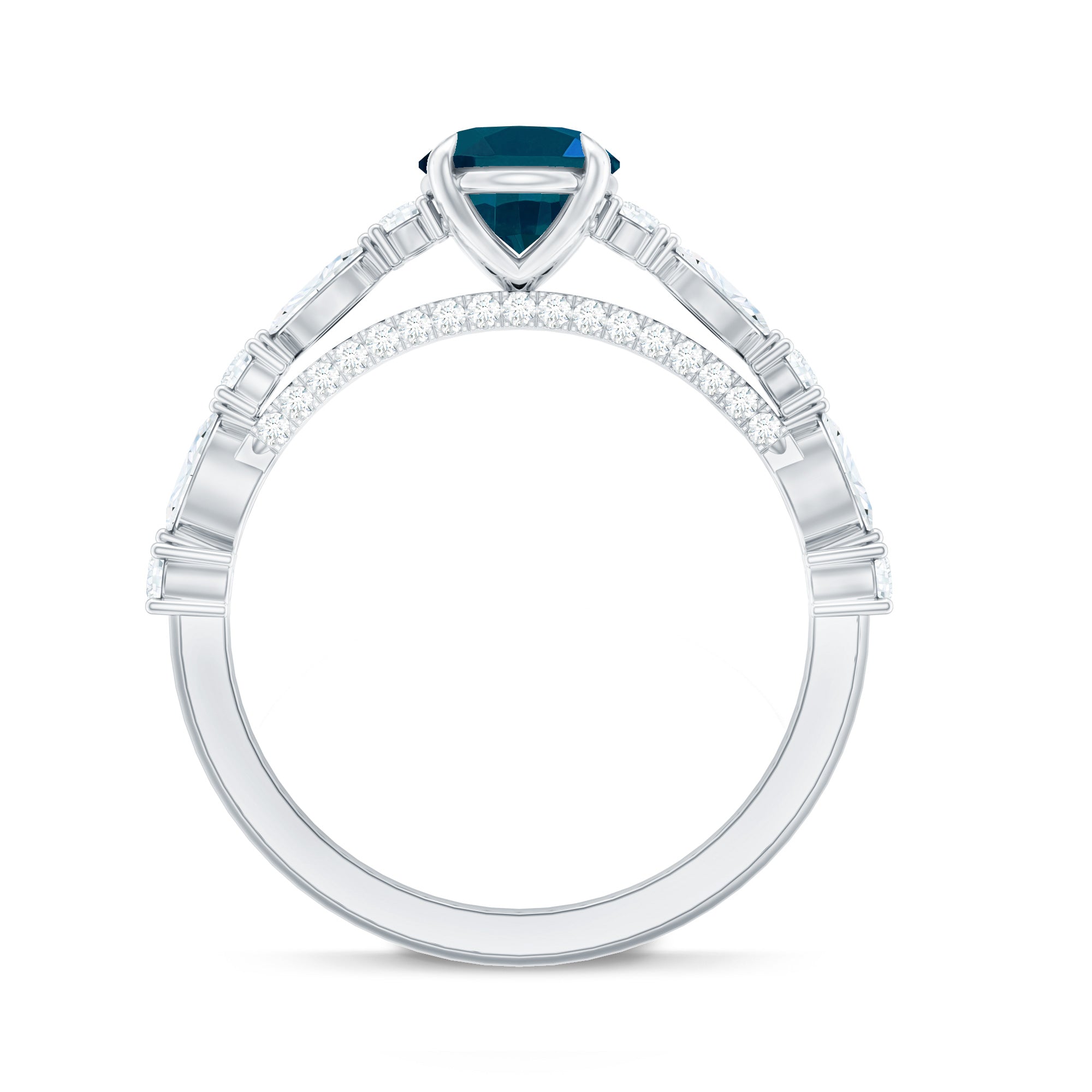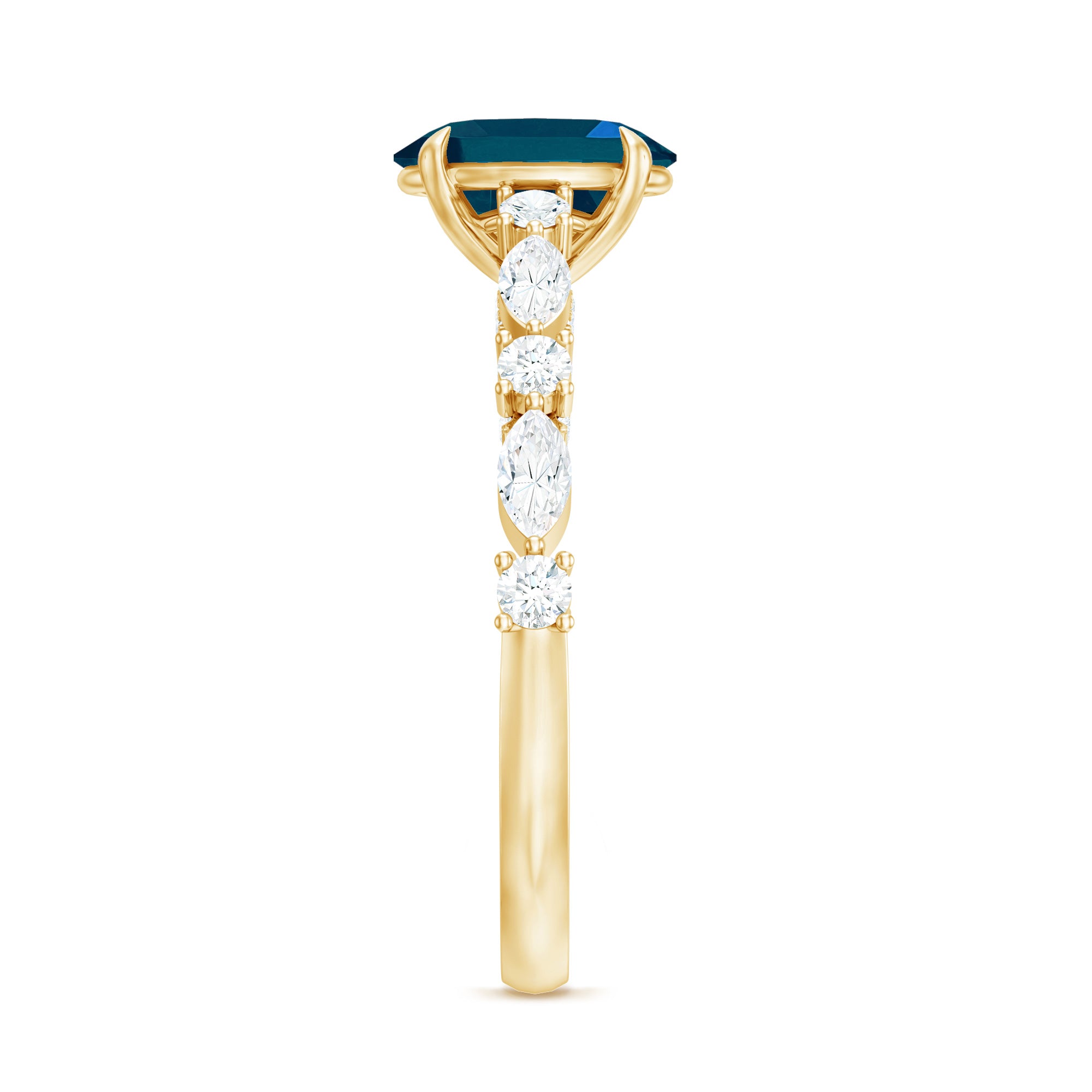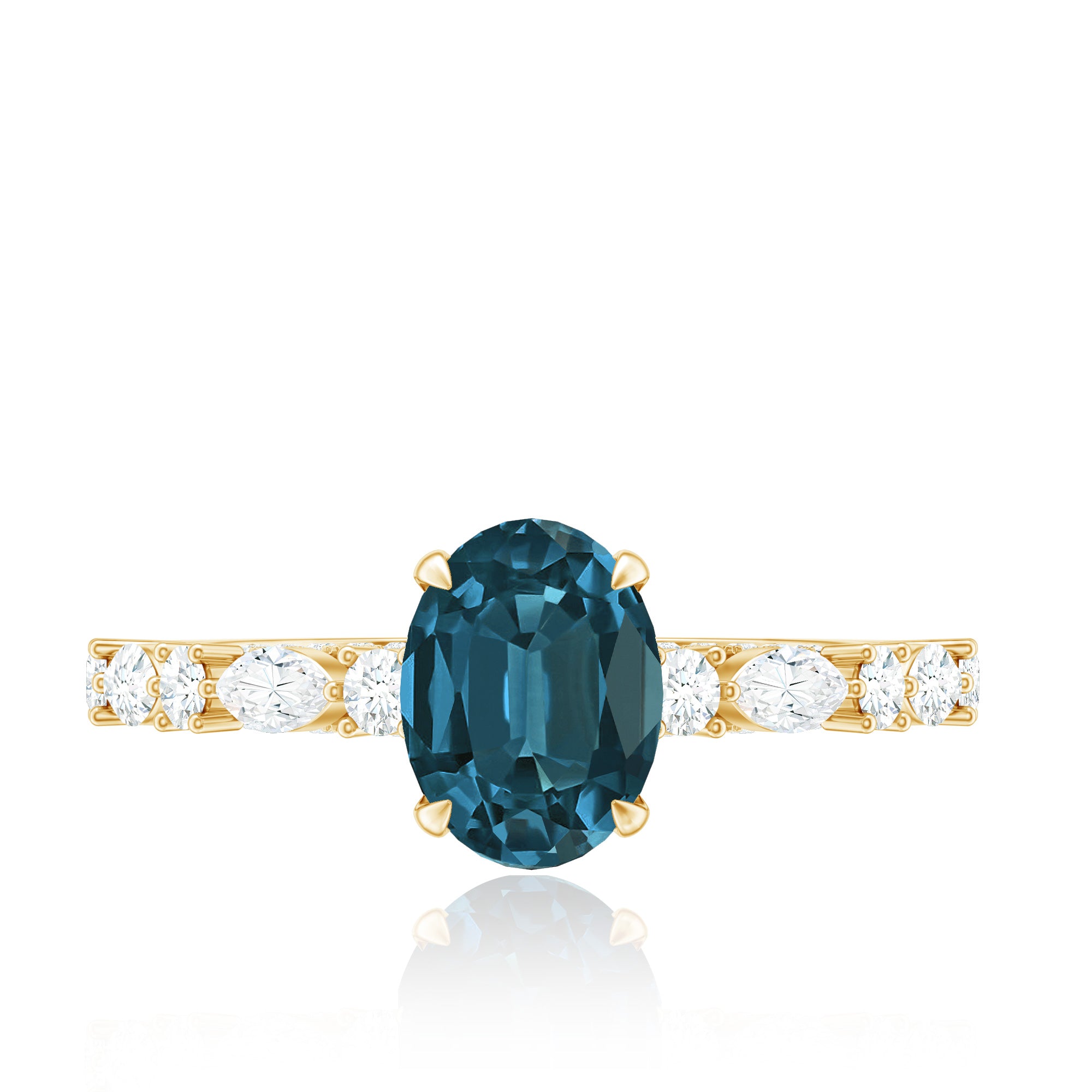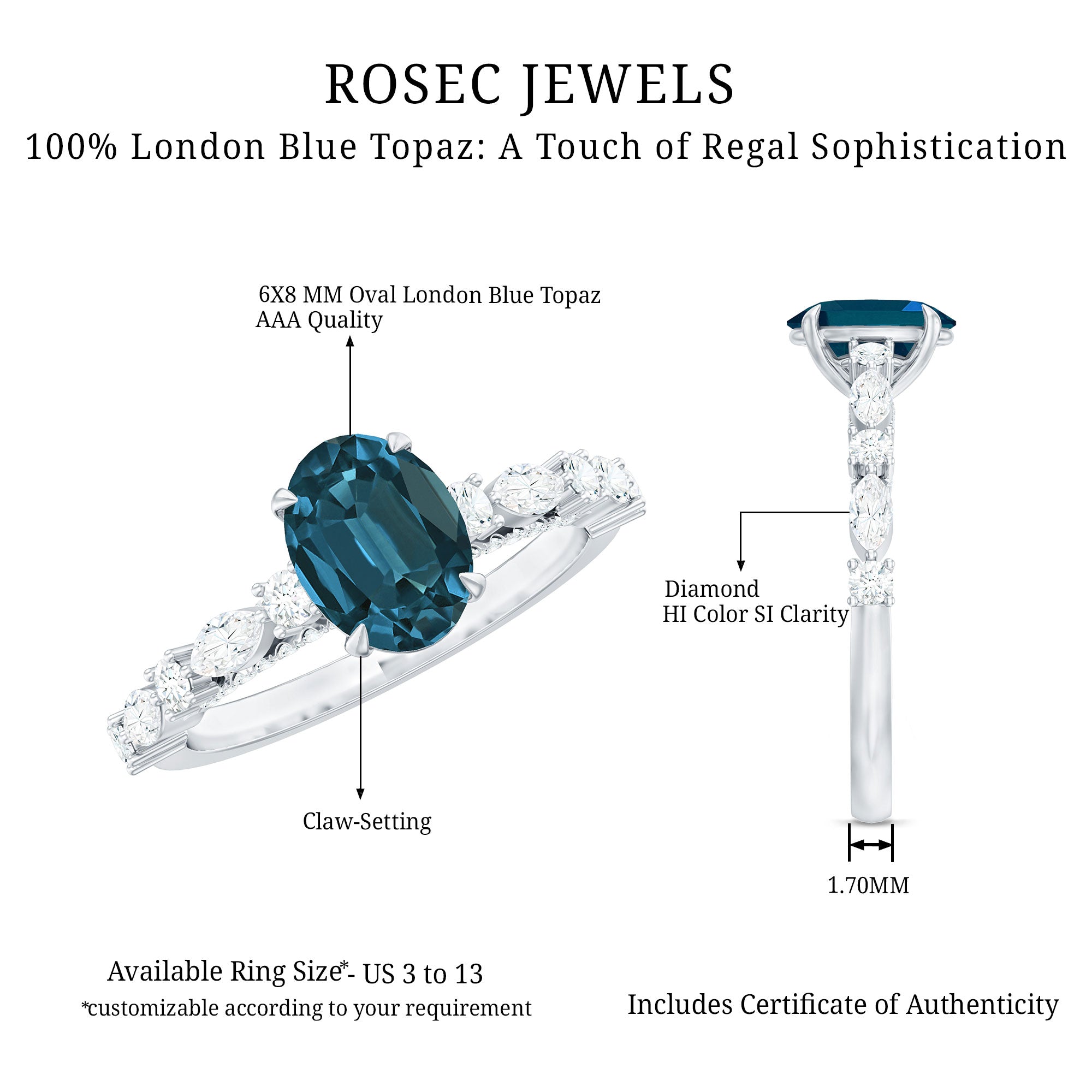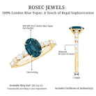 Although the future of the journey remains uncertain, this Solitaire Engagement Ring serves as a symbol of hope for your new beginning. It features an 6X8 MM oval cut London Blue Topaz at the center, set in a claw setting, complemented by round and marquise cut diamonds as side stones, which enhance the sparkle and emphasize the center stone. More than just a ring, it signifies a moment of brilliance. With AAA quality London Blue Topaz, this Vintage Engagement Ring effortlessly captures attention without the necessity for words. Much like your love story, this London Blue Topaz Engagement Ring symbolizes a unique combination of beauty and strength. The Oblong Engagement Ring presents an elevated appearance that draws the gaze of everyone in the room. The delicate diamond-studded bridge adds further brilliance and elegance to this luxurious piece. Celebrate the most significant moments of your life with a piece of fine jewelry that reflects your unique personality. This Engagement Ring with Side Stones is an exceptional choice that merges luxury, elegance, and modern ethics into one stunning design.