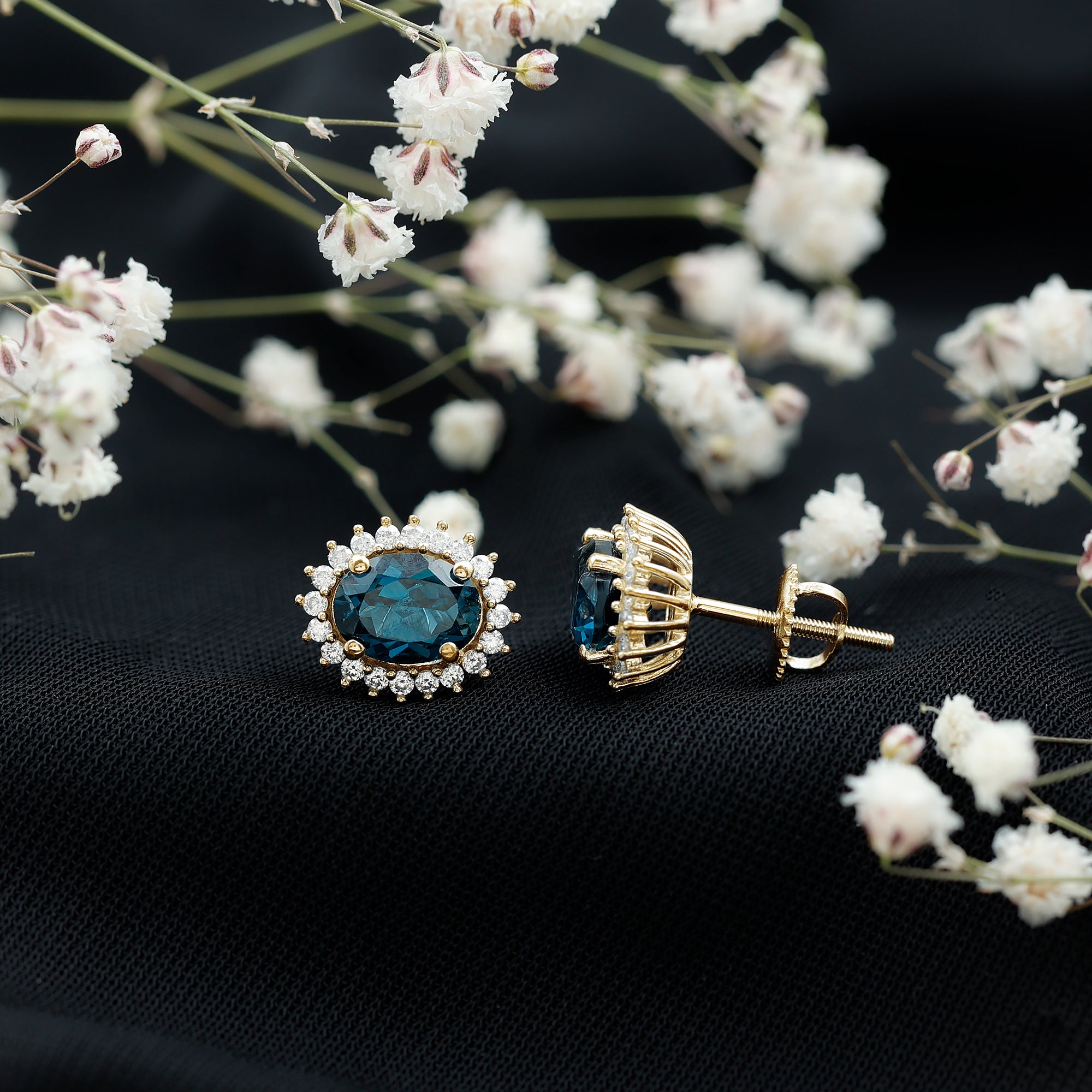 6X8MM Oval London Blue Topaz Stud Earrings with Moissanite Halo