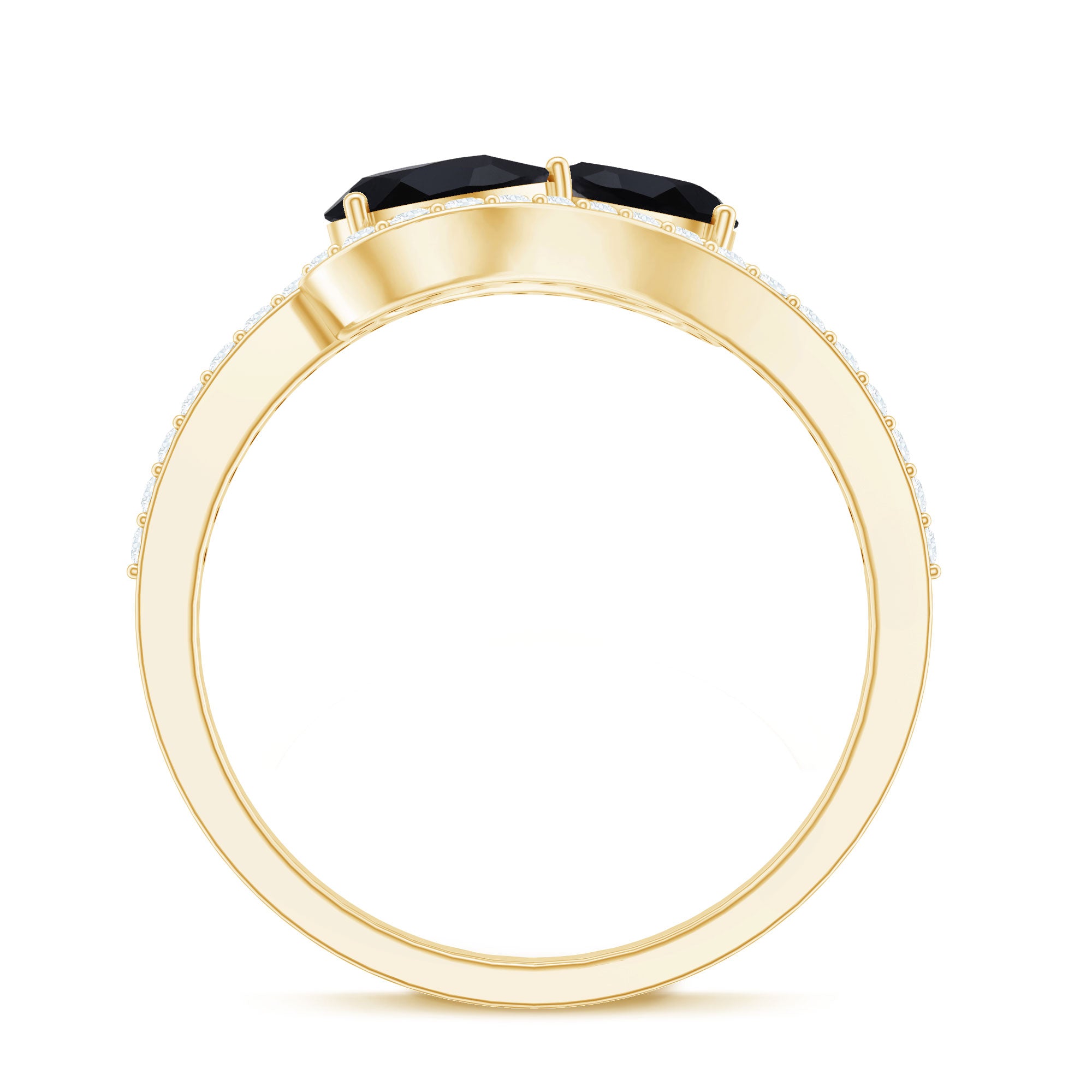 This vintage-inspired two-stone ring features two exquisite 6X8mm pear-cut Black Onyx stones, elegantly set in a prong setting over a bypass shank adorned with smaller diamond stones that enhance its sparkle and brilliance. The design of this Toi Moi ring is timeless, infused with a touch of old-world charm that remains perpetually fashionable. Crafted with meticulous attention to detail and utilizing only the highest quality materials, this Bypass Engagement ring serves as a perfect emblem of enduring love and commitment. Whether intended as an engagement ring or a gift for a special occasion, this ring is guaranteed to impress and bring joy. The elegant bypass shank, adorned with subtle moissanite details, introduces a contemporary flair and symbolizes the beautiful intertwining of two lives as they progress together as one. This Two Stone Engagement Ring transcends mere adornment; it commemorates the bond and chemistry shared, meticulously designed to celebrate your distinctive love narrative. Delivered in a sophisticated signature jewelry box and offered in multiple sizes, this Real Onyx Ring for Women is tailored for a perfect fit, ensuring your memorable occasion is truly unforgettable. Its eye-catching design sparks conversations and infuses a touch of enchantment into any proposal or significant celebration.