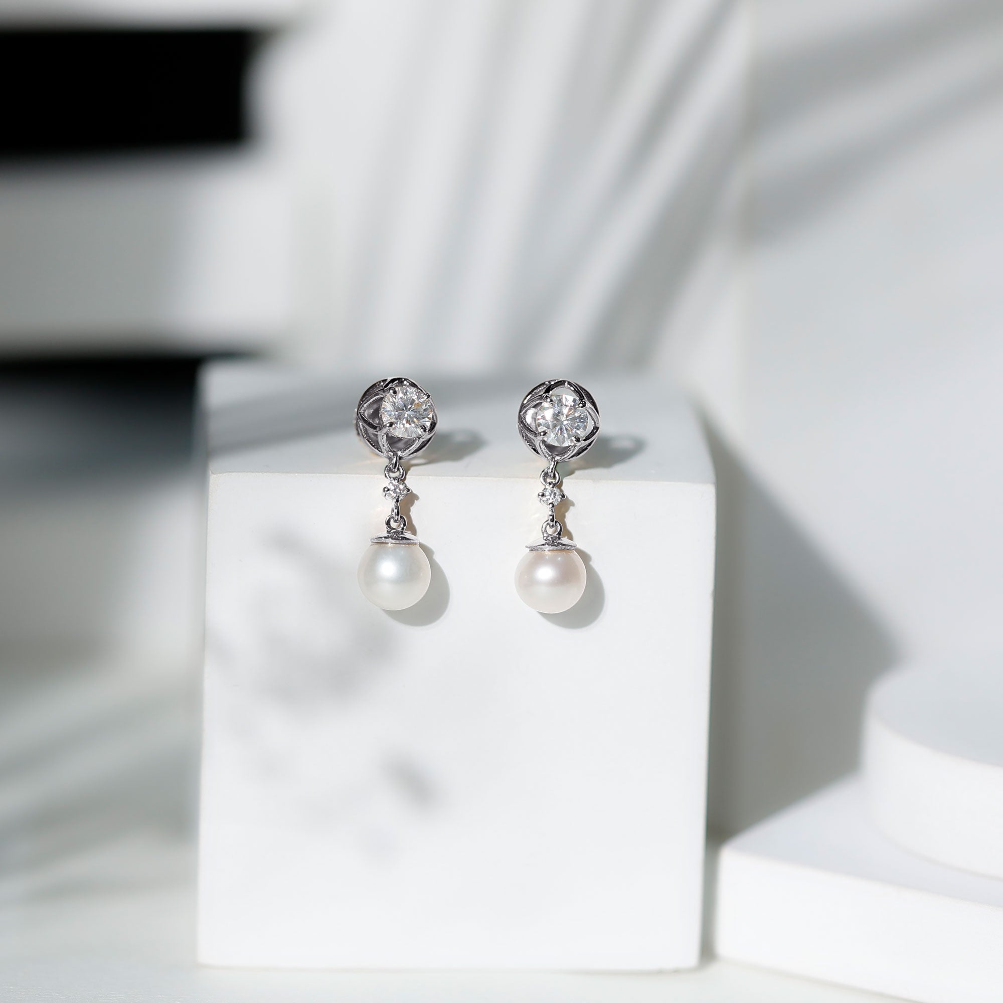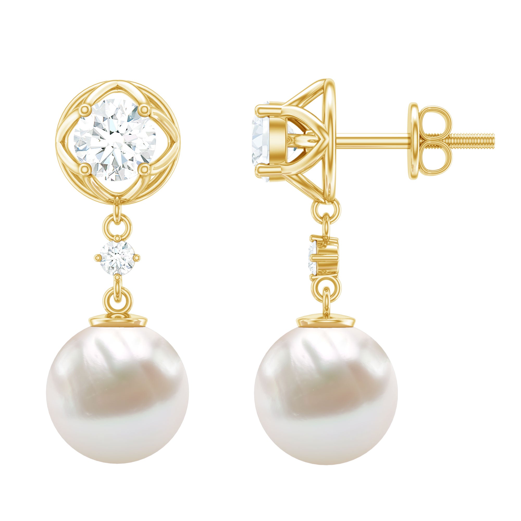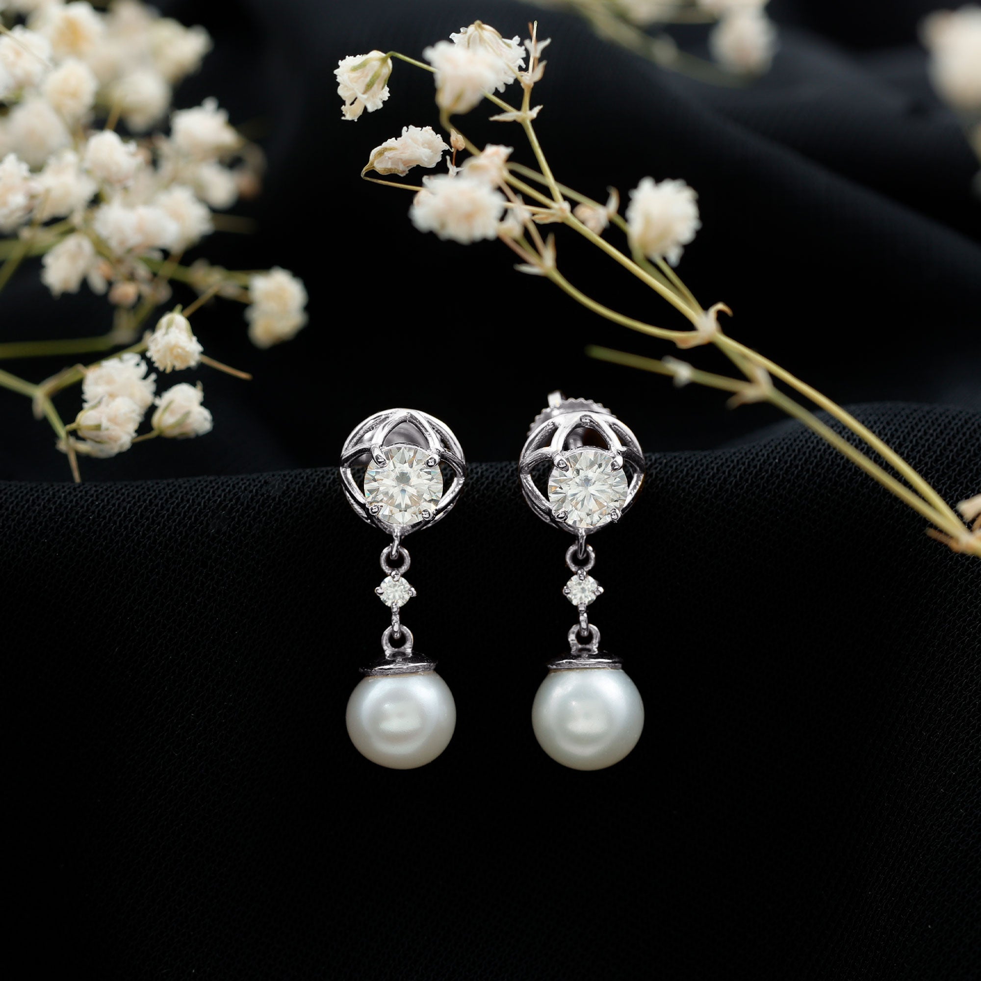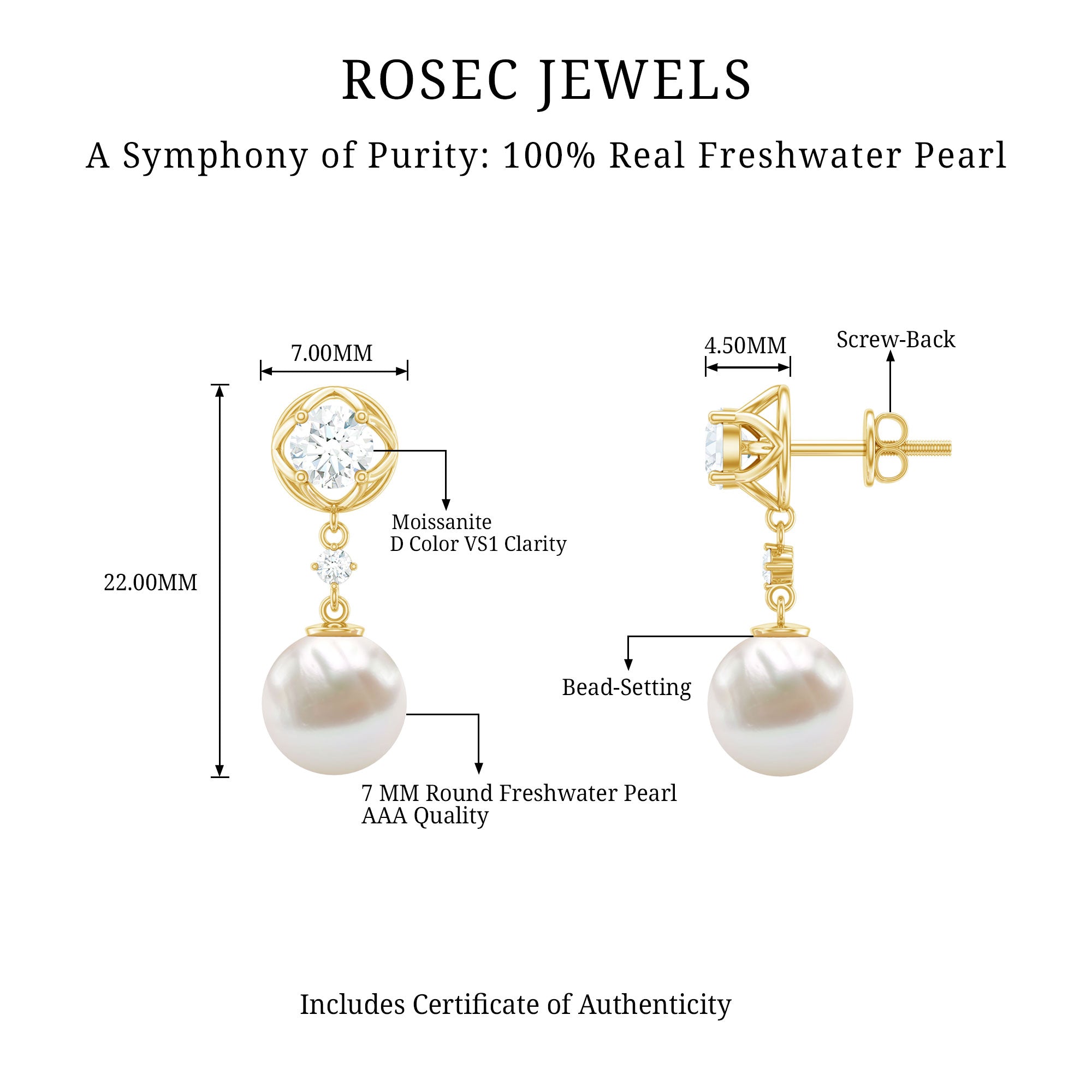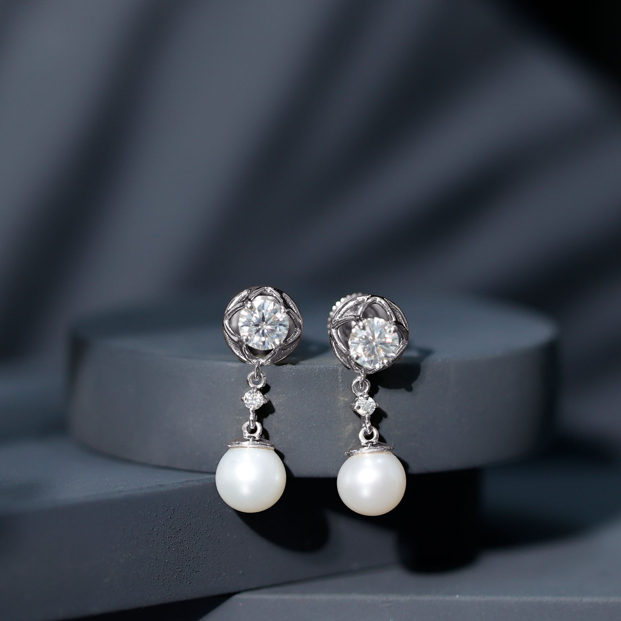 7 CT Freshwater Pearl Dangle Drop Earrings with Floral Moissanite
