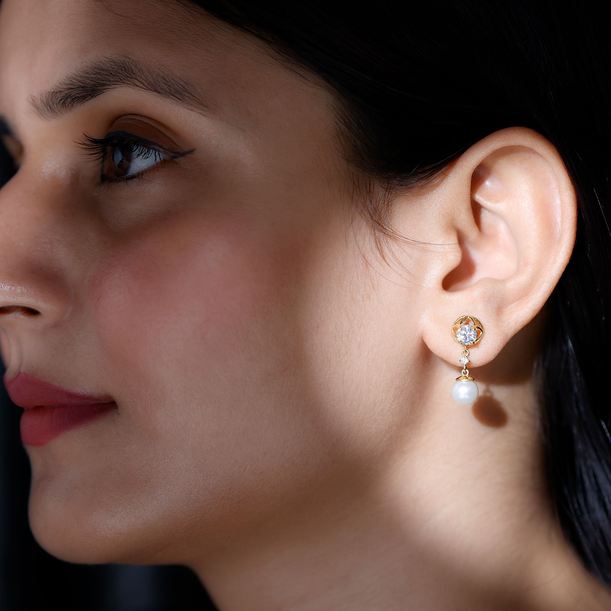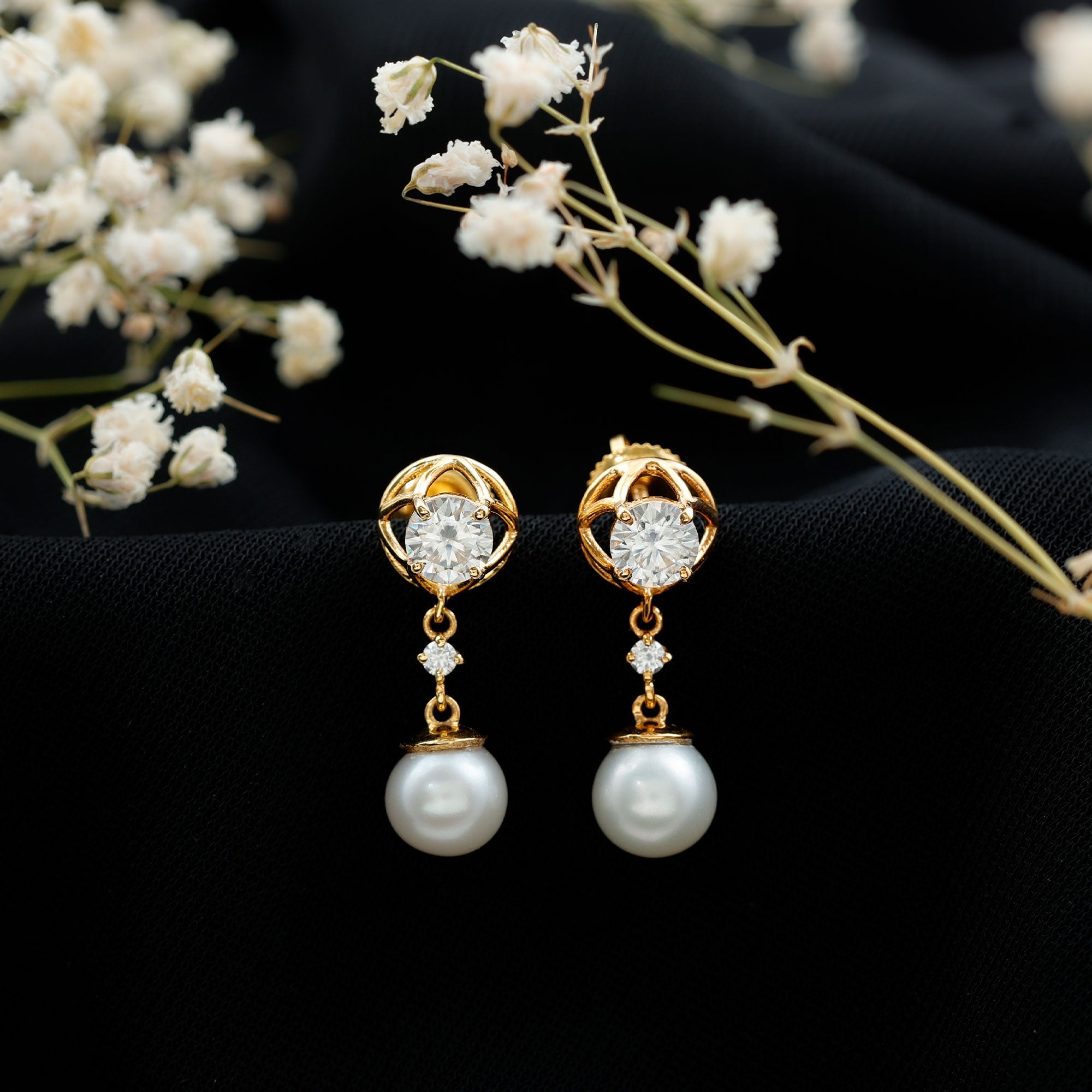 Elevate your style with these enchanting Freshwater Pearl Earrings. Featuring lustrous Freshwater Pearl and Moissanite set in a dazzling prong setting, these earrings exude a captivating charm. The elegant Dangle Drop design adds an extra touch of sophistication, making them the perfect accessory to enhance your look. Skillfully crafted in Solid Gold, these Pearl Dangle Drop Earrings are the epitome of timeless elegance and are sure to showcase your unique style.