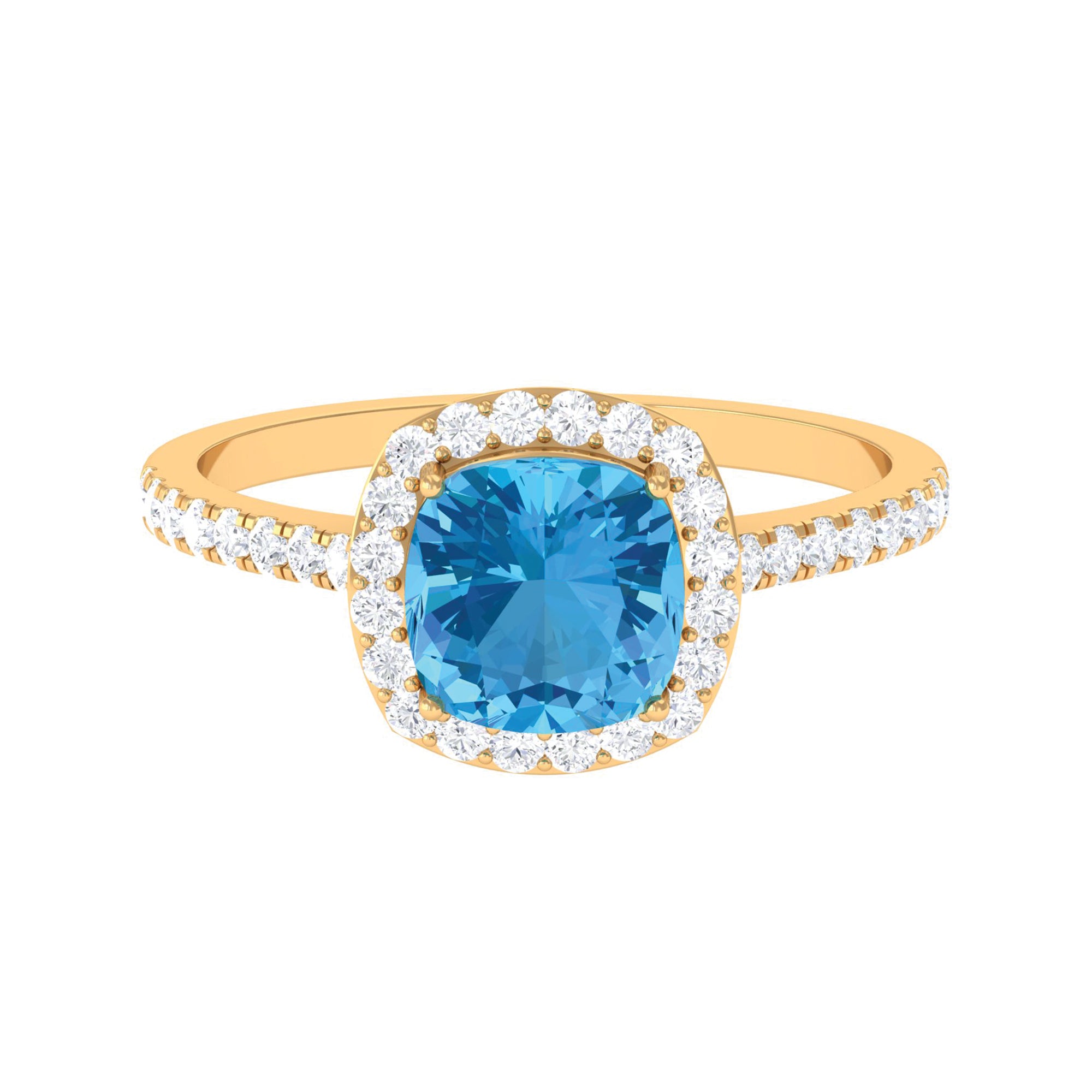 7 MM Cushion Cut Swiss Blue Topaz Solitaire with Diamond Halo Ring