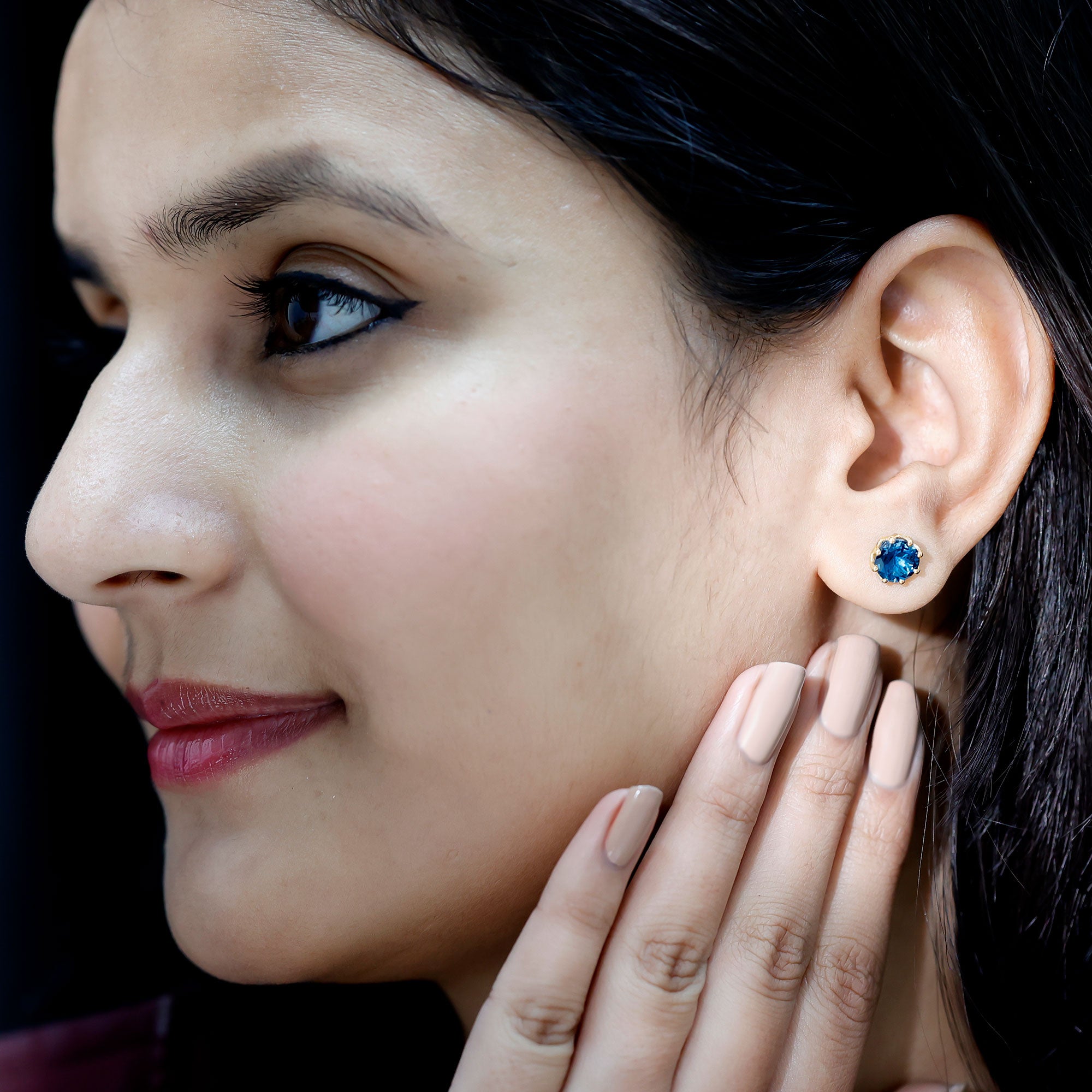 This Solitaire Floral Earring is studded with a Round Shape London Blue Topaz as Solitaire in Floral Setting. This Solitaire Stud Earring is an ideal piece of Fine Jewelry for simple and subtle looks.