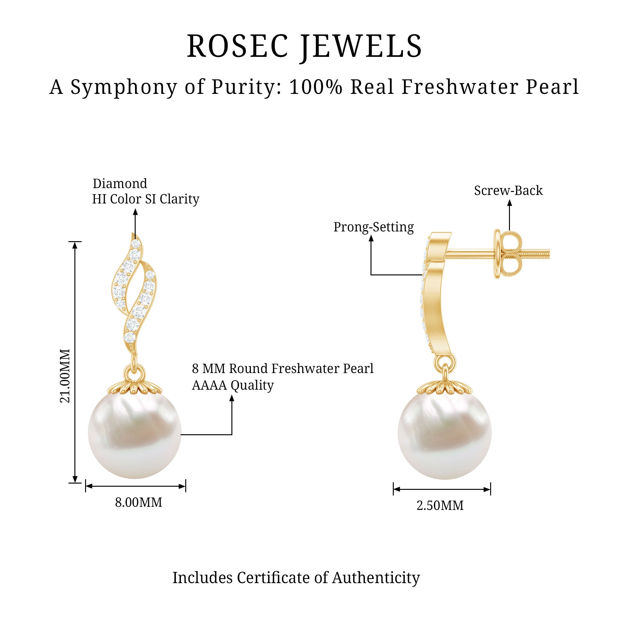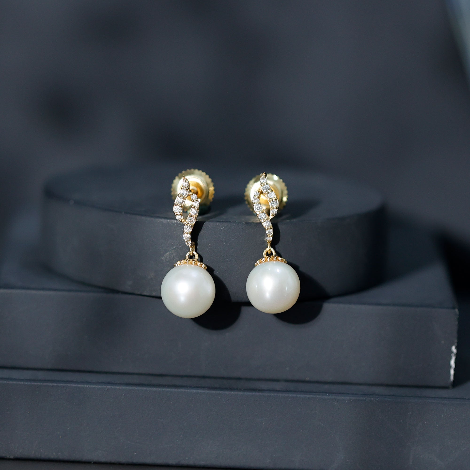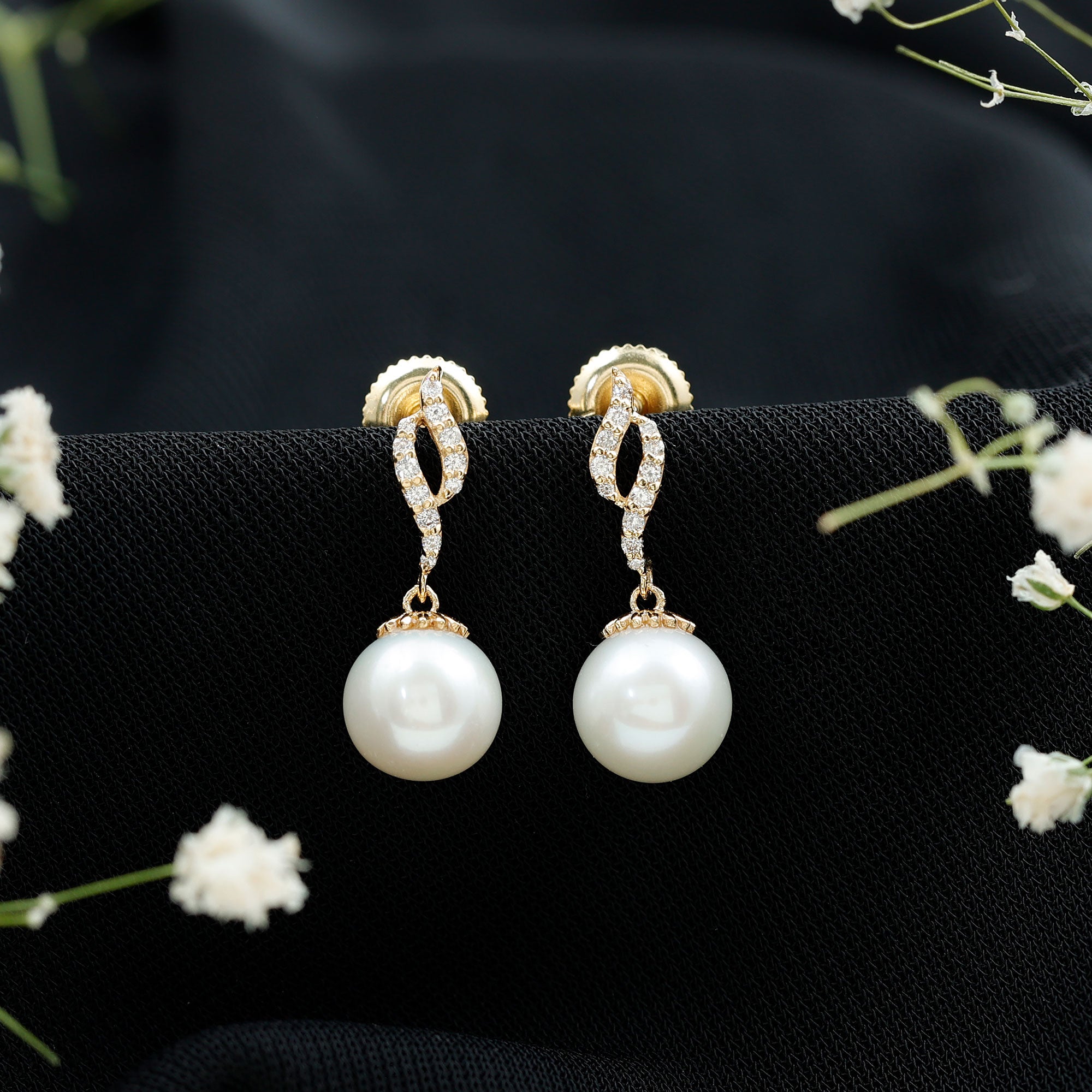 The charming pair of Drop Earrings feature Round Diamonds and 8 MM Round Shape Freshwater Pearl as Drop in Bead Setting. The Bridal Earrings are a perfect Wedding Day gift for your beloved.