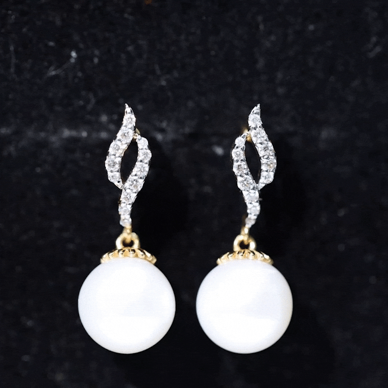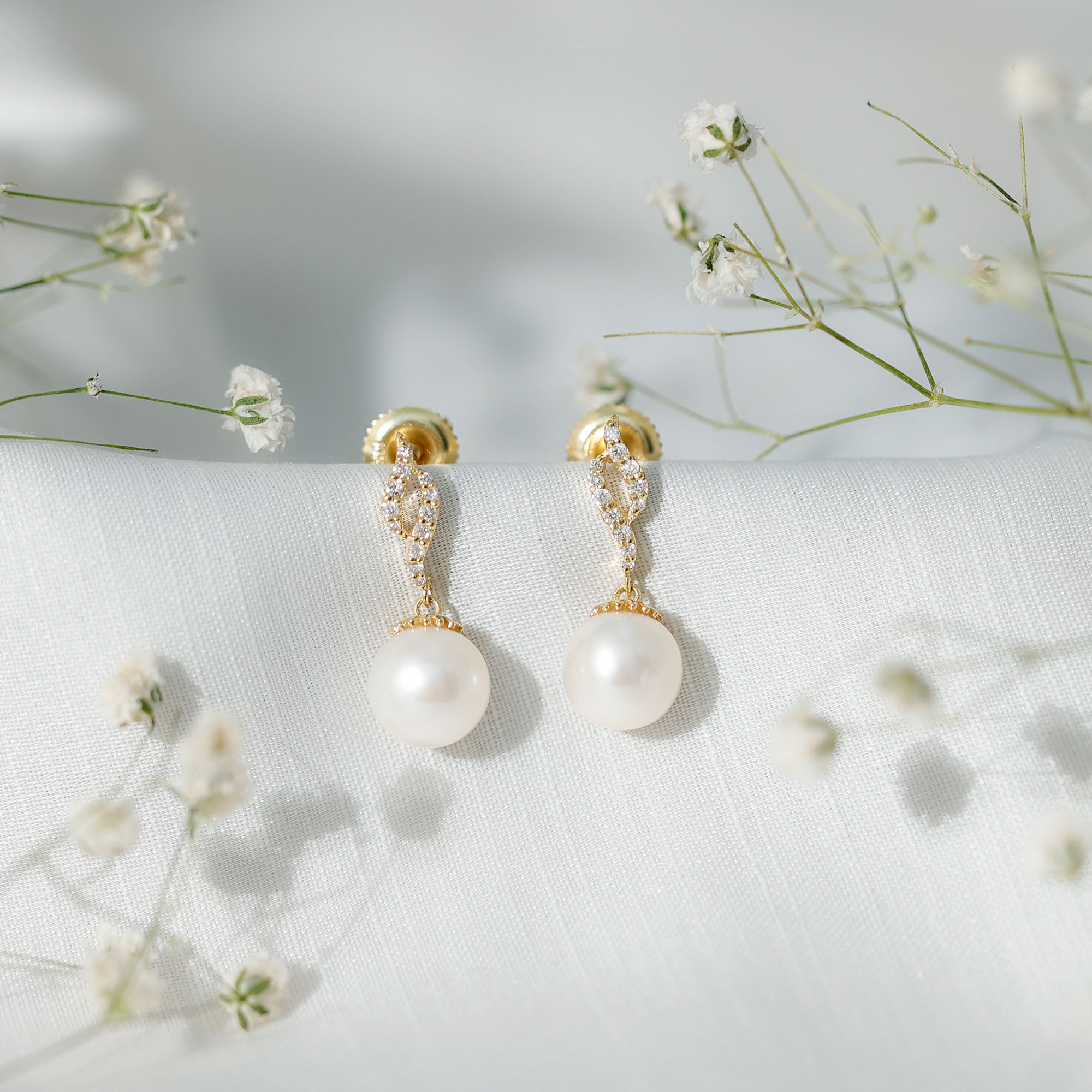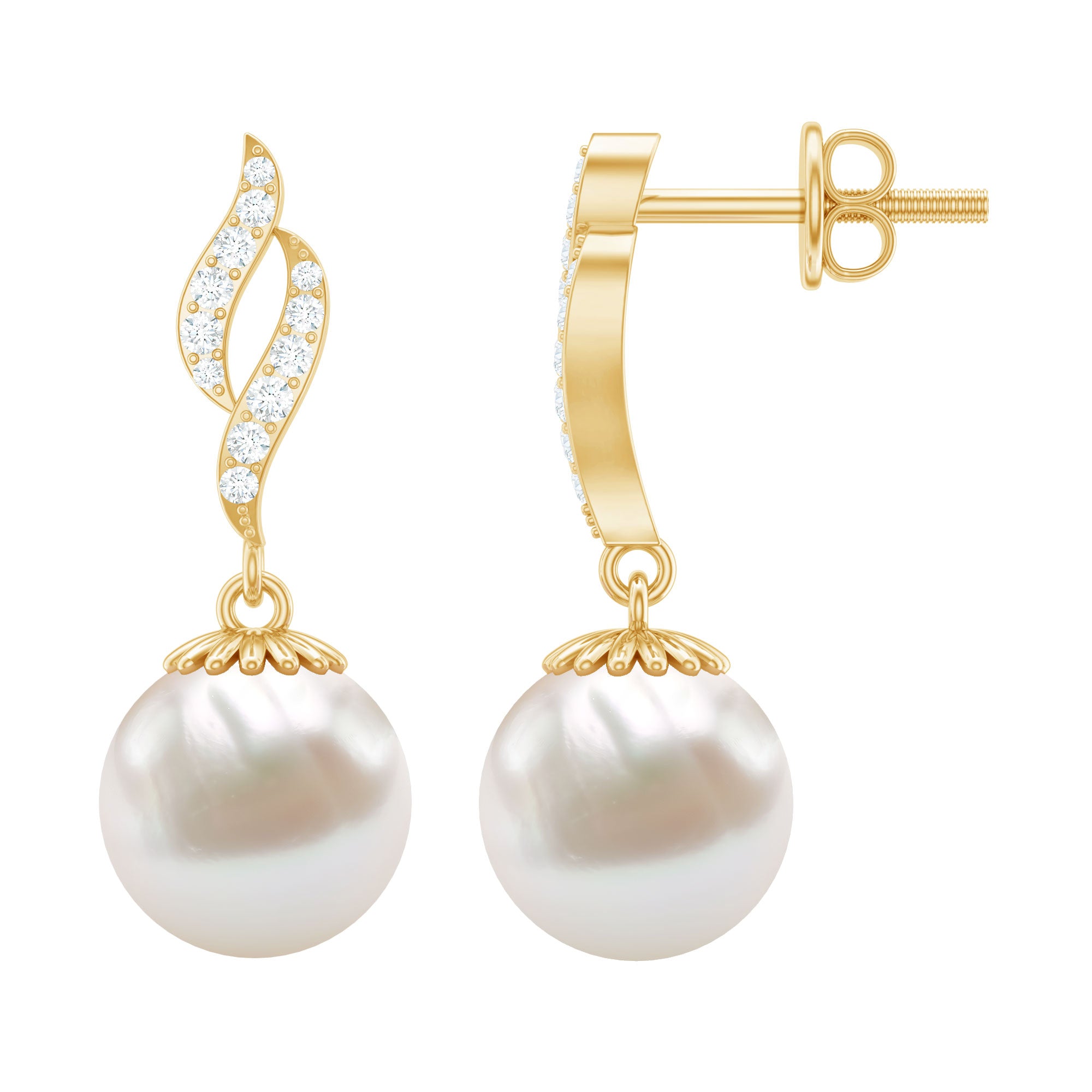 The charming pair of Drop Earrings feature Round Diamonds and 8 MM Round Shape Freshwater Pearl as Drop in Bead Setting. The Bridal Earrings are a perfect Wedding Day gift for your beloved.