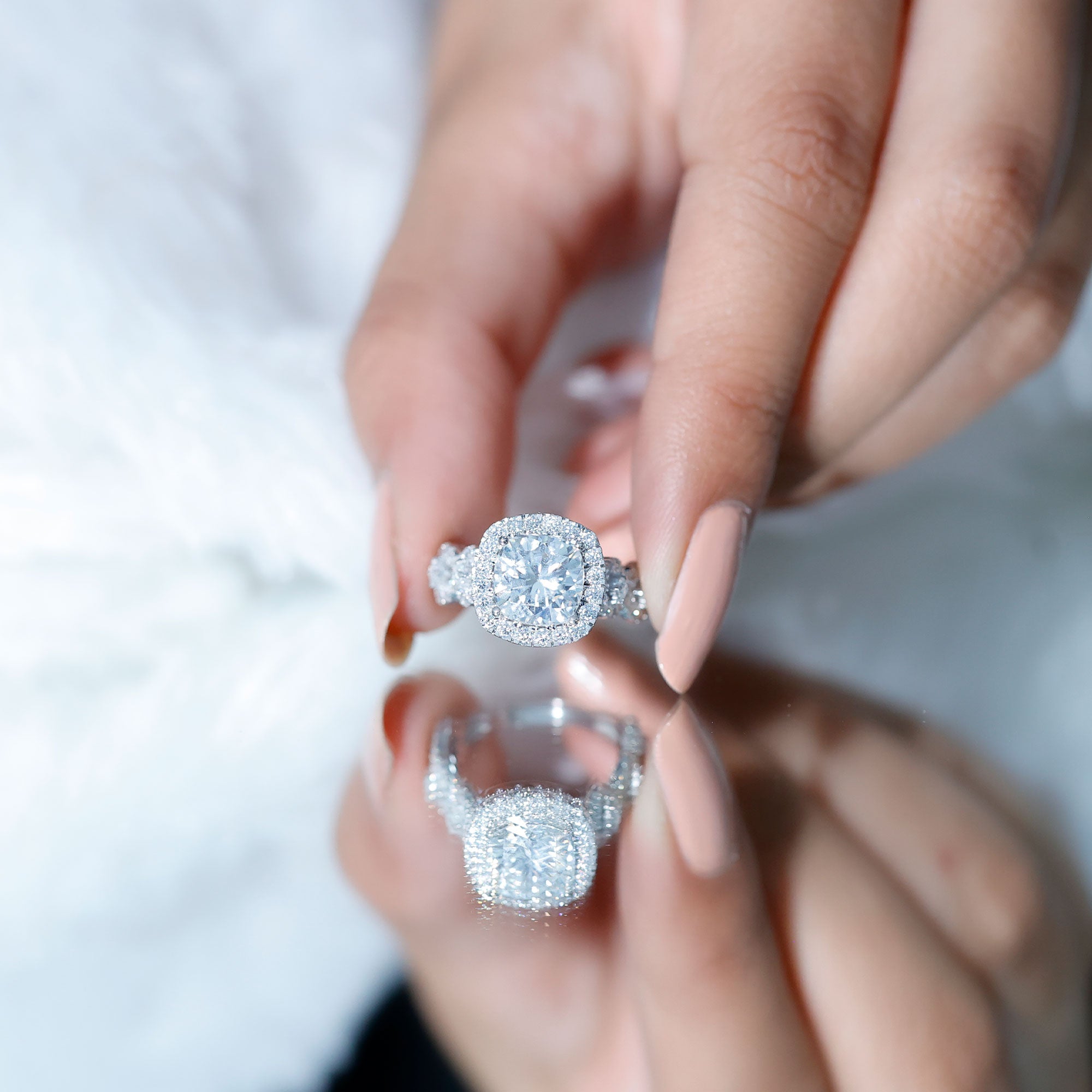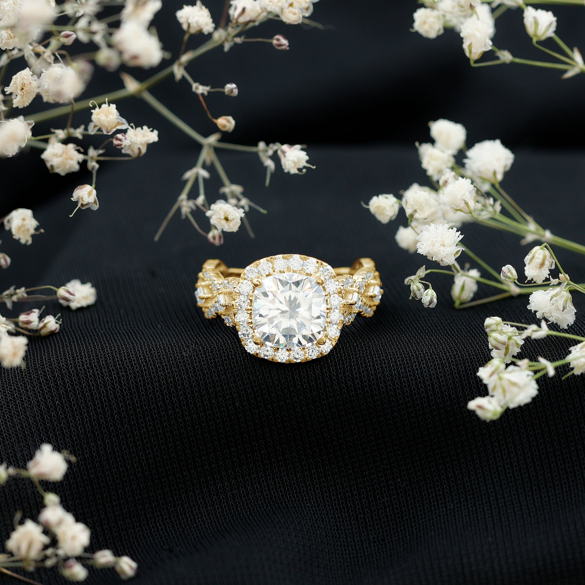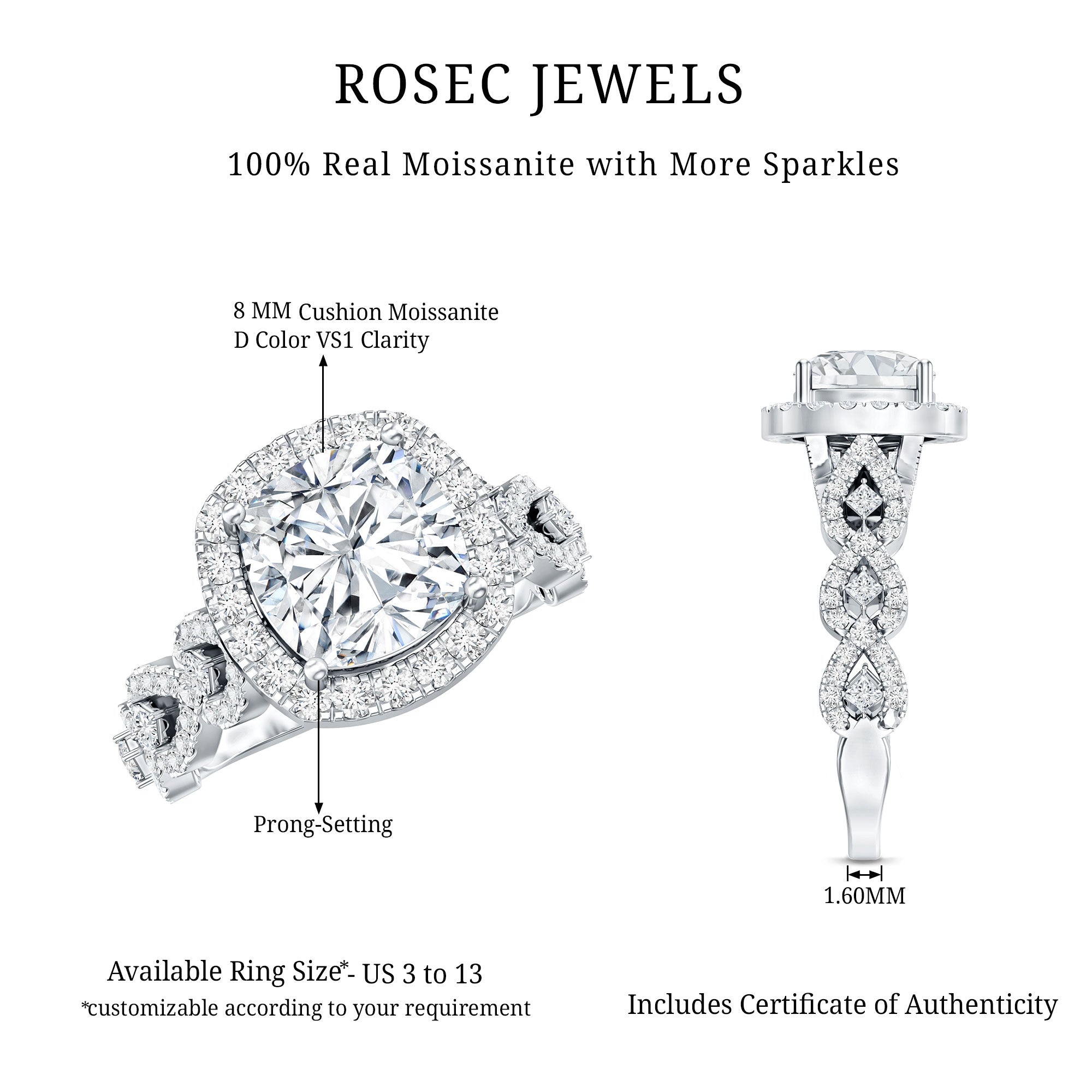 Looking for a perfect ring for the big day, here we got you covered with this Moissanite Engagement Ring precisely designed for your special one. The Ring features an 8 MM Cushion Cut Moissanite delicately placed in Prong Setting encircled by the Petite Moissanite Halo. The band of the ring is adorned with petite moissanite which makes it perfect for the big day. This Vintage Inspired Ring beholds the shine of D-VS1 Quality Moissanite that adds a touch of shimmer and sophistication. This Cushion Engagement Ring is perfect to complement the vibe of the special day.