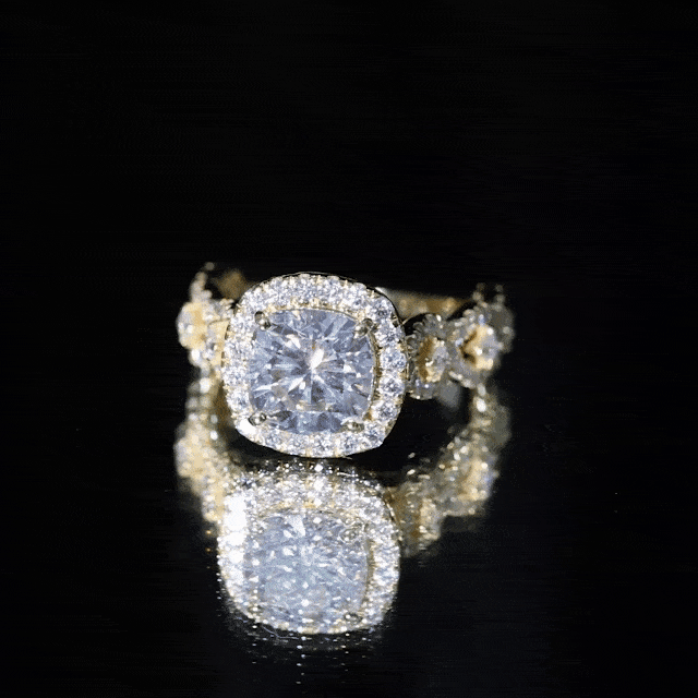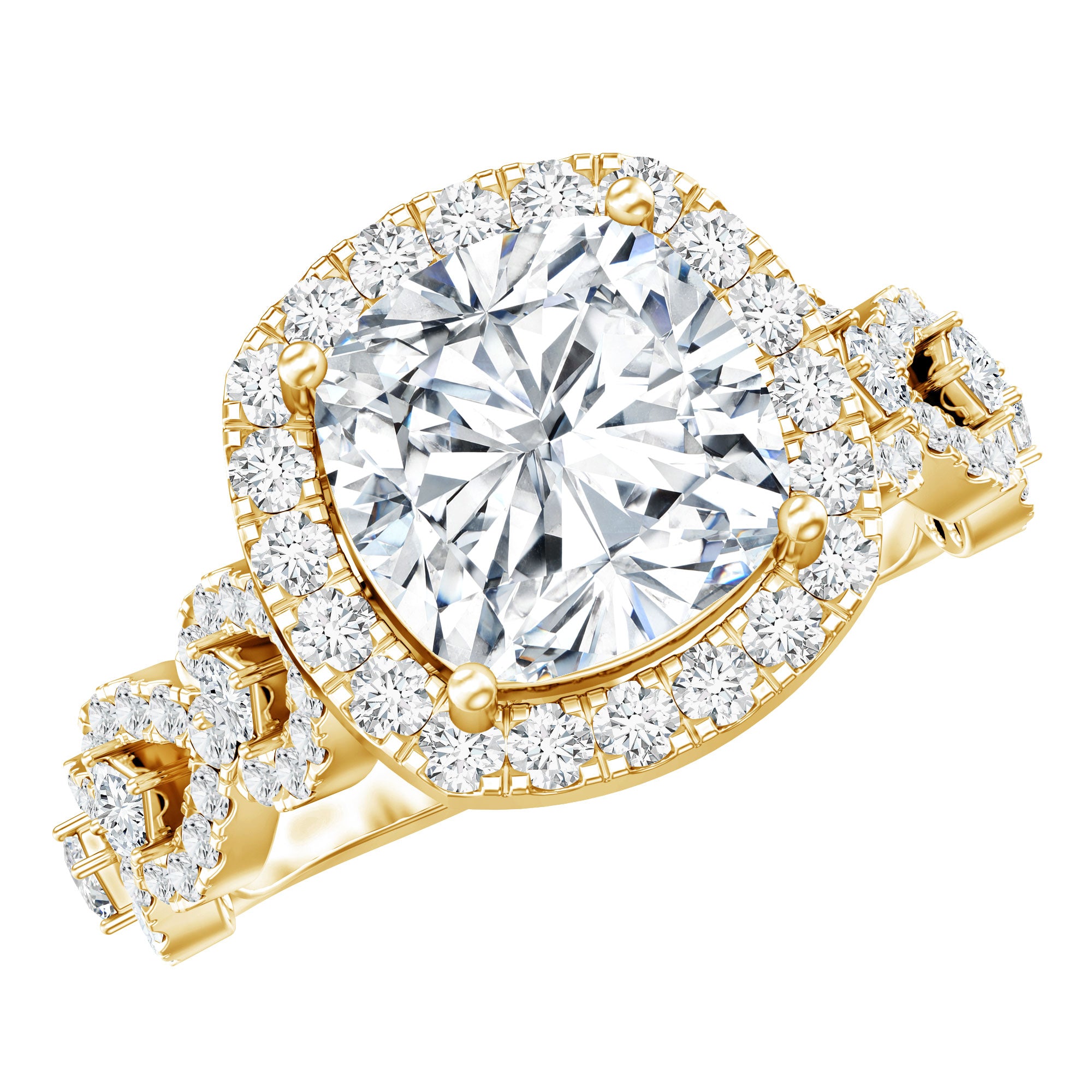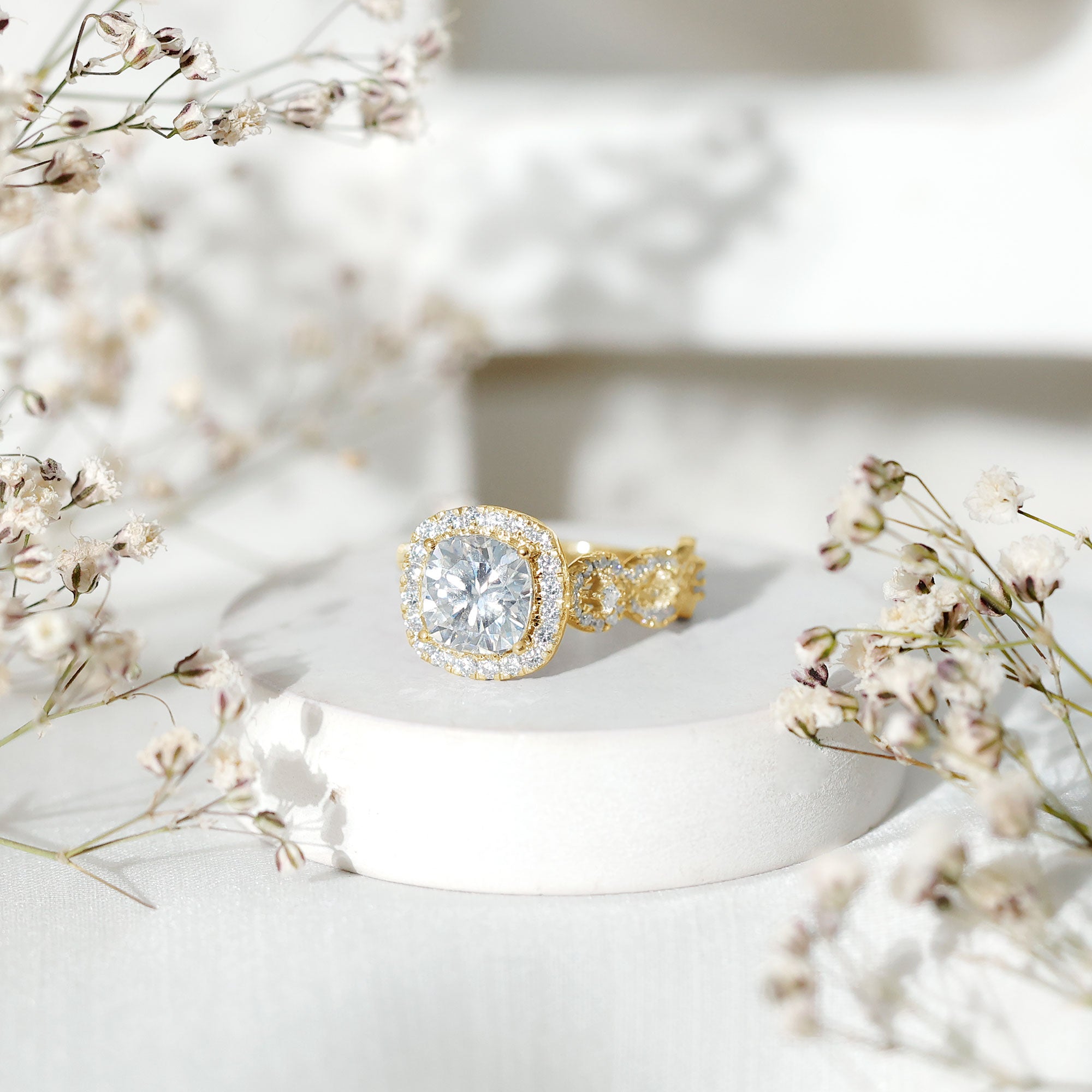 Looking for a perfect ring for the big day, here we got you covered with this Moissanite Engagement Ring precisely designed for your special one. The Ring features an 8 MM Cushion Cut Moissanite delicately placed in Prong Setting encircled by the Petite Moissanite Halo. The band of the ring is adorned with petite moissanite which makes it perfect for the big day. This Vintage Inspired Ring beholds the shine of D-VS1 Quality Moissanite that adds a touch of shimmer and sophistication. This Cushion Engagement Ring is perfect to complement the vibe of the special day.